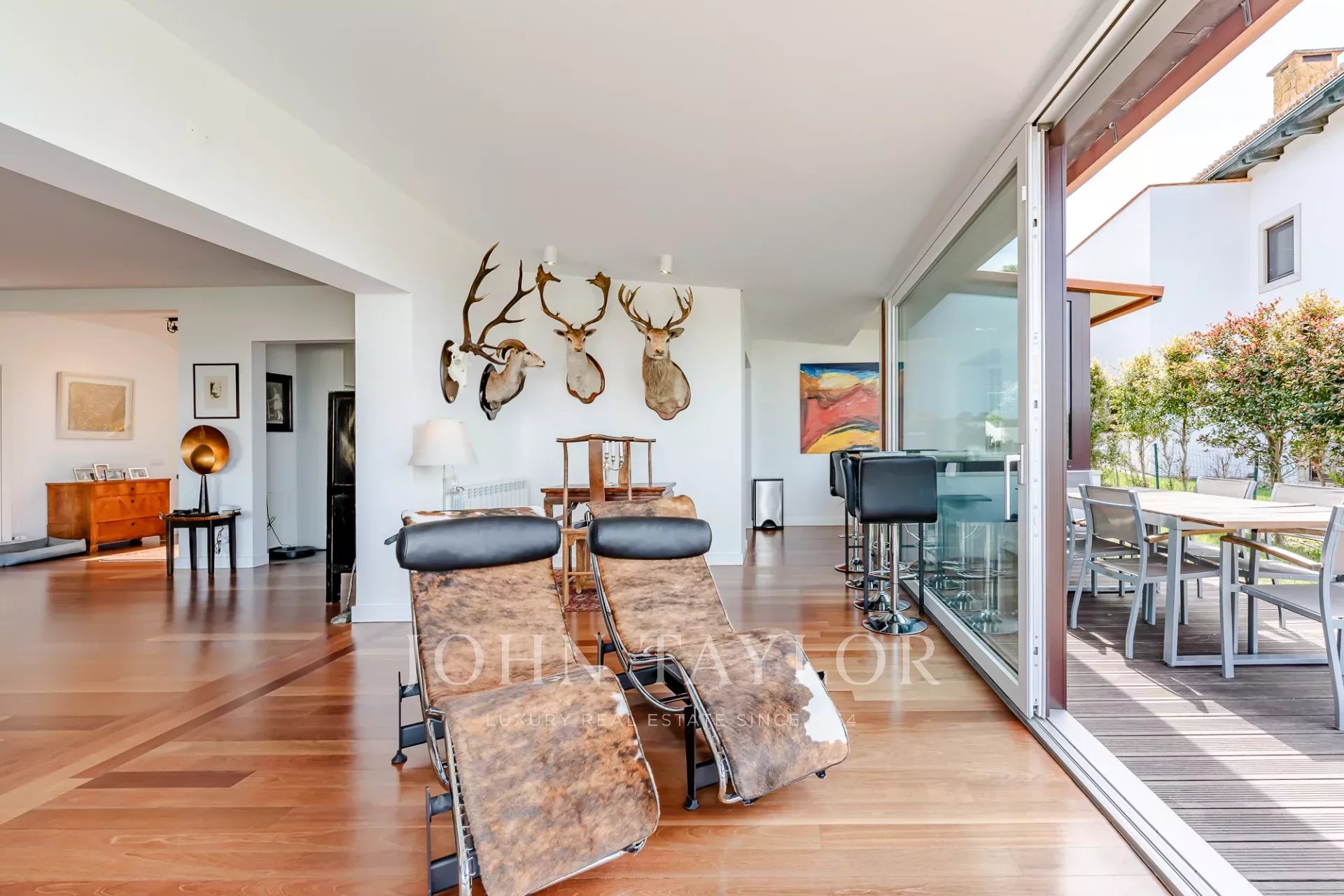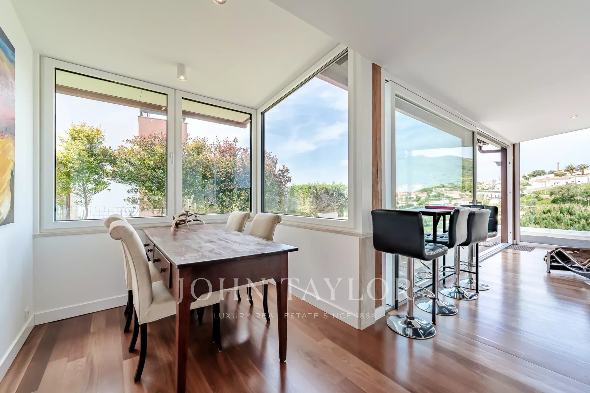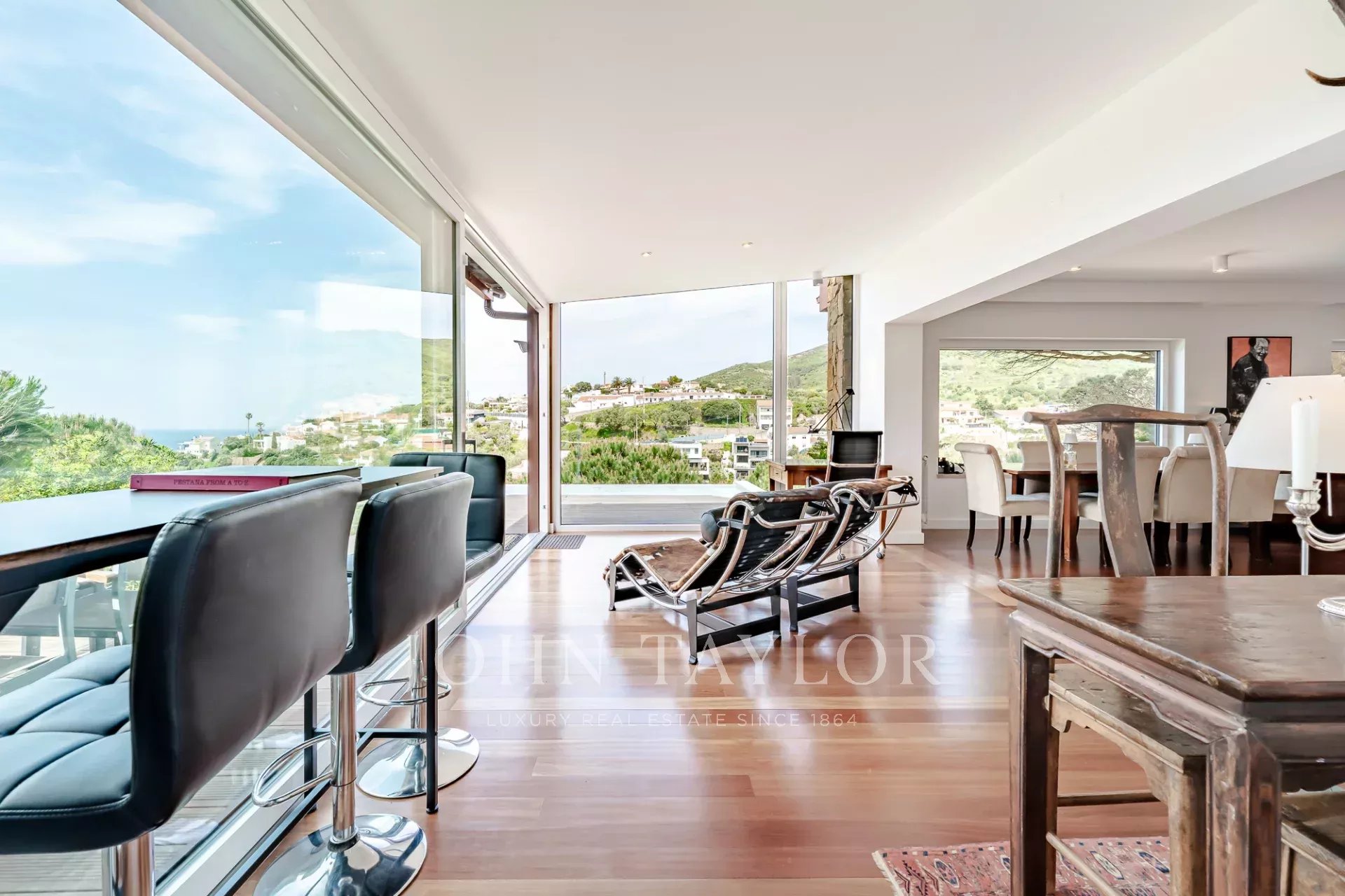 Das Haus erstreckt sich über drei Etagen und verfügt über fünf Schlafzimmer und sechs Bäder. Die Aufteilung ist sowohl für den täglichen Komfort als auch für die Unterhaltung ausgelegt, mit klar definierten Bereichen zum Wohnen, Ausruhen und für die Freizeit. Die Küche schließt direkt an ein großes Wohnzimmer an, dessen raumhohe Fenster den Blick auf das Meer freigeben und den Raum mit natürlichem Licht füllen.