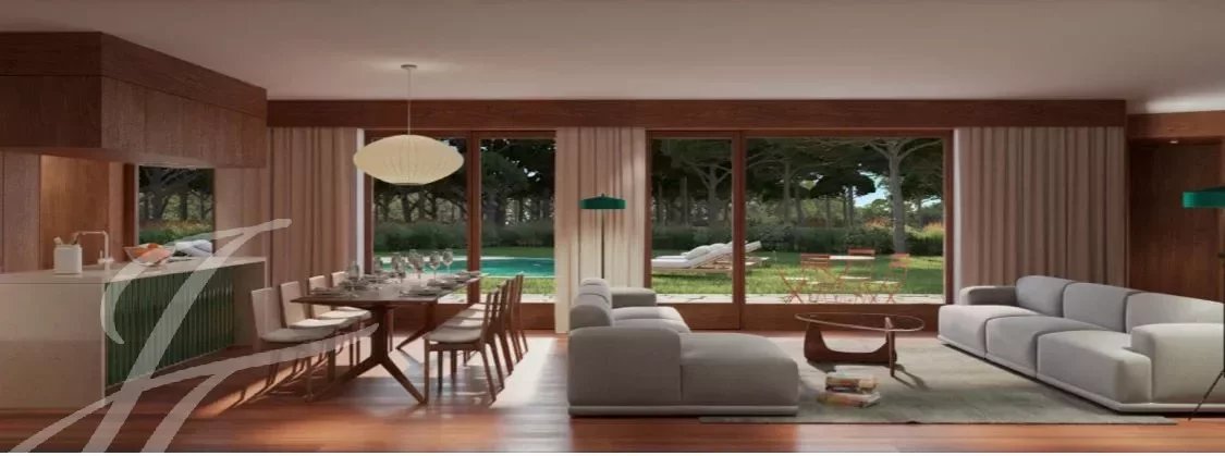 Die Verbindung nach draußen durch große Fenster und ein überdachter Bereich garantieren ein Leben in Harmonie mit der Natur, den Pinien, in absoluter Ruhe und Privatsphäre.
