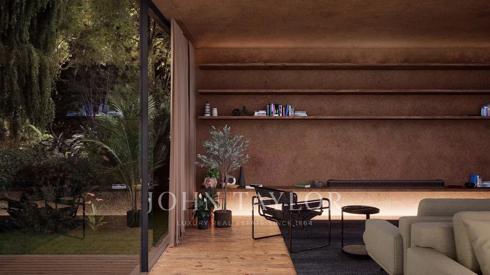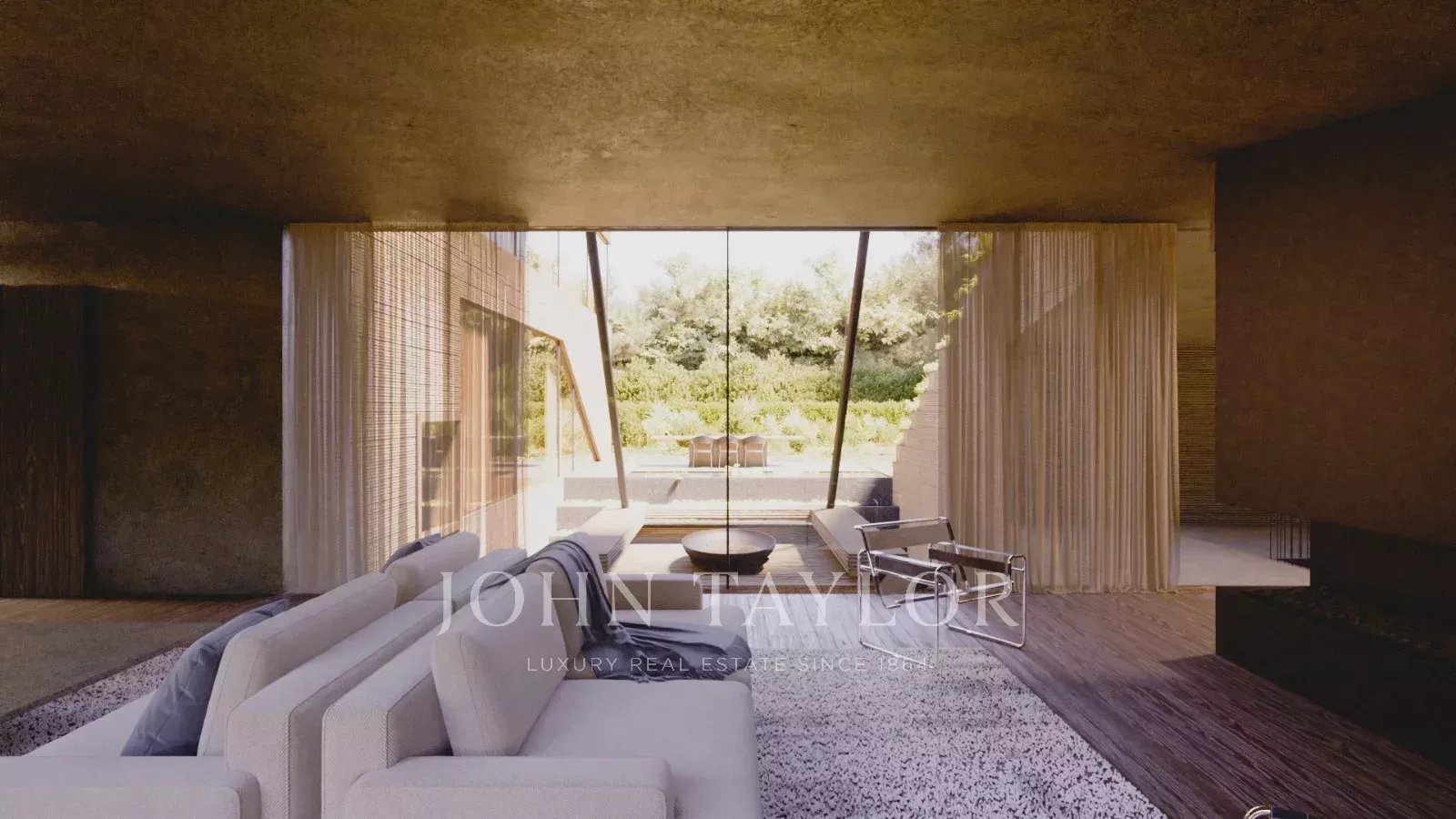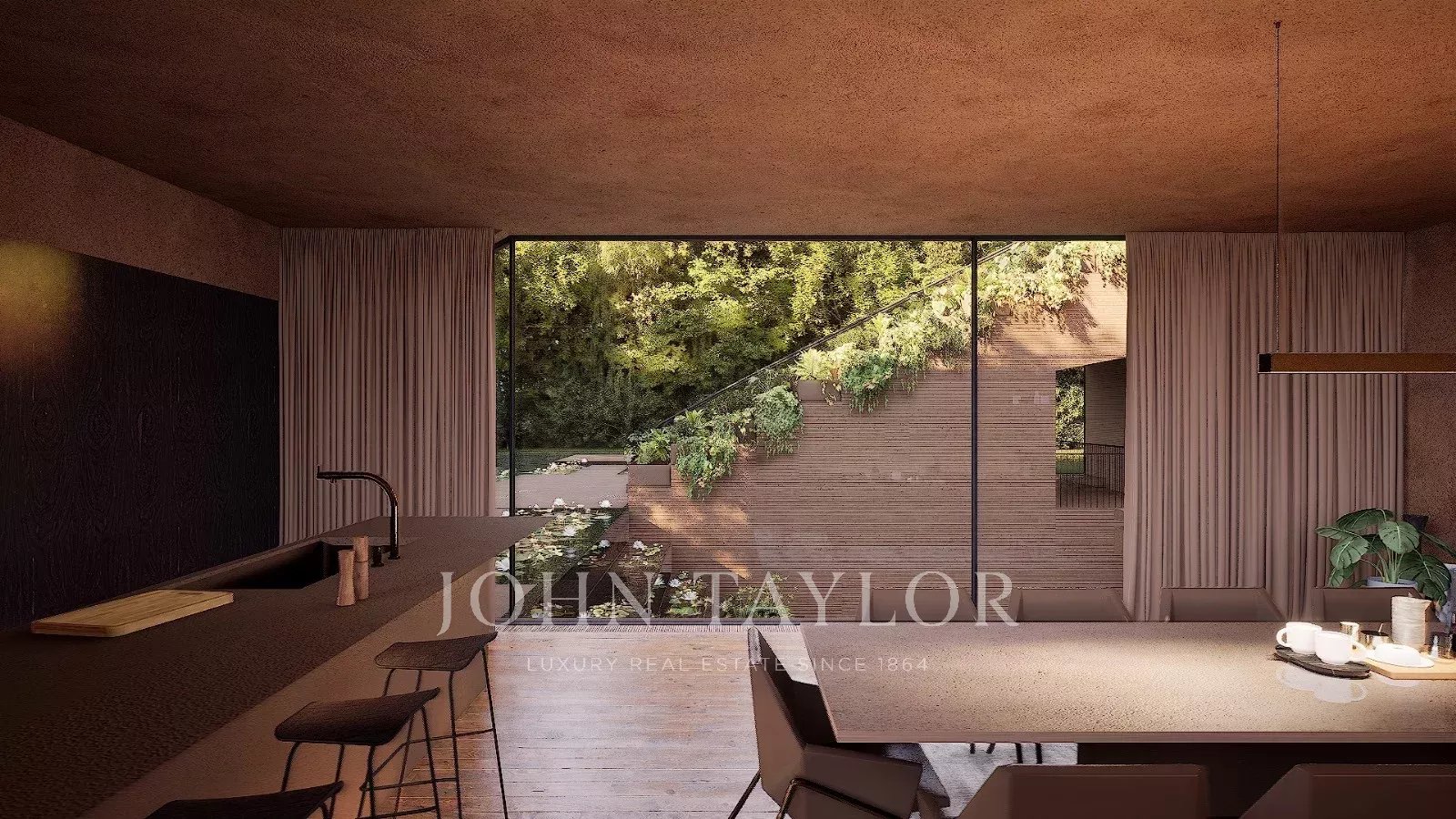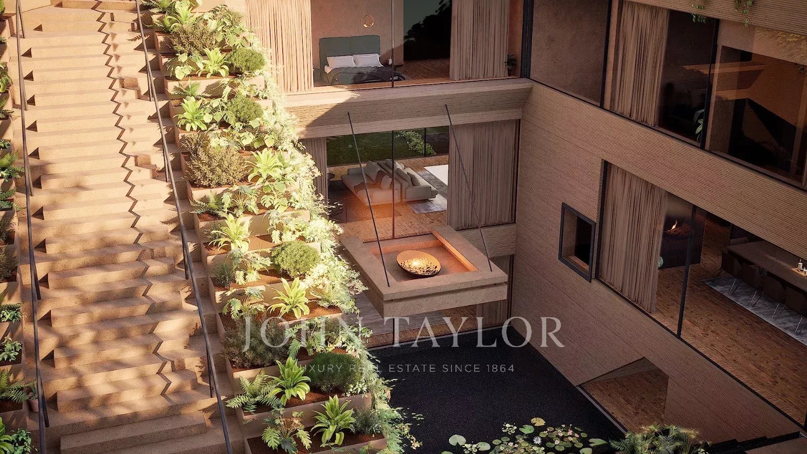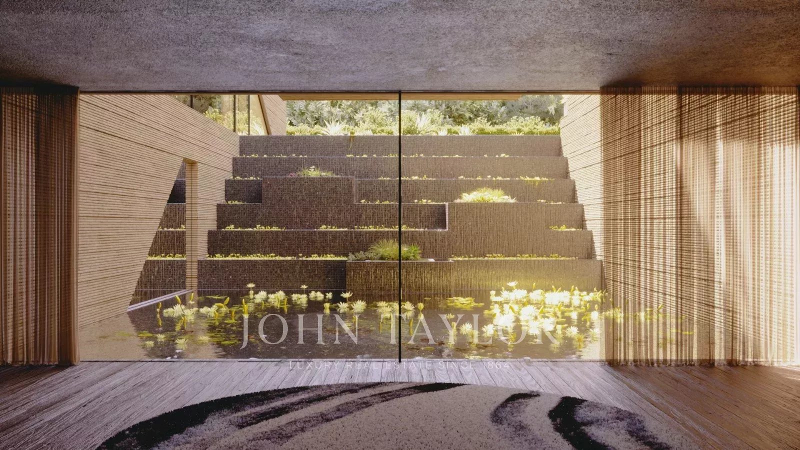 Die untere Etage besticht durch ihren Wellnessbereich mit Fitnessraum, Sauna und einem atemberaubenden Blick auf den Innenhof, der über einen Wasserfall mit dem Pool verbunden ist. Auf dieser Ebene befinden sich auch ein Dienstzimmer, multifunktionale technische Räume und eine Garage für bis zu vier Fahrzeuge.