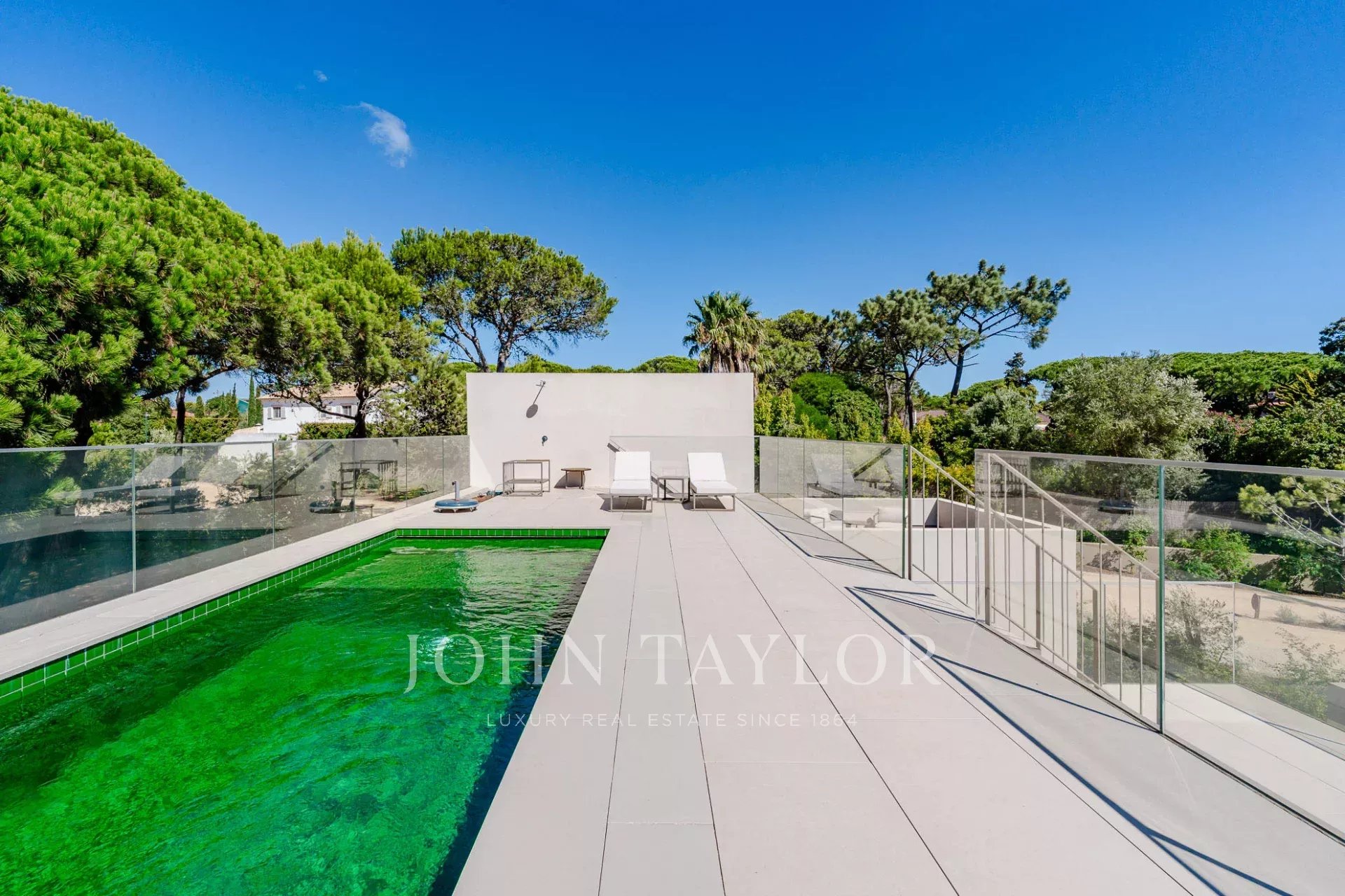 Im Obergeschoss verfügt die Master-Suite über einen privaten Balkon und einen direkten Zugang zur Terrasse, auf der sich der Pool befindet.