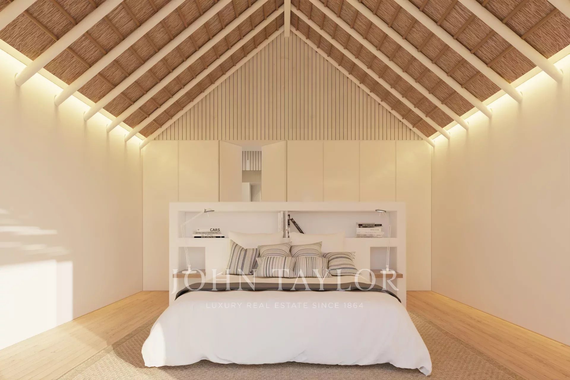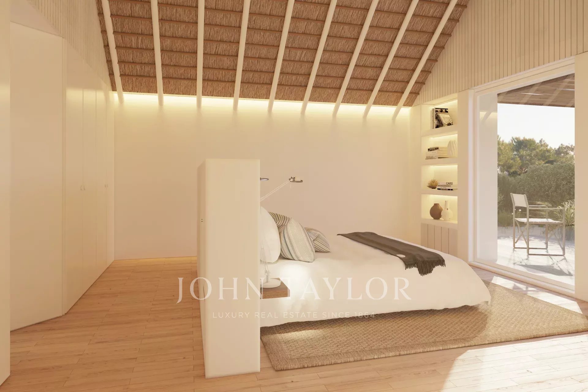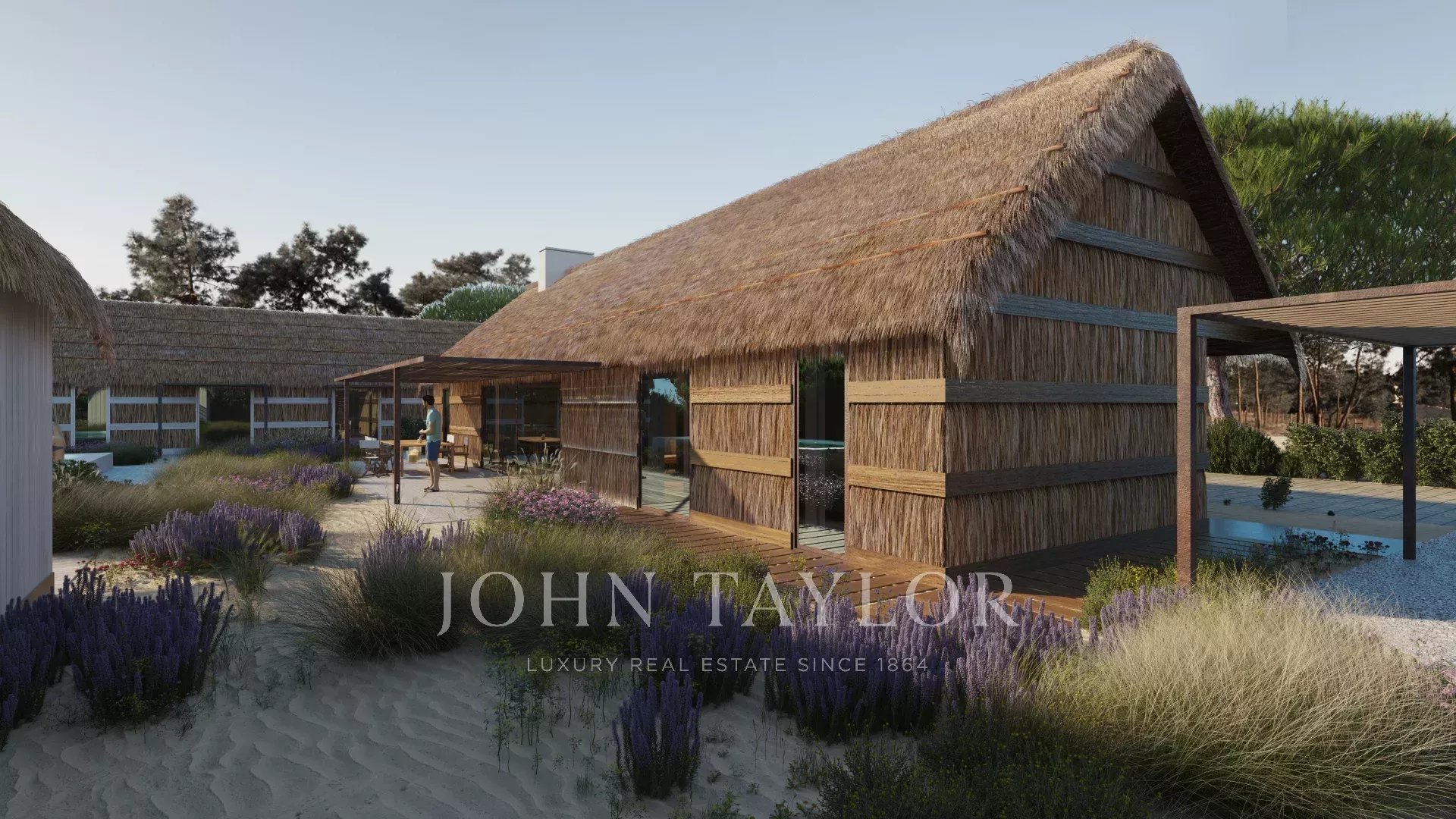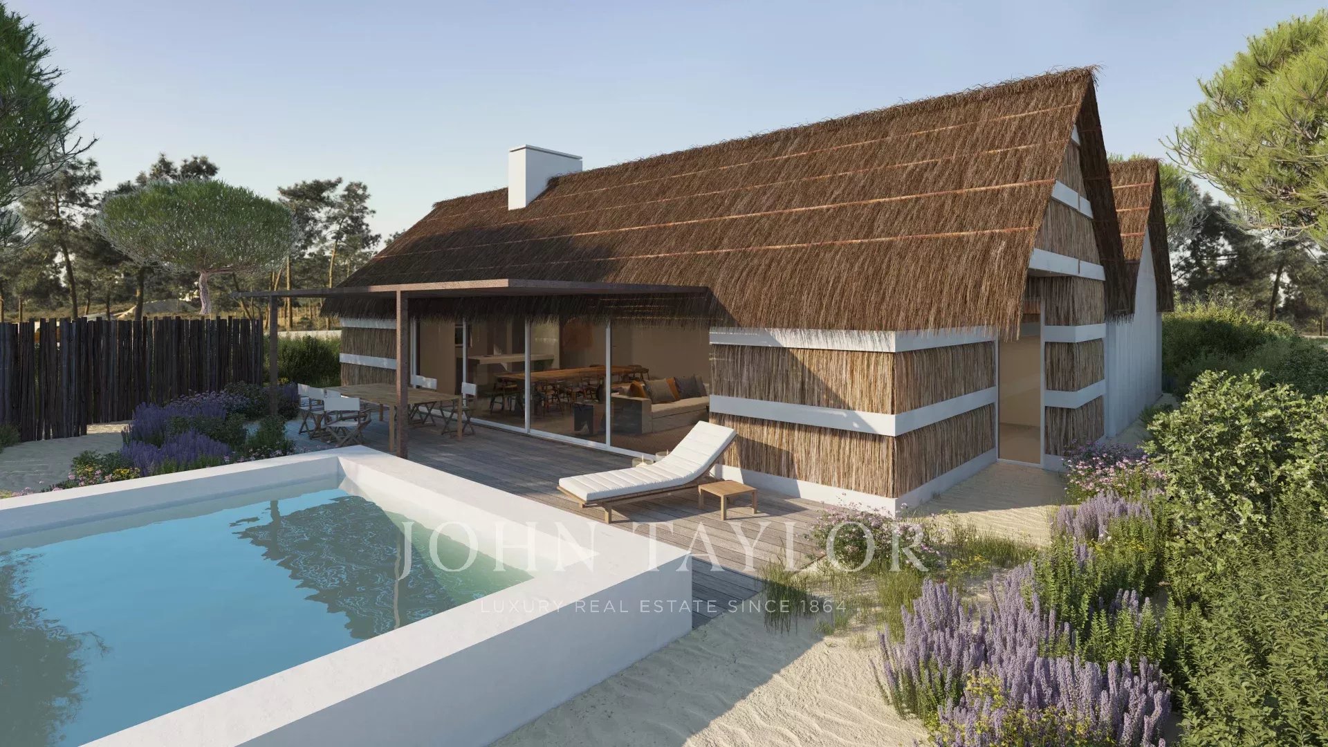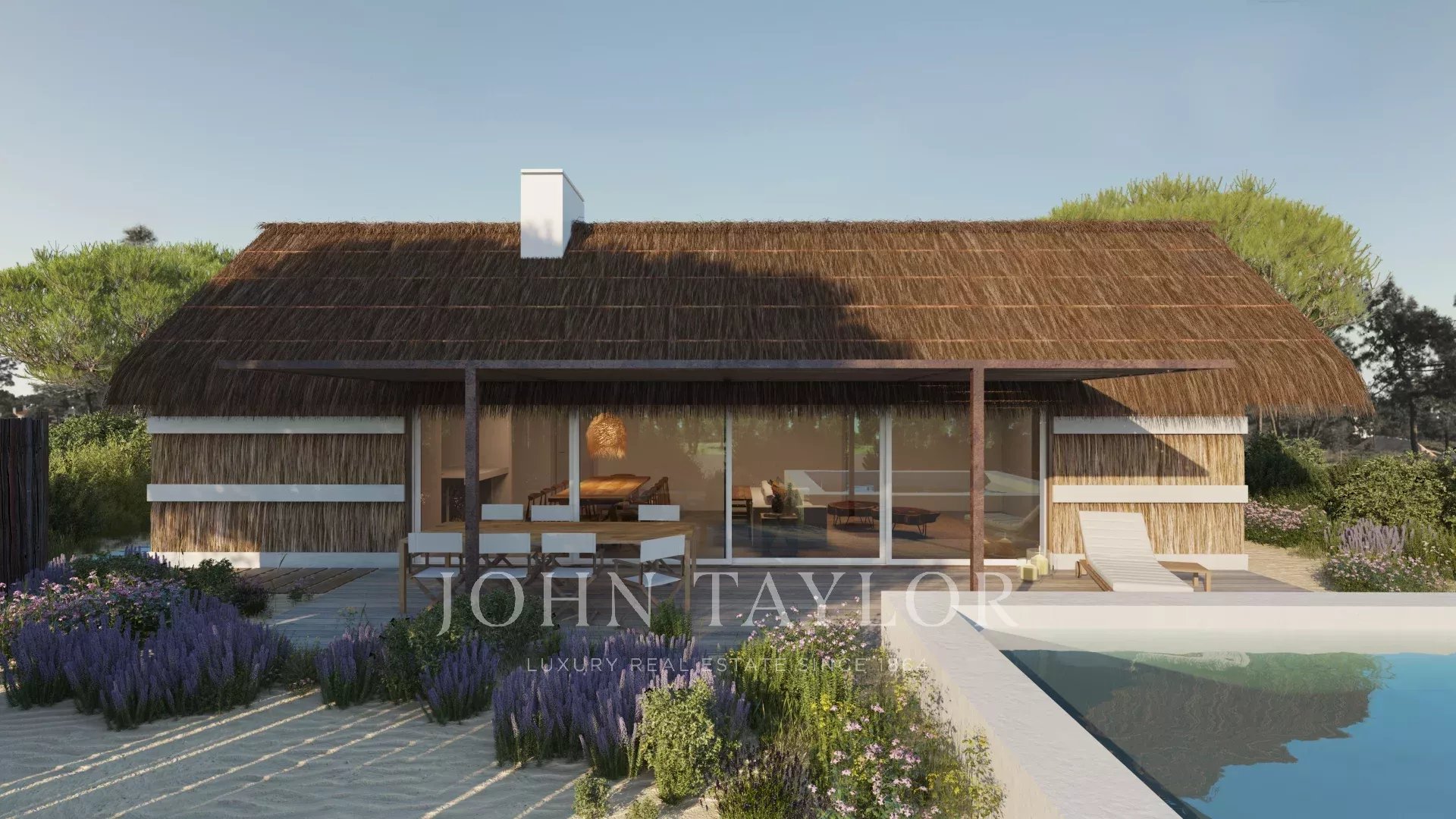 Das von GSS - Gonçalo Salazar de Sousa - entworfene Projekt ist von der traditionellen Architektur des Alentejo inspiriert und verwendet Strohdächer, Holz und Schilfrohr als Materialien. Große Glasschiebetüren, die sich vollständig in die Wände zurückziehen, maximieren das natürliche Licht und schaffen einen nahtlosen Übergang zwischen Innen- und Außenbereich.