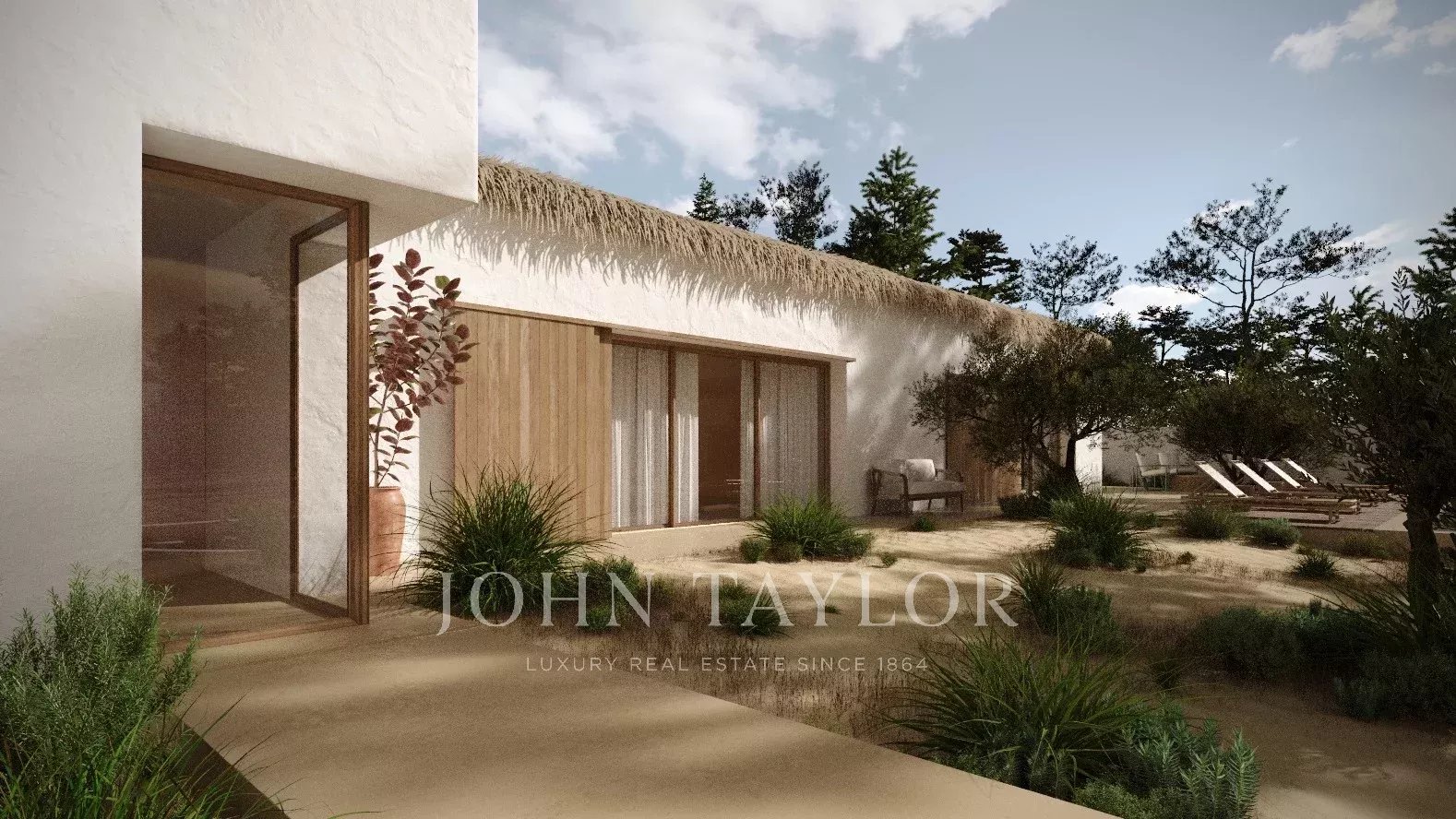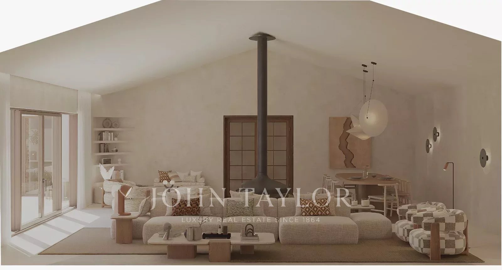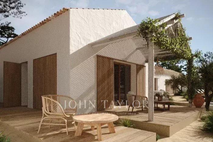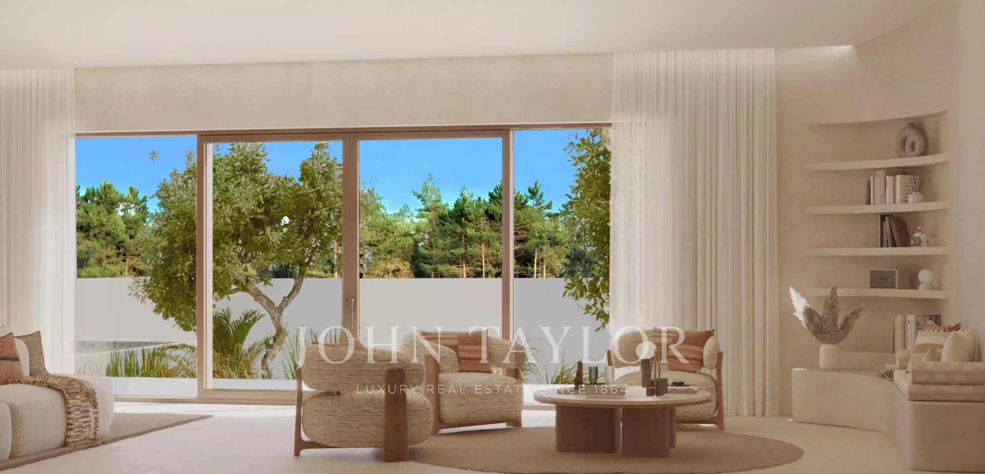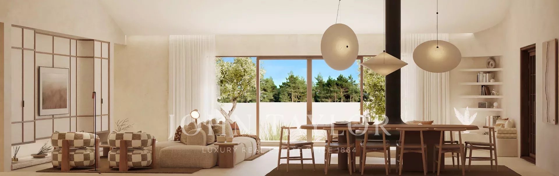 Auf einer Wohnfläche von 310 m² befinden sich vier großzügige Suiten mit hohen Decken und ein heller, offener Küchen-, Ess- und Wohnbereich im entspannten, eleganten Comporta-Stil. Ein Kamin sorgt für Gemütlichkeit, und auf der Dachterrasse kann man die Meeresbrise genießen.