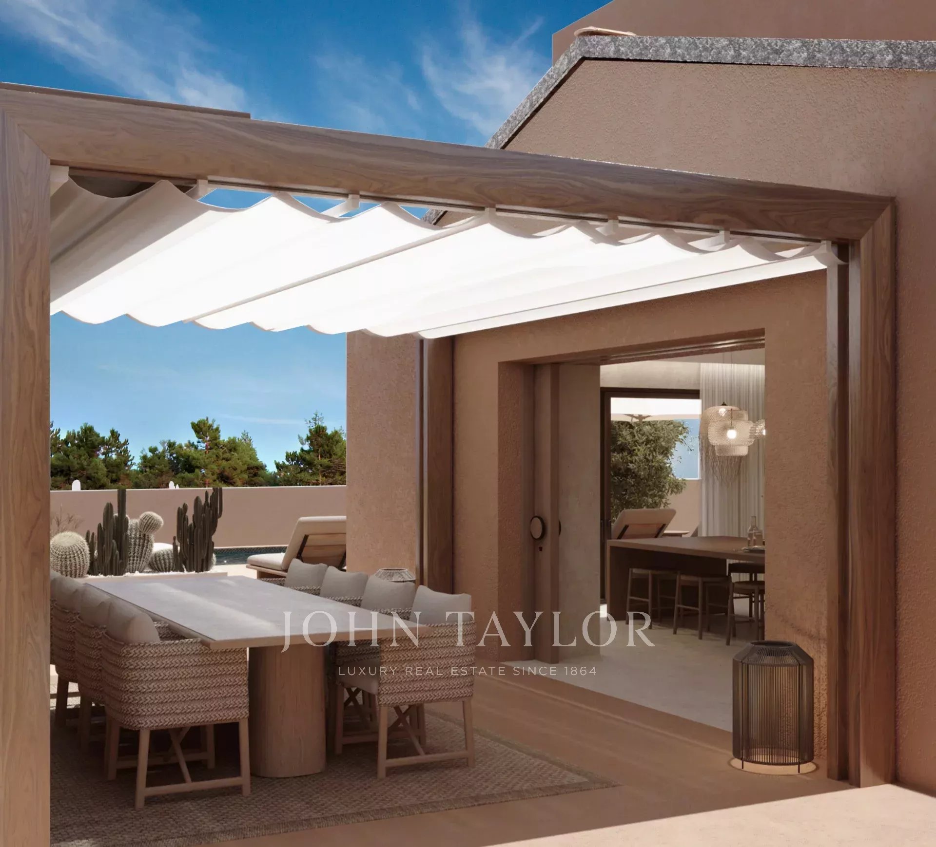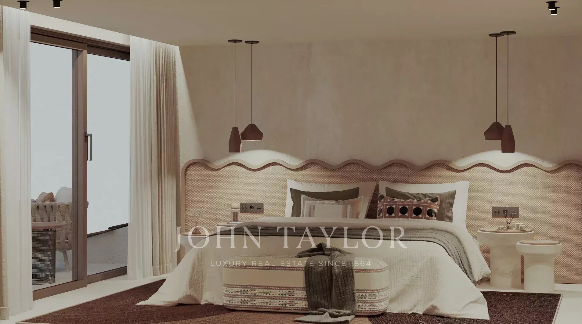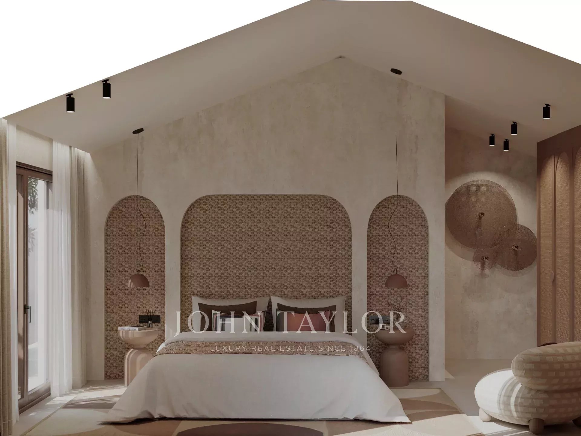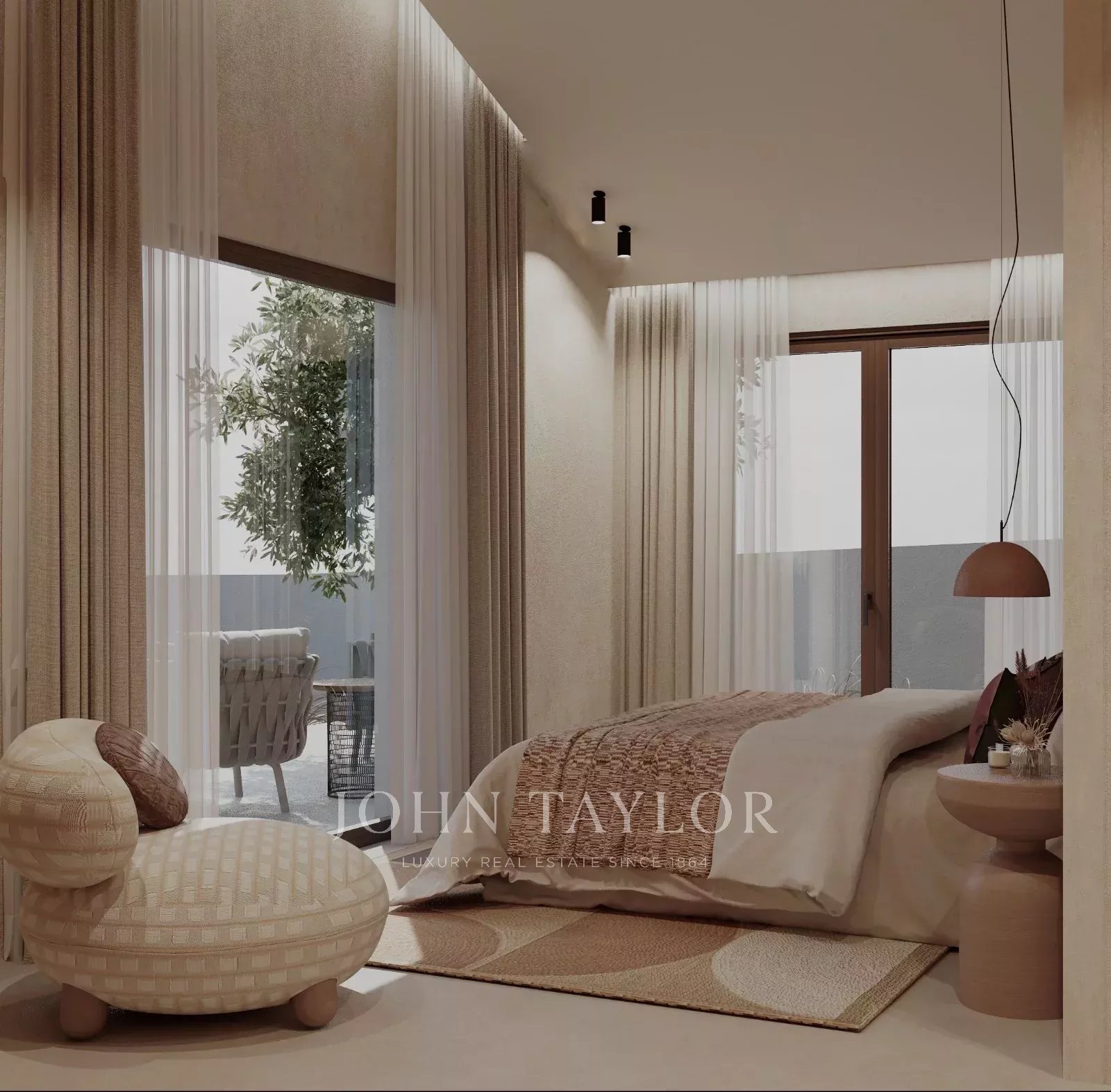 Auf einer Wohnfläche von 310 m² befinden sich vier großzügige Suiten mit hohen Decken und ein heller, offener Küchen-, Ess- und Wohnbereich im entspannten, eleganten Comporta-Stil. Ein Kamin sorgt für Gemütlichkeit, und auf der Dachterrasse kann man die Meeresbrise genießen.