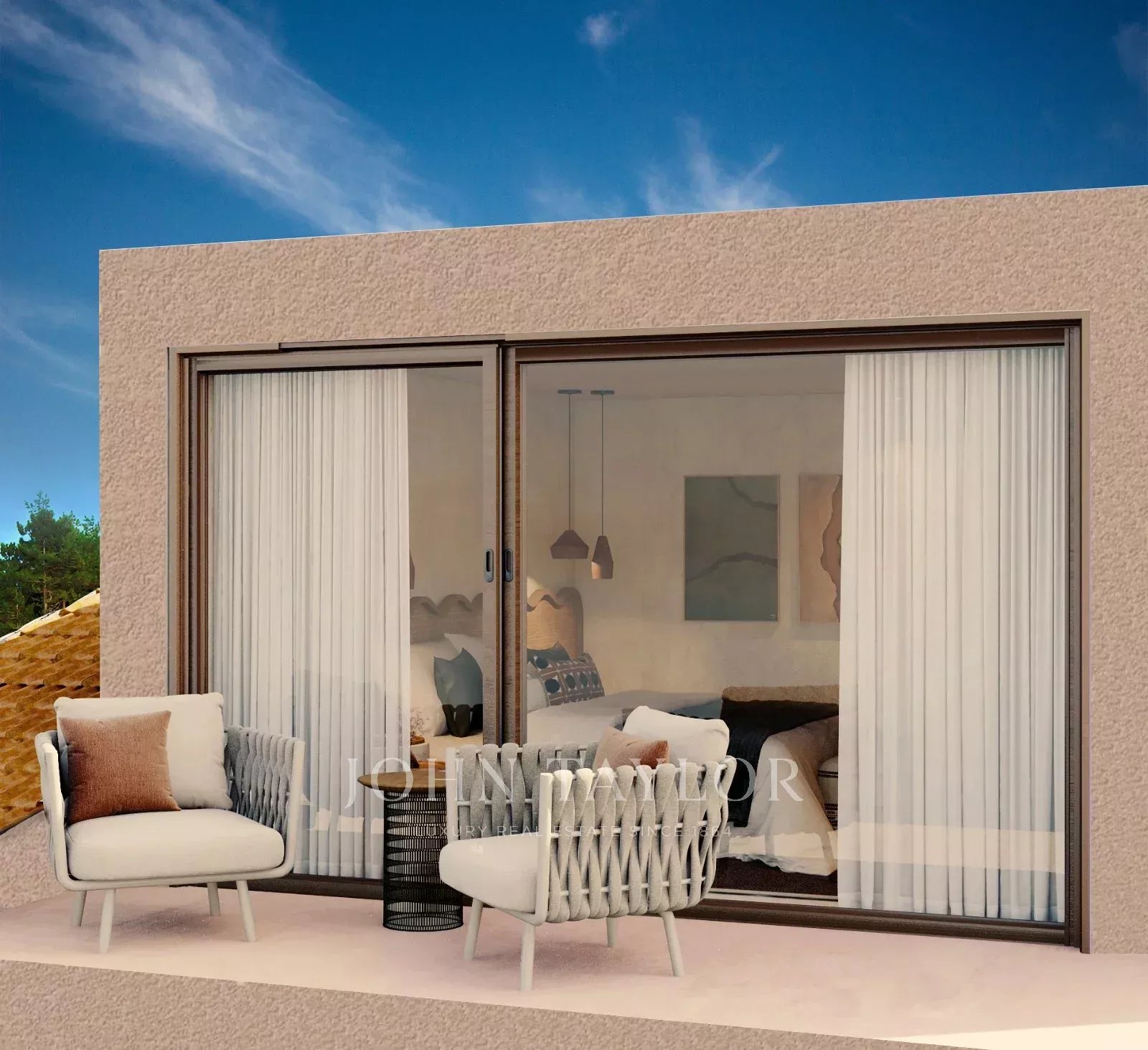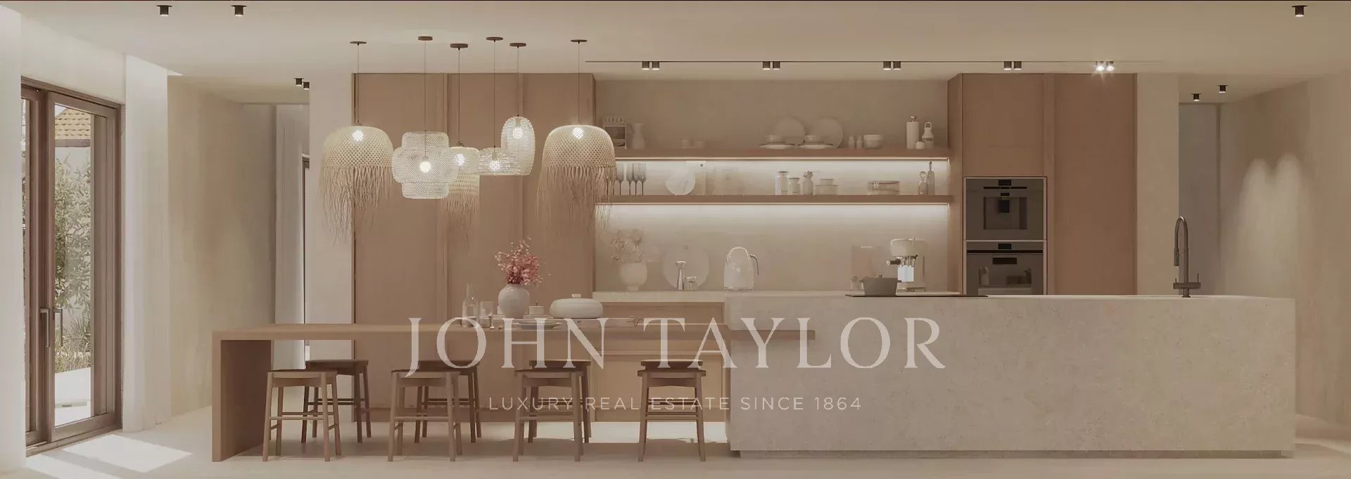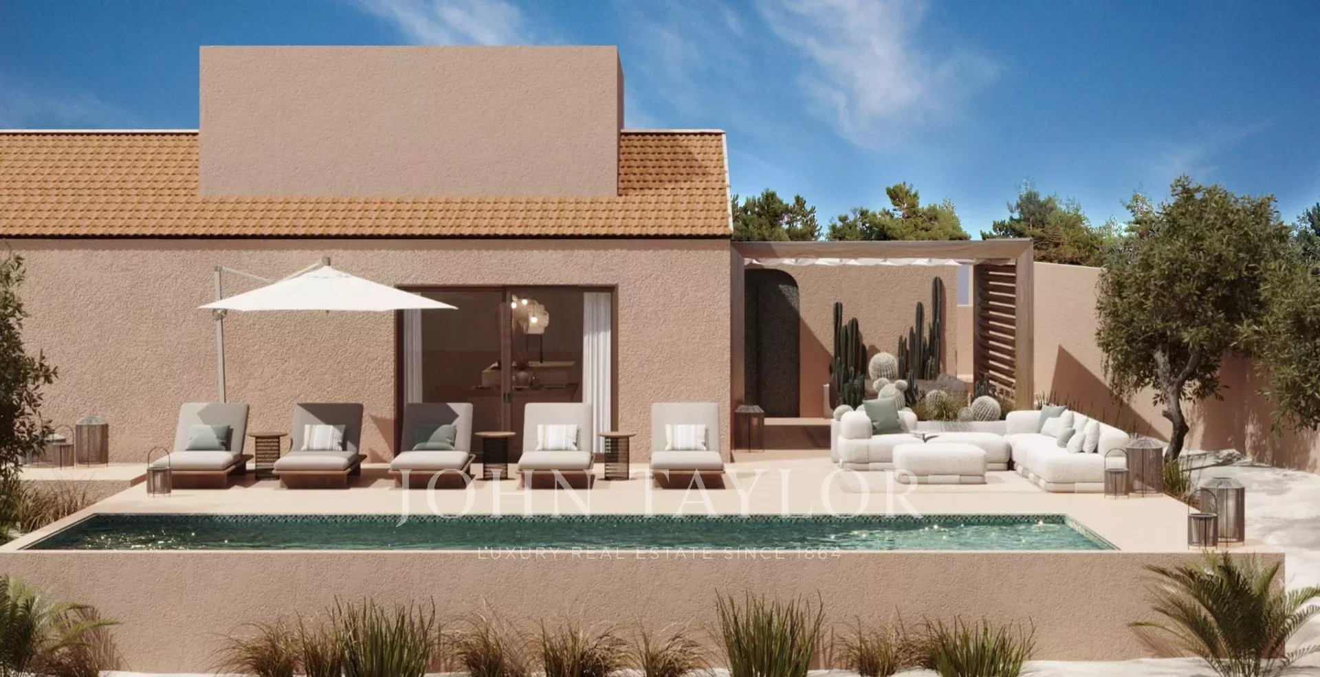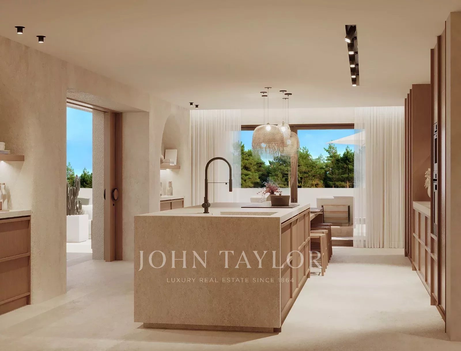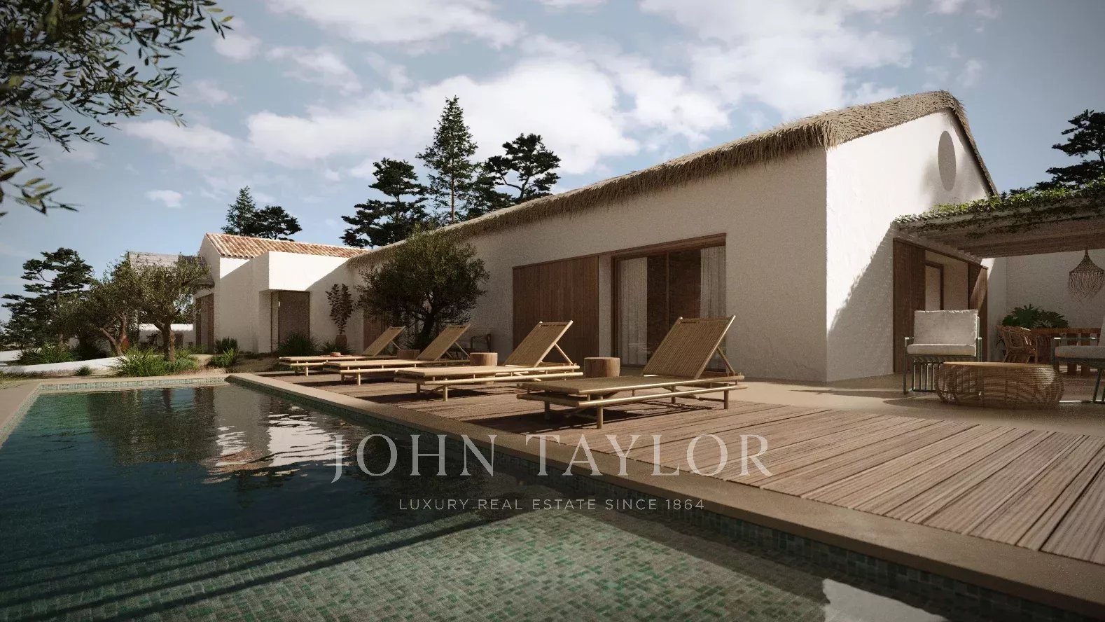 Auf einer Wohnfläche von 310 m² befinden sich vier großzügige Suiten mit hohen Decken und ein heller, offener Küchen-, Ess- und Wohnbereich im entspannten, eleganten Comporta-Stil. Ein Kamin sorgt für Gemütlichkeit, und auf der Dachterrasse kann man die Meeresbrise genießen.