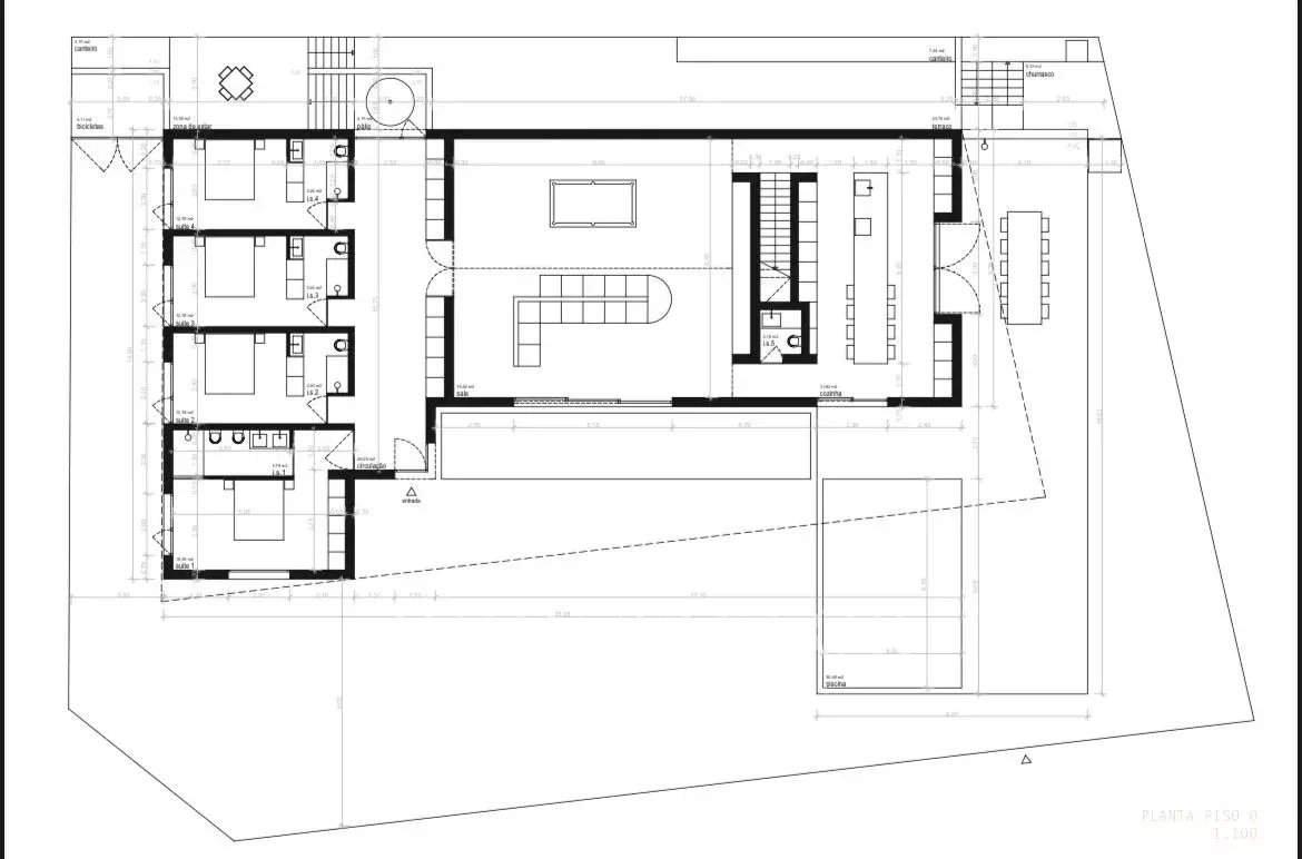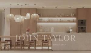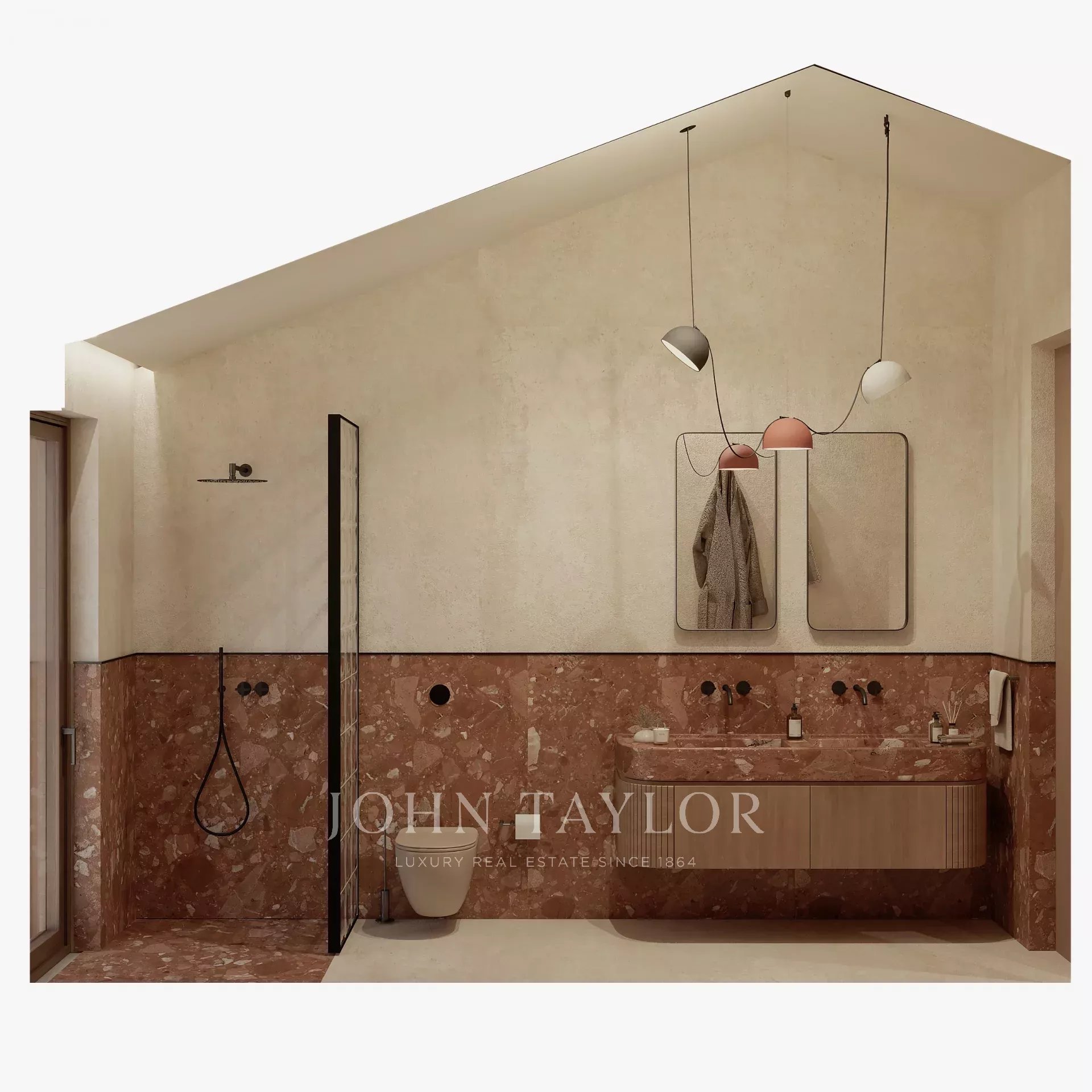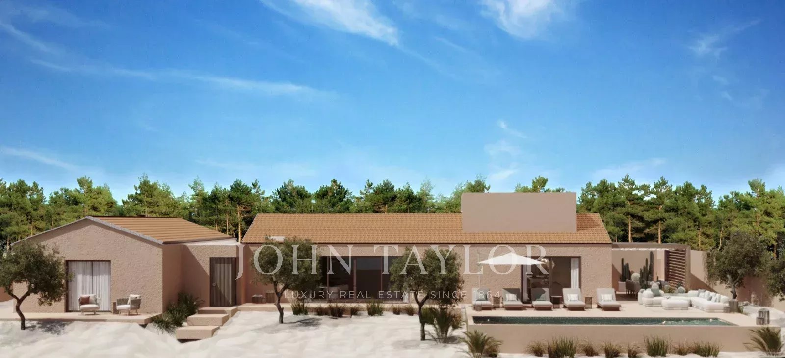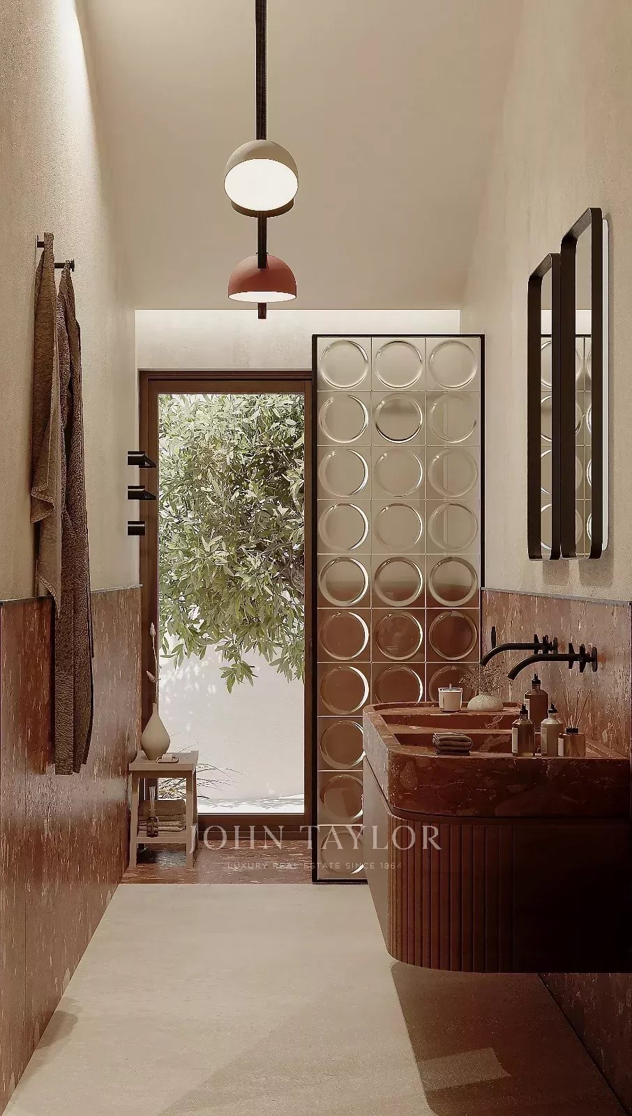 Auf einer Wohnfläche von 310 m² befinden sich vier großzügige Suiten mit hohen Decken und ein heller, offener Küchen-, Ess- und Wohnbereich im entspannten, eleganten Comporta-Stil. Ein Kamin sorgt für Gemütlichkeit, und auf der Dachterrasse kann man die Meeresbrise genießen.