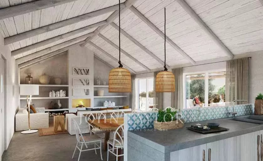Die Innenräume sind so gestaltet, dass sie viel natürliches Licht und Komfort bieten, mit einem hellen Wohn- und Essbereich, der sich direkt nach außen öffnet, und einer unabhängigen, voll ausgestatteten Küche, die Funktionalität mit eleganten Details verbindet.