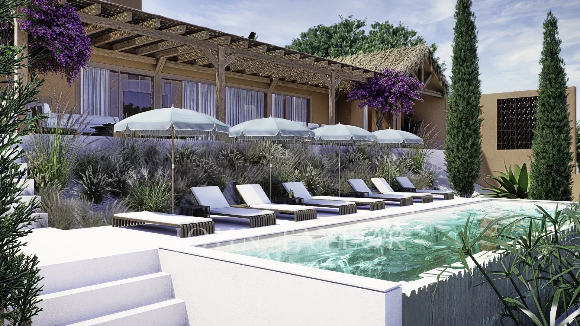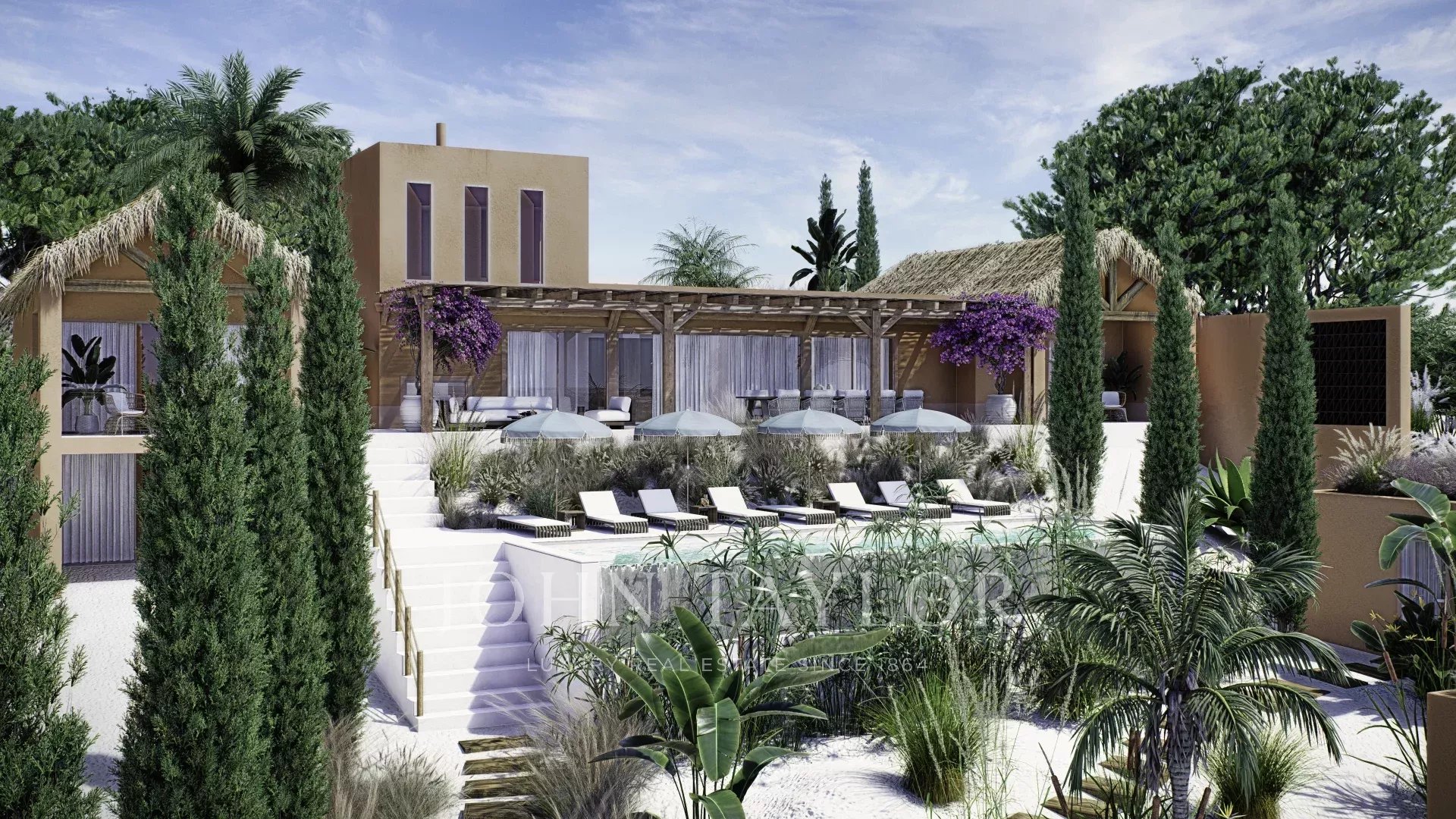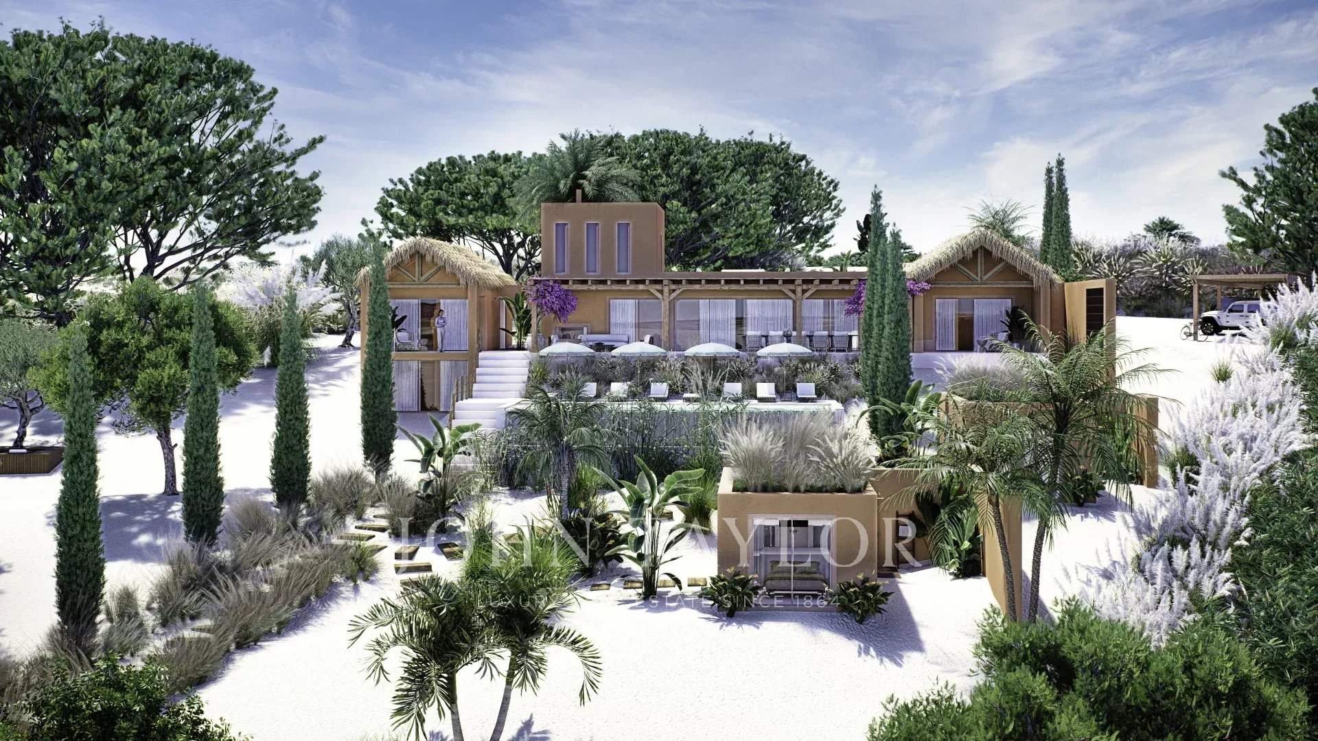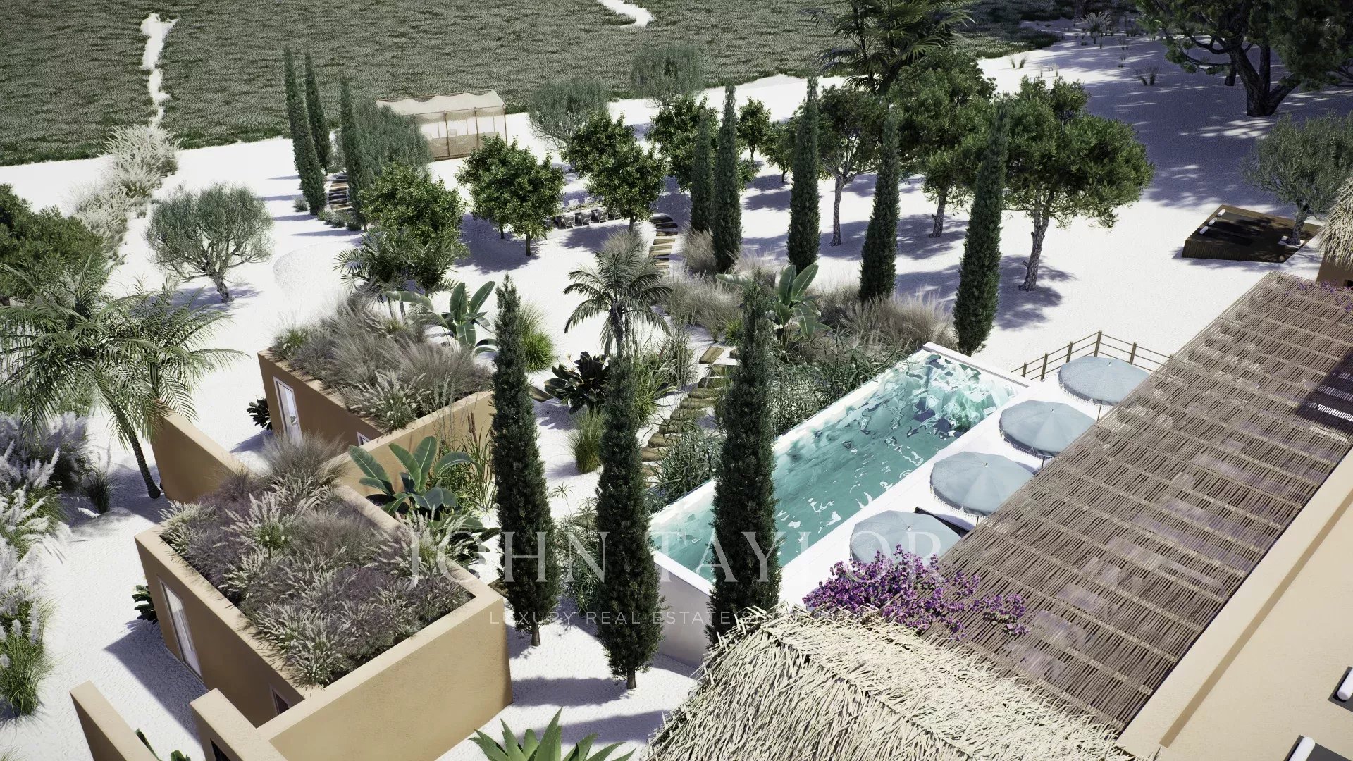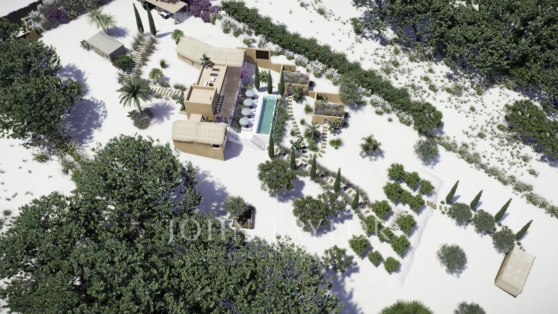 Das in zeitgenössischer Architektur gestaltete Anwesen umfasst eine Hauptvilla und zwei unabhängige Gäste-Cabanas. Die Hauptvilla verfügt über drei Schlafzimmer mit eigenem Bad, eine offene Küche, einen Ess- und Wohnbereich, drei Terrassen, eine Dachterrasse und einen Fitnessraum. Jede Gäste-Cabana verfügt über ein Schlafzimmer mit eigenem Bad und eine private Terrasse. Das Anwesen ist komplett möbliert und verfügt über einen externen Weinkeller.