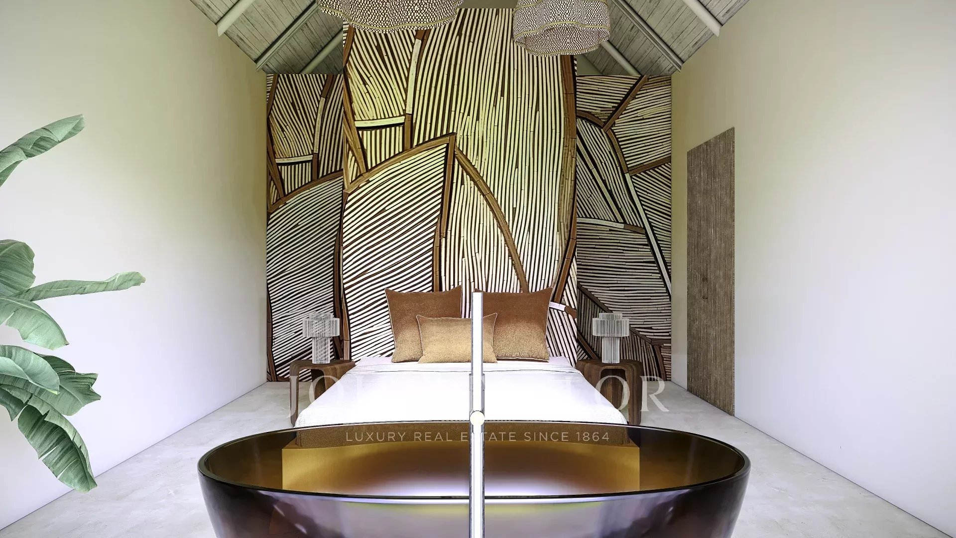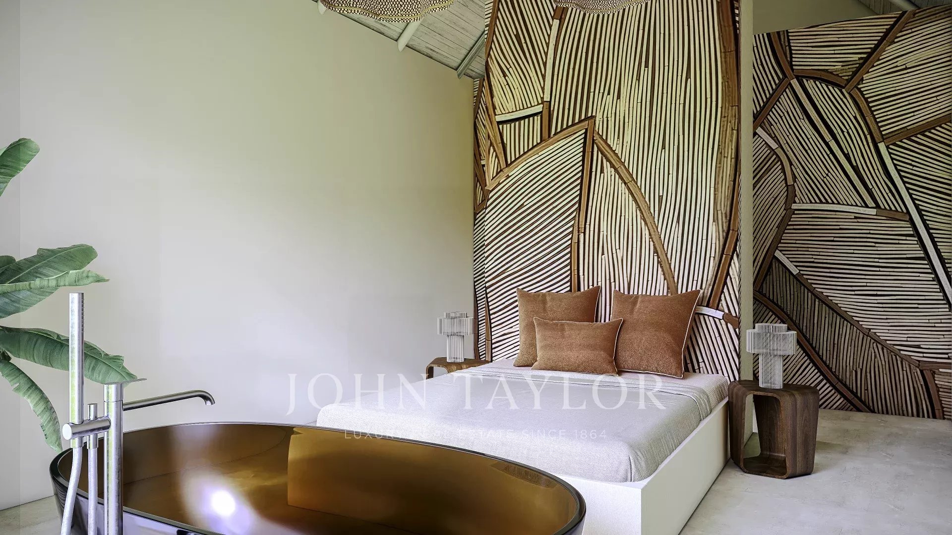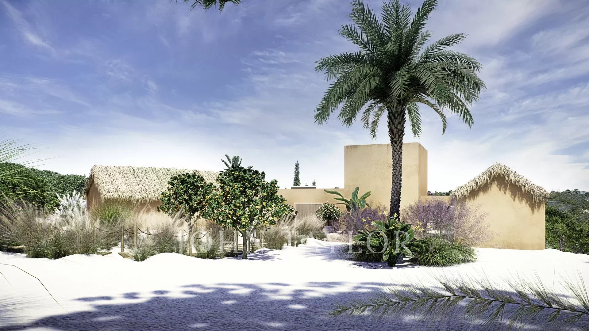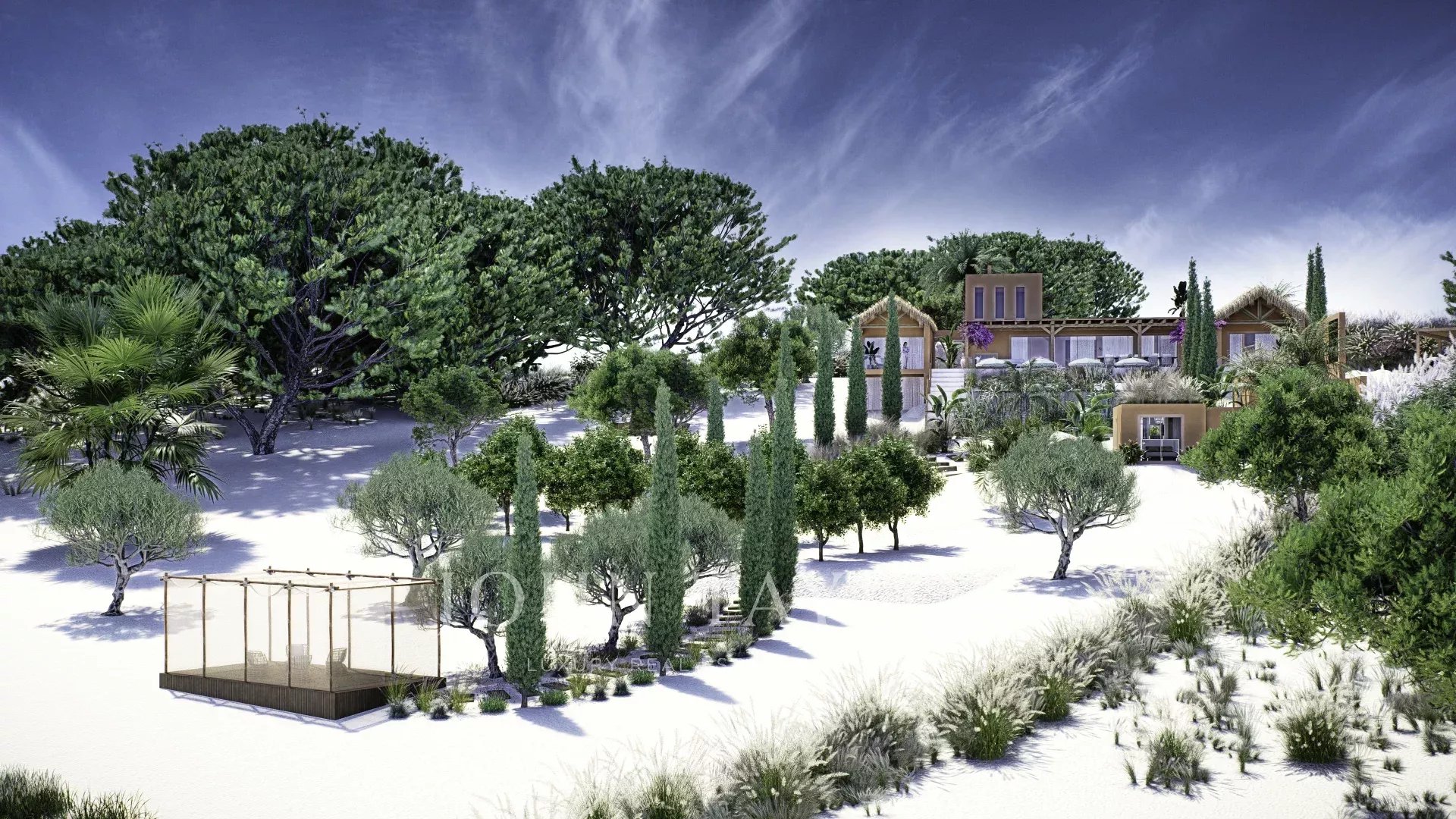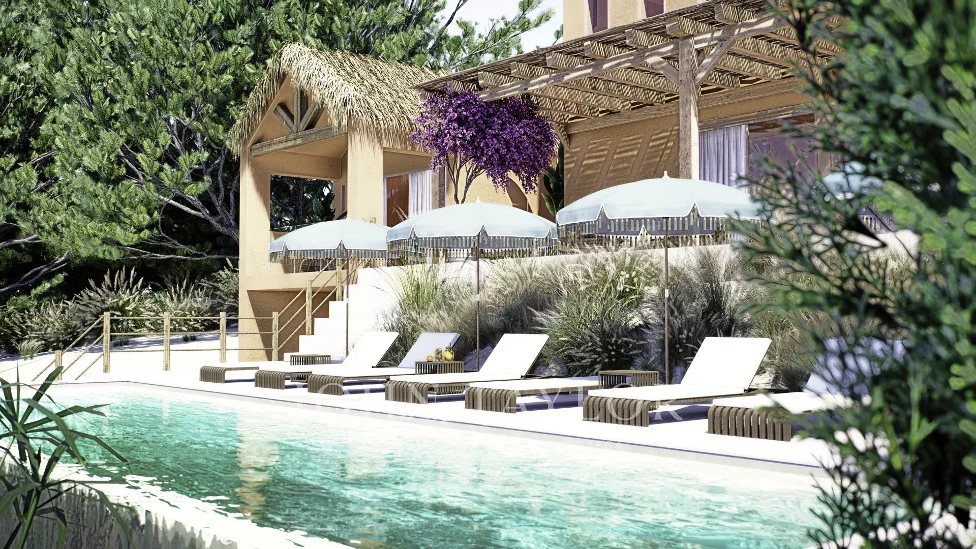 Das in zeitgenössischer Architektur gestaltete Anwesen umfasst eine Hauptvilla und zwei unabhängige Gäste-Cabanas. Die Hauptvilla verfügt über drei Schlafzimmer mit eigenem Bad, eine offene Küche, einen Ess- und Wohnbereich, drei Terrassen, eine Dachterrasse und einen Fitnessraum. Jede Gäste-Cabana verfügt über ein Schlafzimmer mit eigenem Bad und eine private Terrasse. Das Anwesen ist komplett möbliert und verfügt über einen externen Weinkeller.
