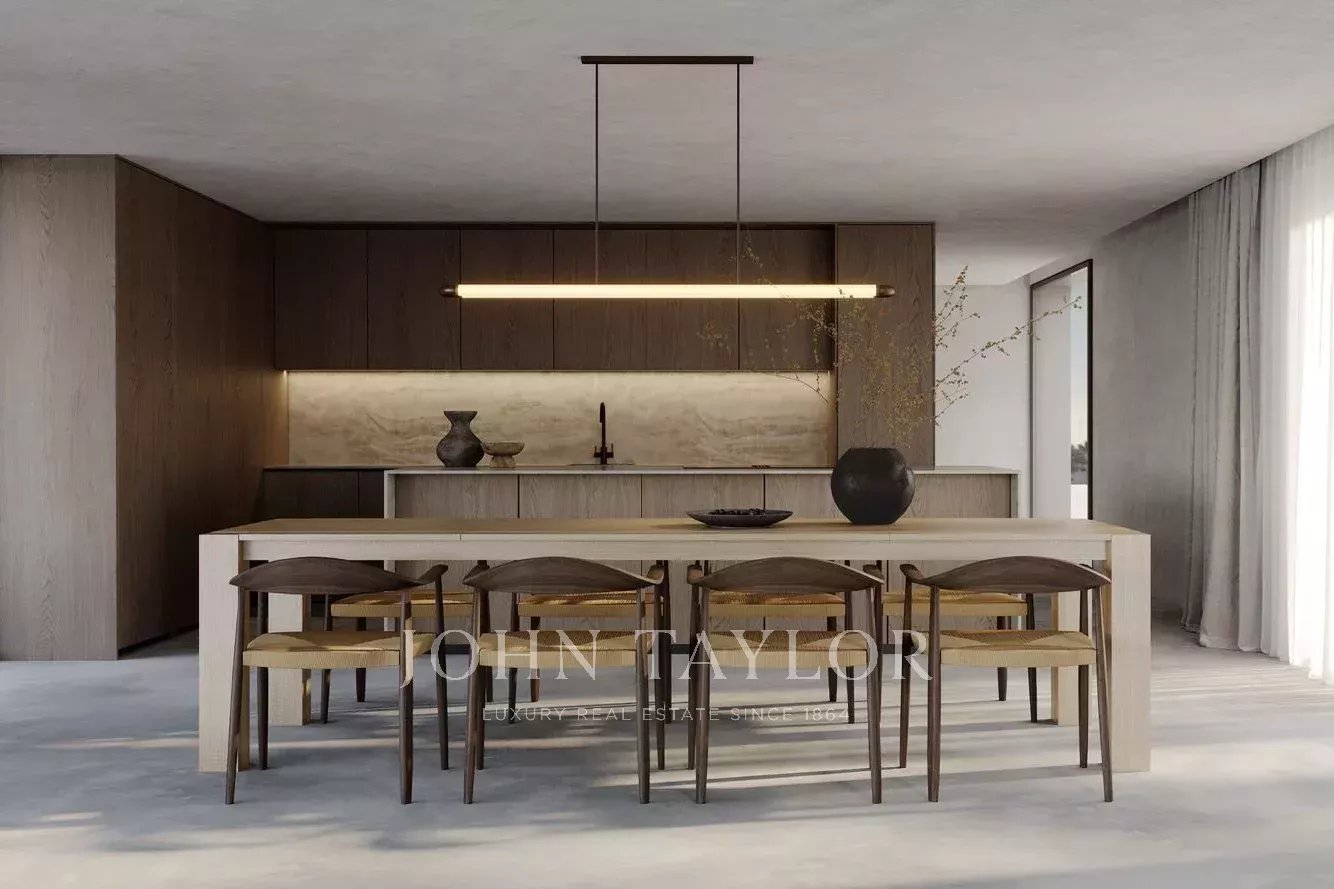 Das Erdgeschoss umfasst eine Eingangshalle, ein Gästebad und einen großzügigen, 66 m² großen, offenen Wohn- und Essbereich mit integrierter Küche, der so gestaltet ist, dass er möglichst viel natürliches Licht und eine Verbindung nach draußen bietet. Auf dieser Ebene befindet sich auch ein Schlafzimmer mit eigenem Bad und direktem Zugang zu den Terrassen und dem Swimmingpool.