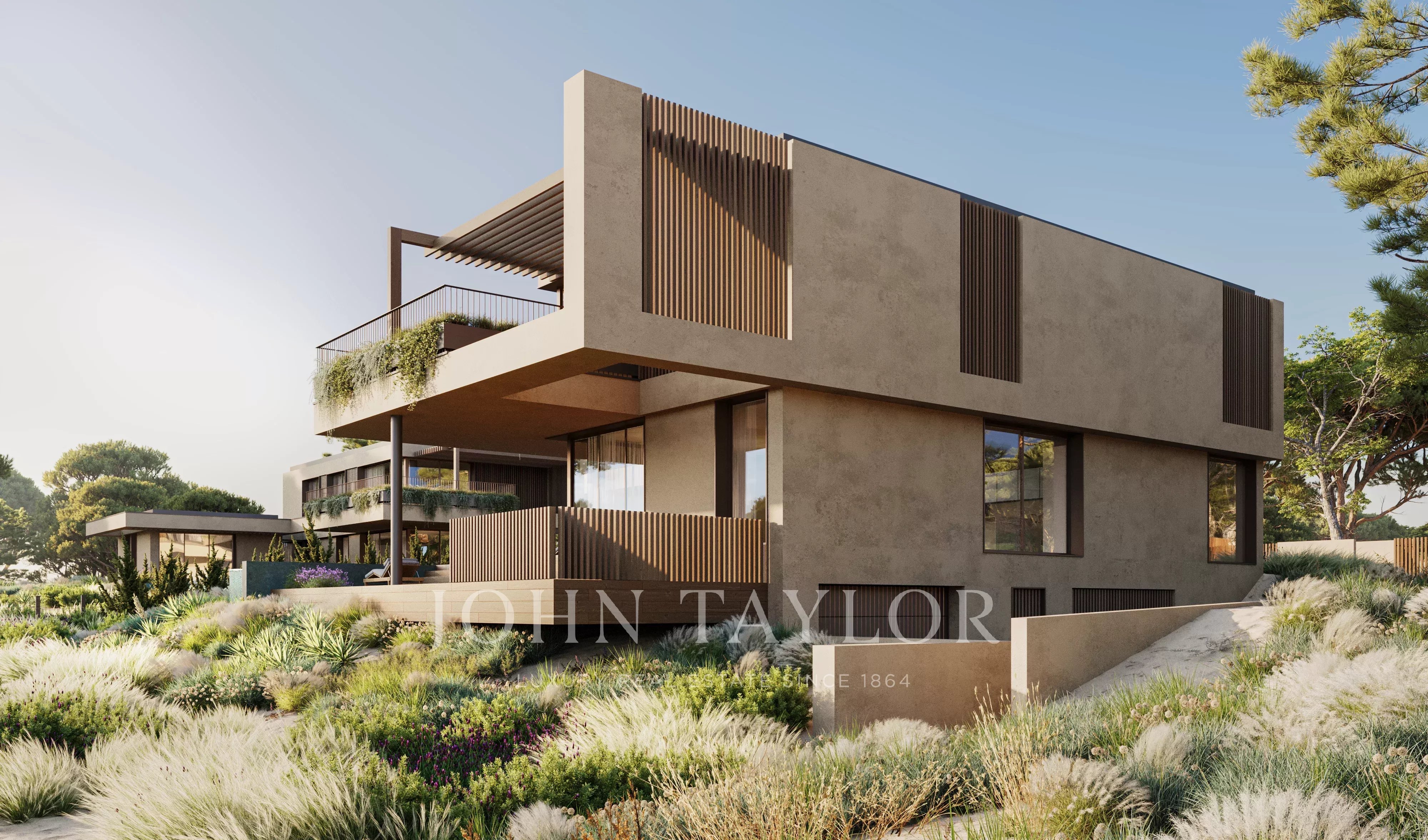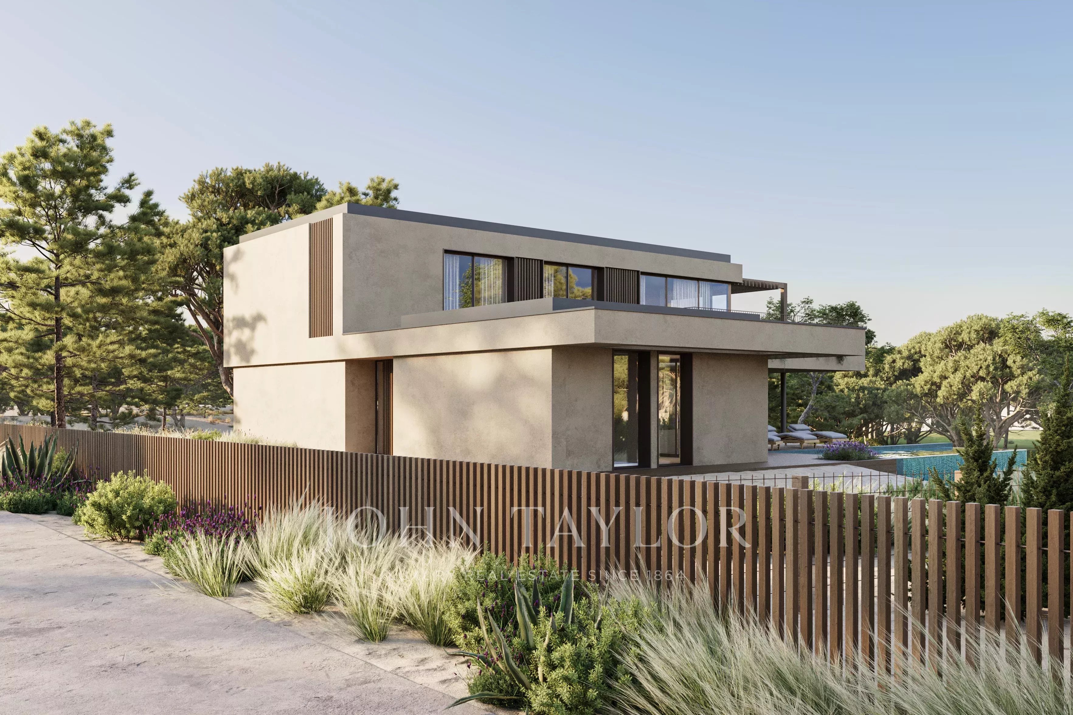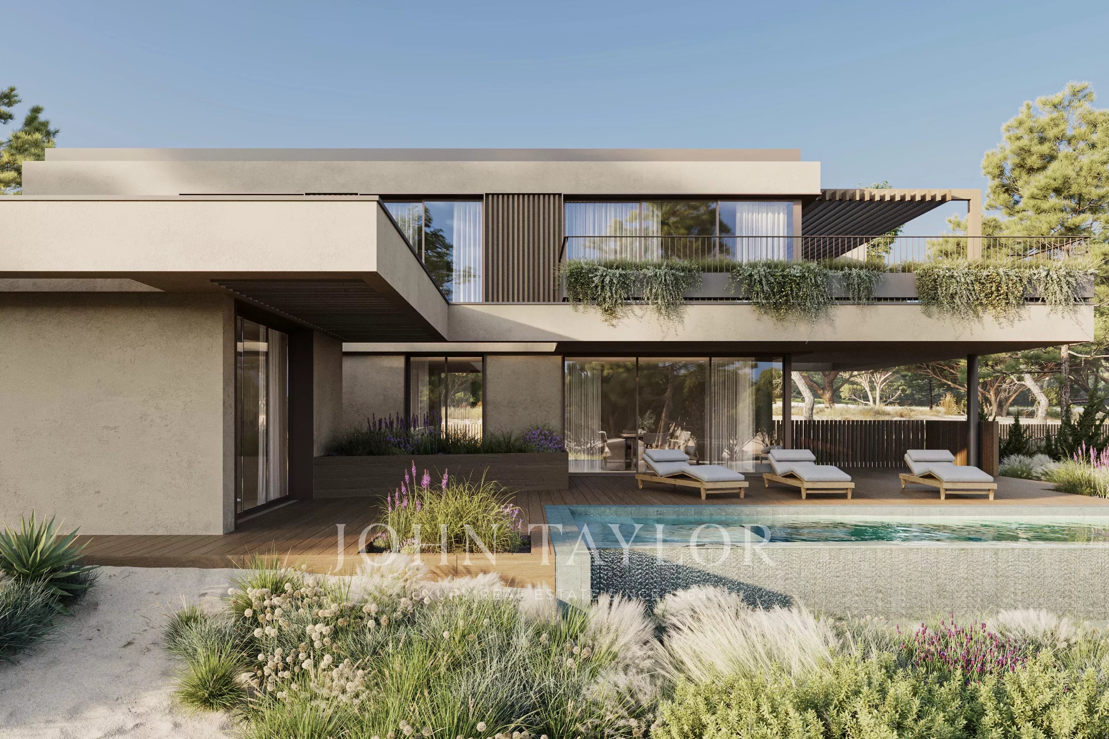 Die Außenbereiche sind als natürliche Erweiterung der Innenräume konzipiert, mit einer landschaftlich gestalteten Umgebung, Terrassen und einem privaten Swimmingpool mit Blick auf den Golfplatz.
