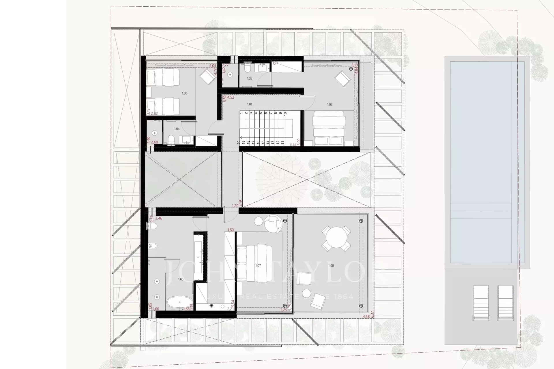 Im Außenbereich bietet das Anwesen einen privaten Swimmingpool, Terrassen zum Essen und Entspannen sowie einen Landschaftsgarten mit einheimischer Vegetation.