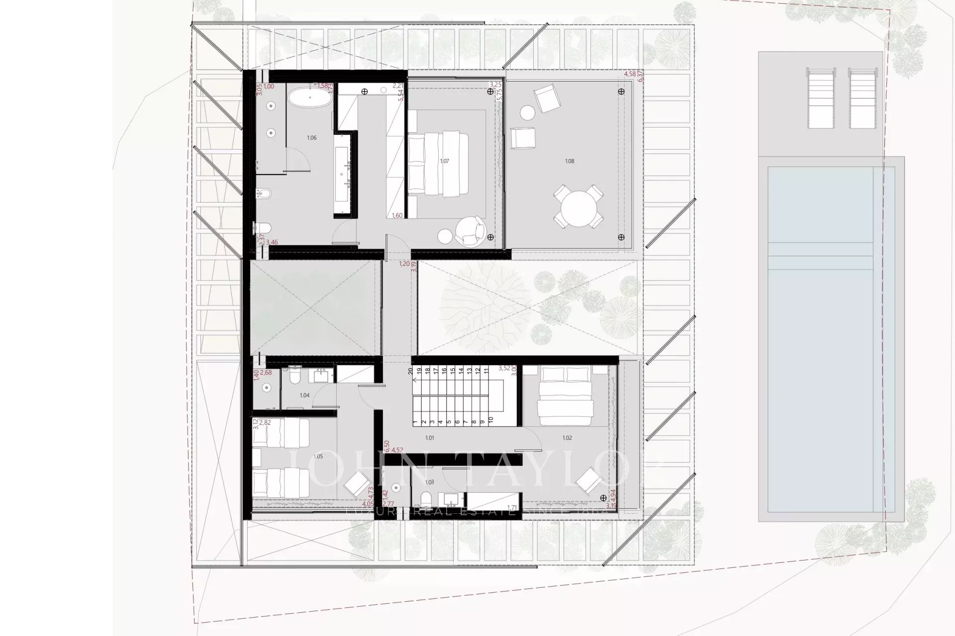Im Außenbereich bietet das Anwesen einen privaten Swimmingpool, Terrassen zum Essen und Entspannen sowie einen Landschaftsgarten mit einheimischer Vegetation.