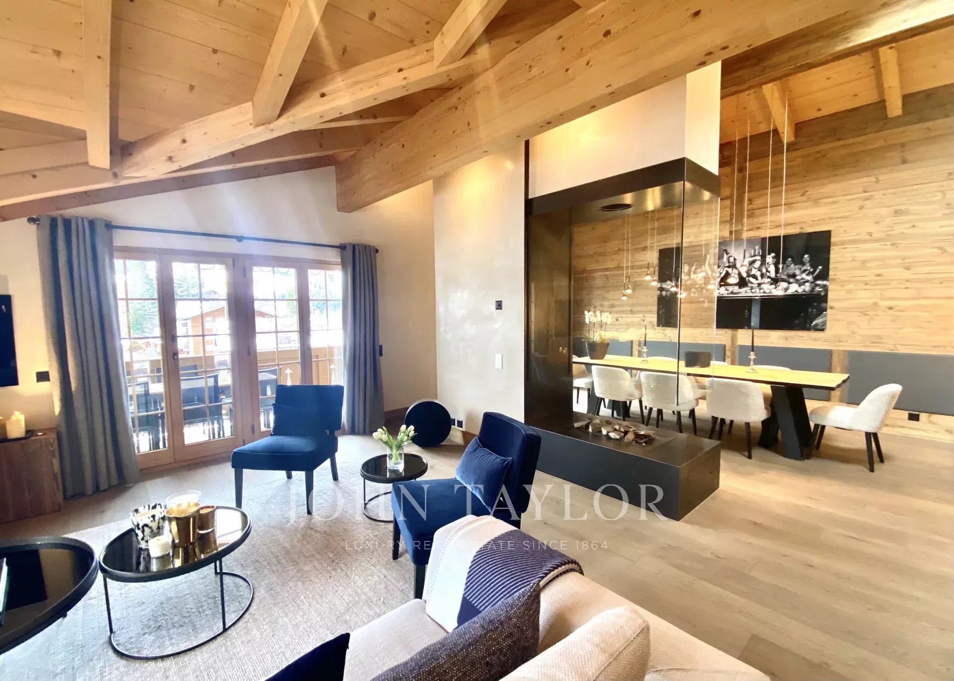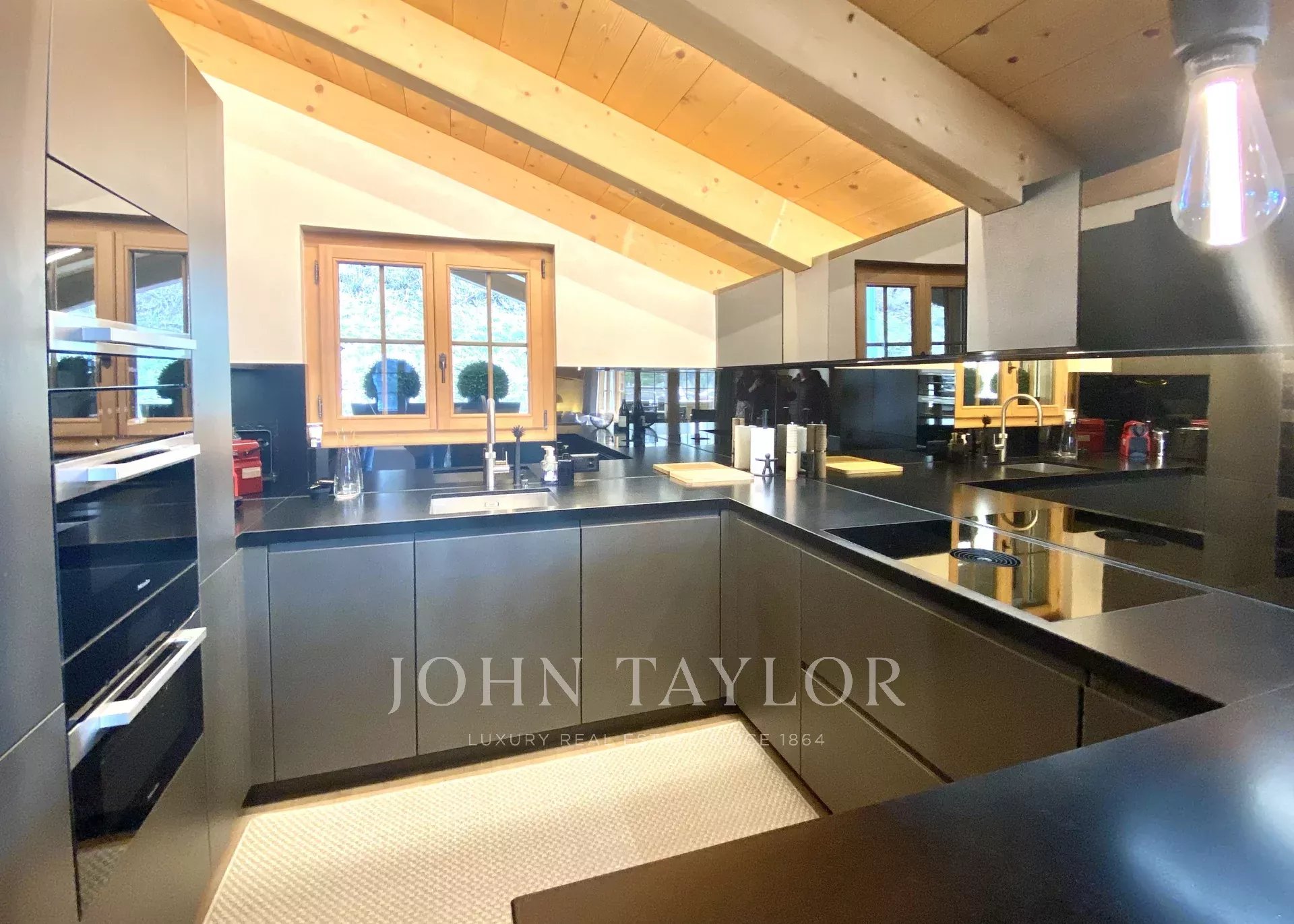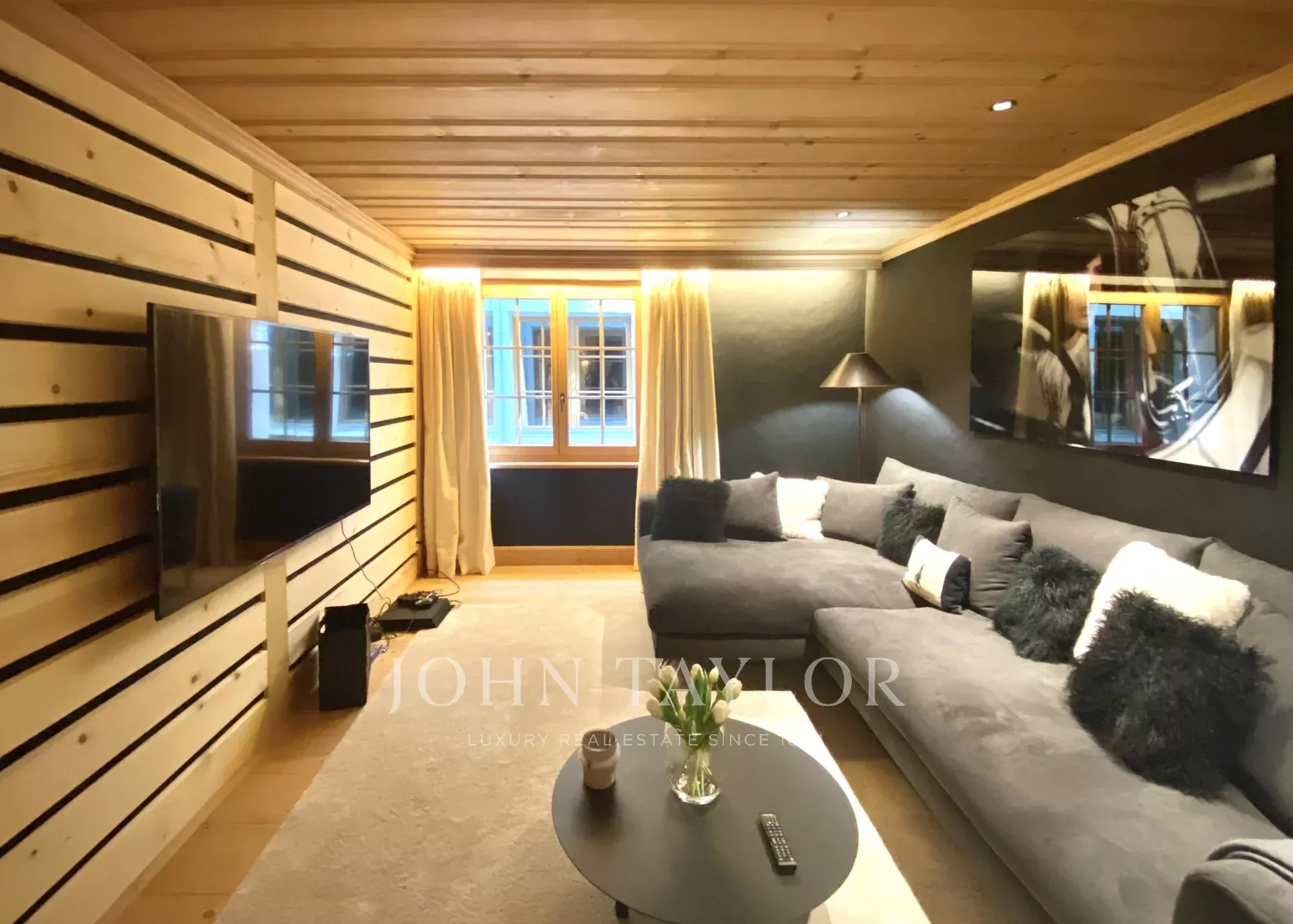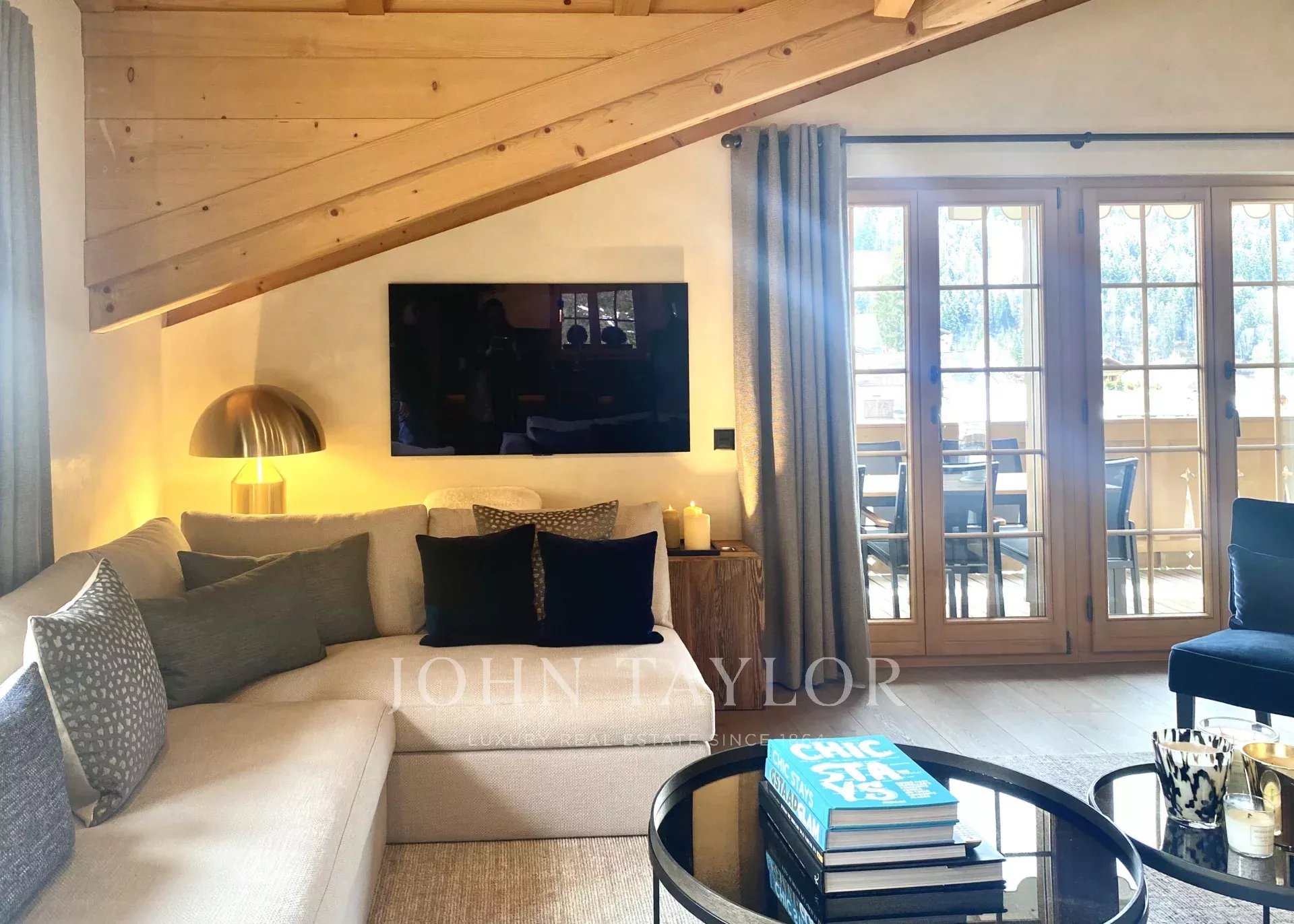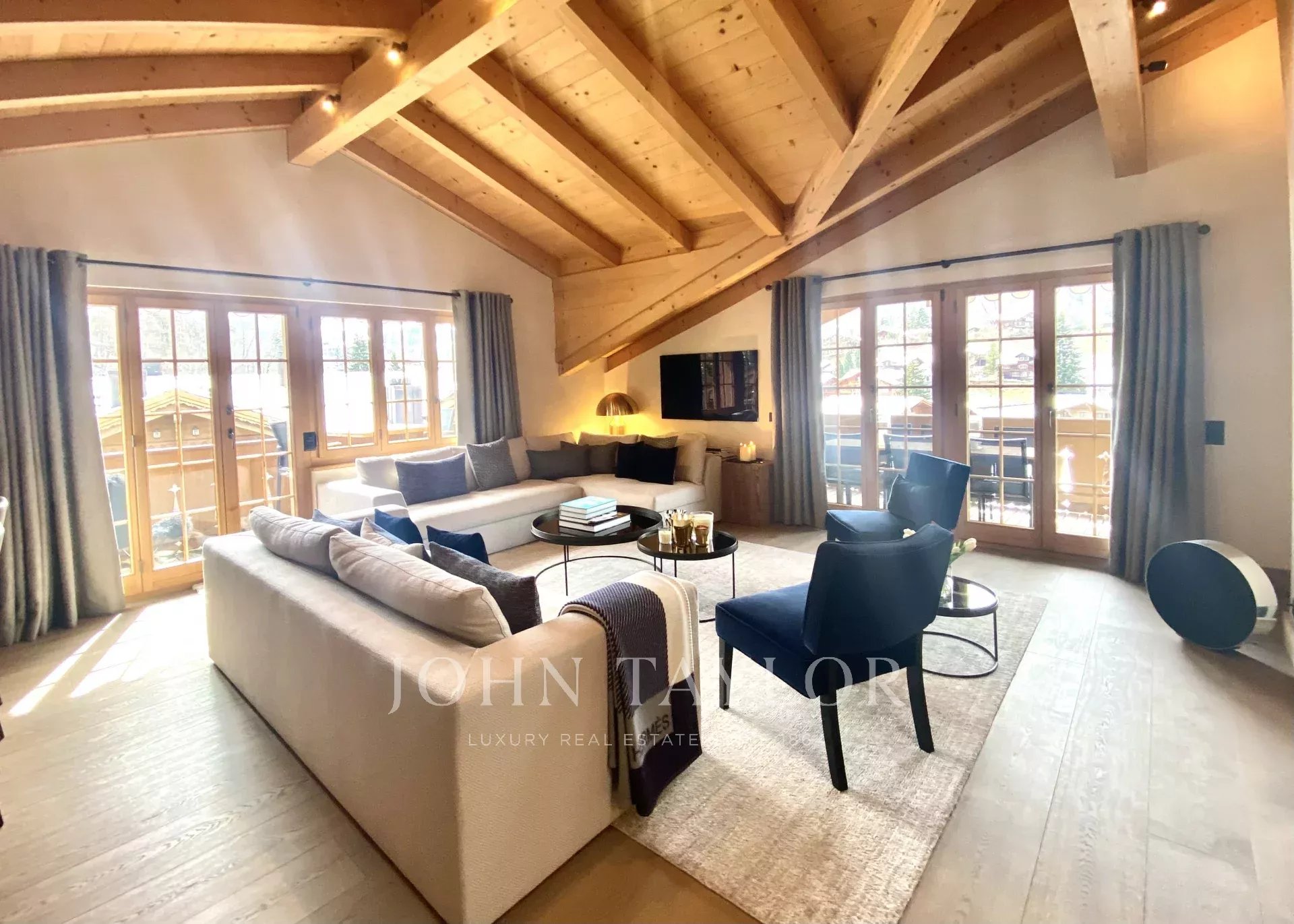 Dieses Penthouse befindet sich 20 Meter von der Promenade von Gstaad entfernt und besticht durch seine hohen Decken, den großen Wohnbereich und den grandiosen Blick auf Gstaad und die umliegenden Berge.