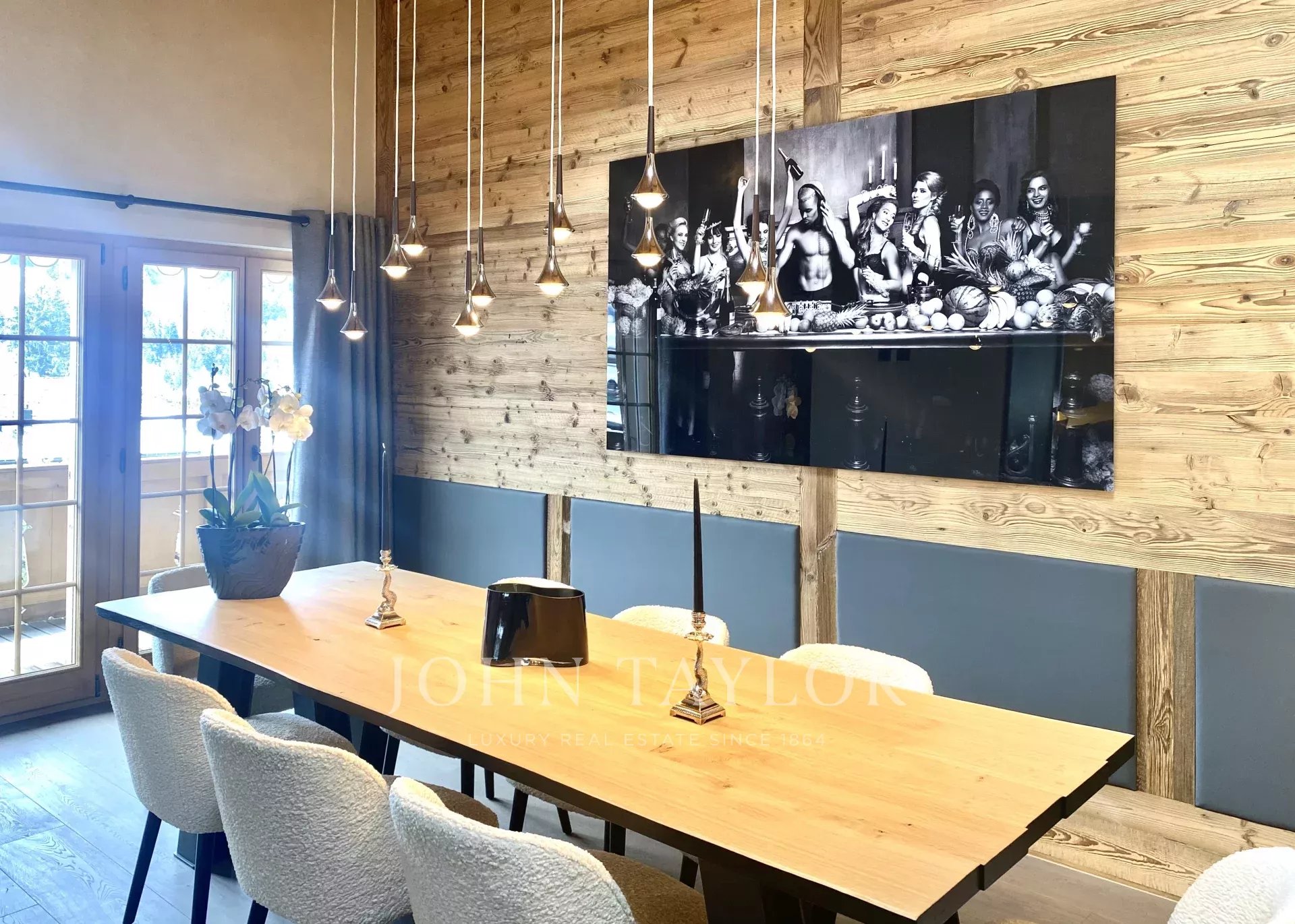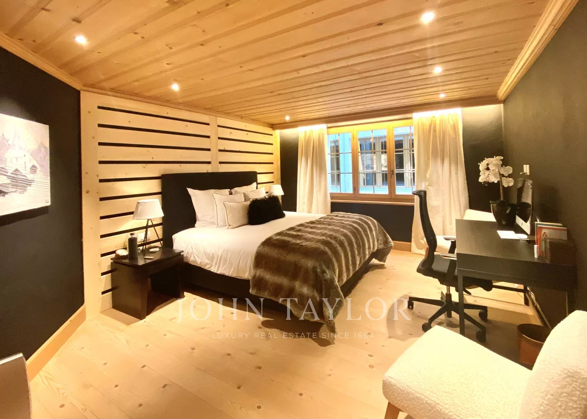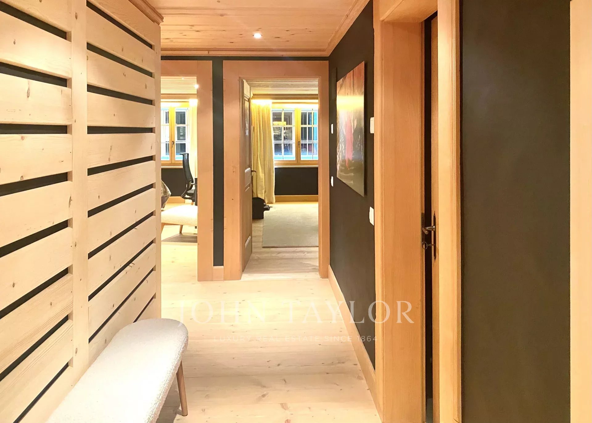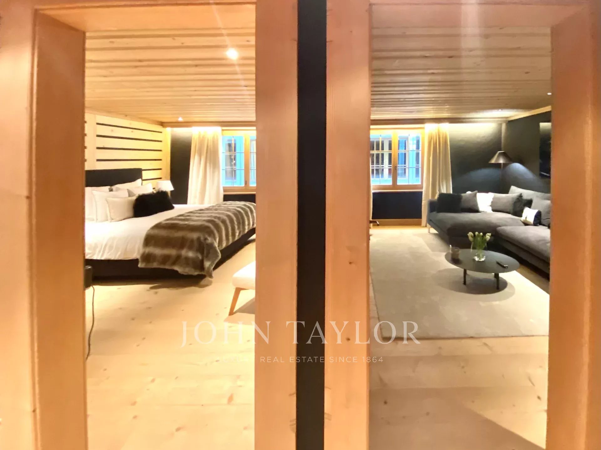 Dieses Penthouse befindet sich 20 Meter von der Promenade von Gstaad entfernt und besticht durch seine hohen Decken, den großen Wohnbereich und den grandiosen Blick auf Gstaad und die umliegenden Berge.