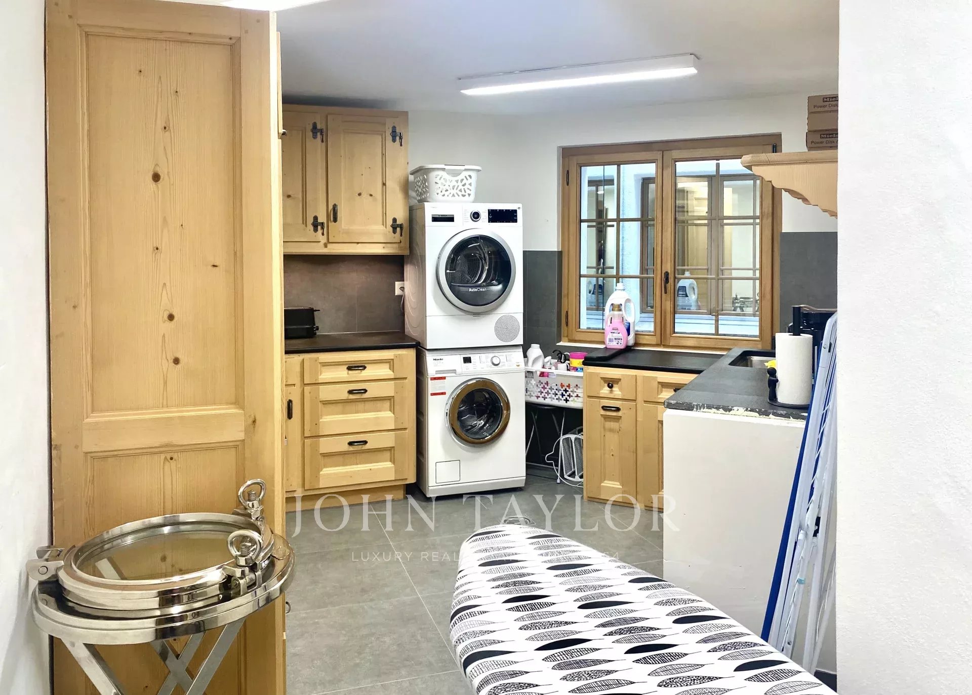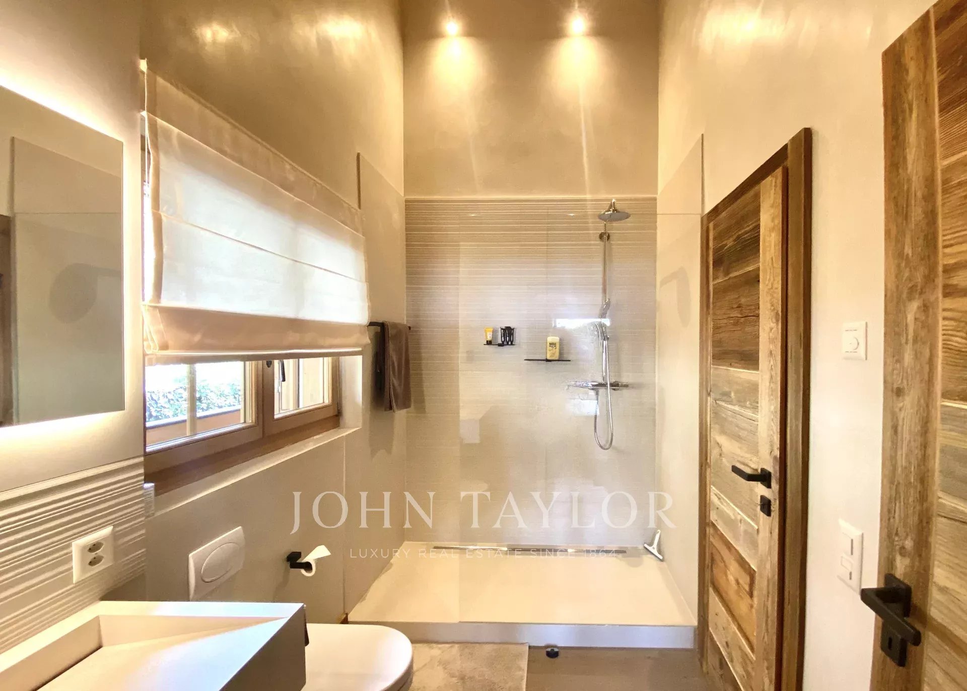 Die Hauptwohnung im obersten Stockwerk ist direkt mit dem Aufzug erreichbar und erstreckt sich auf 120m2 mit 2 Schlafzimmern und 2 Badezimmern. Eine weitere Wohnung mit 2 Schlafzimmern und einem Badezimmer sowie einer separaten Küche von 80m2 befindet sich im Erdgeschoss des Gebäudes.