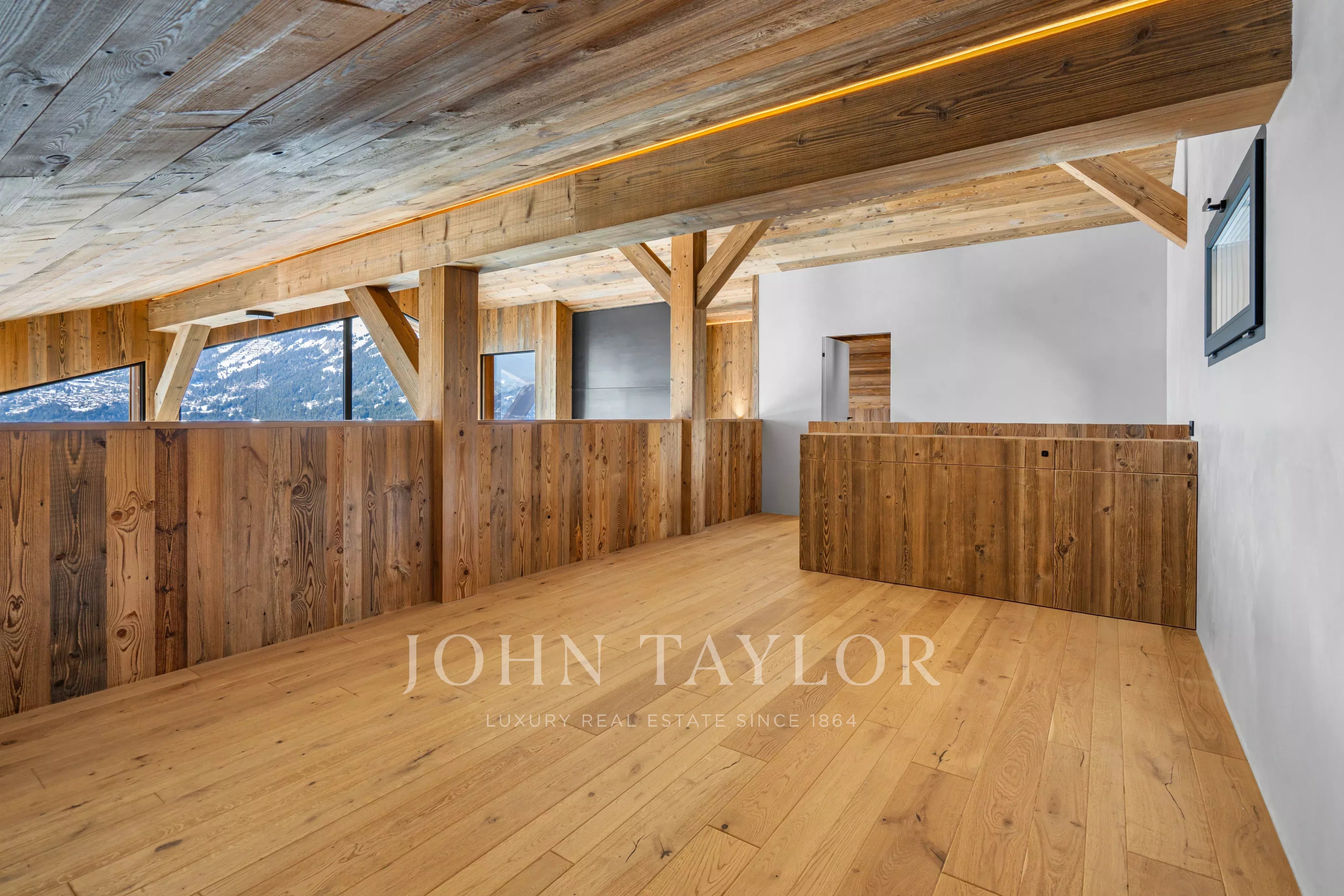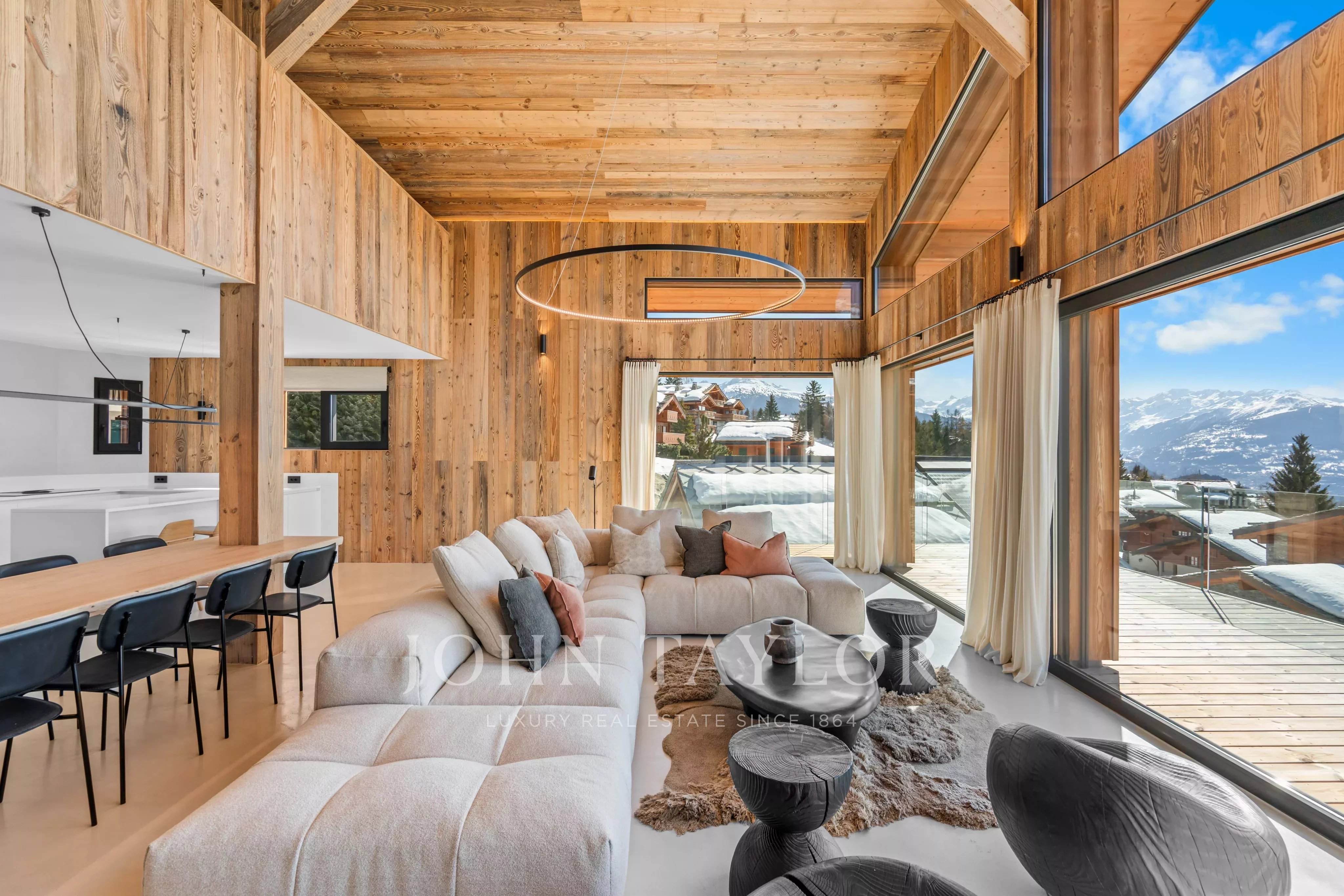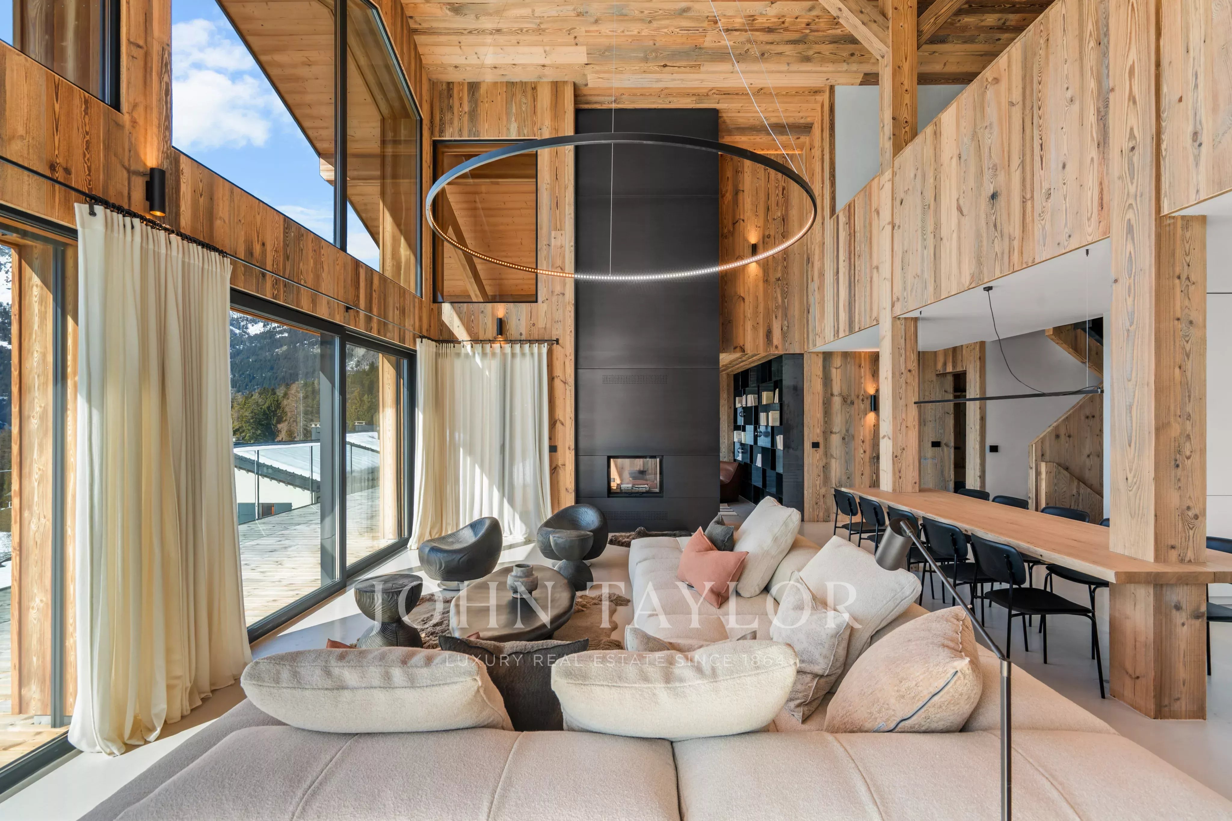 Das auf drei Ebenen verteilte Chalet besticht durch seine bemerkenswerte Helligkeit dank der großen Fensterfronten und der hohen Decken, die den Wohnräumen ein Gefühl von Offenheit und Eleganz verleihen, das in den Bergen selten anzutreffen ist.