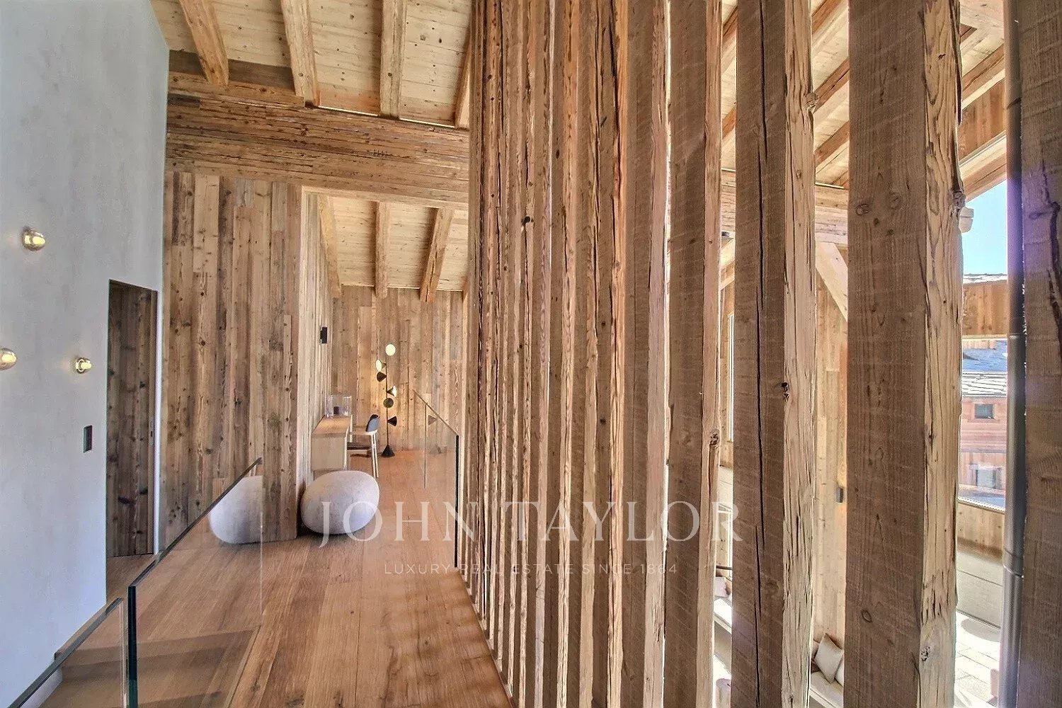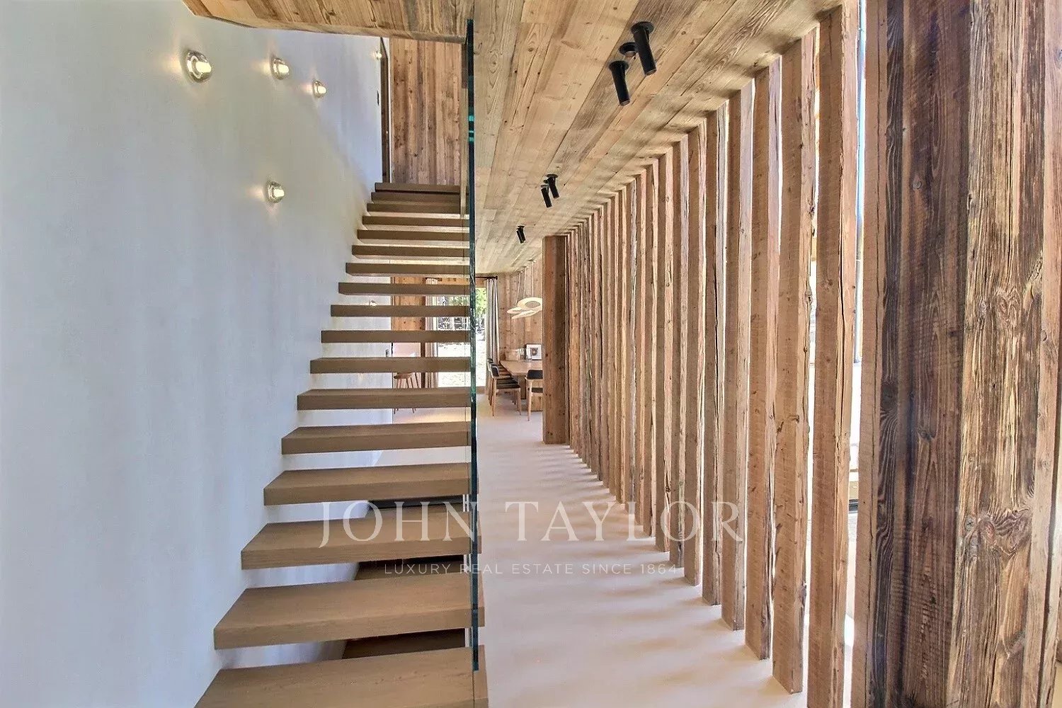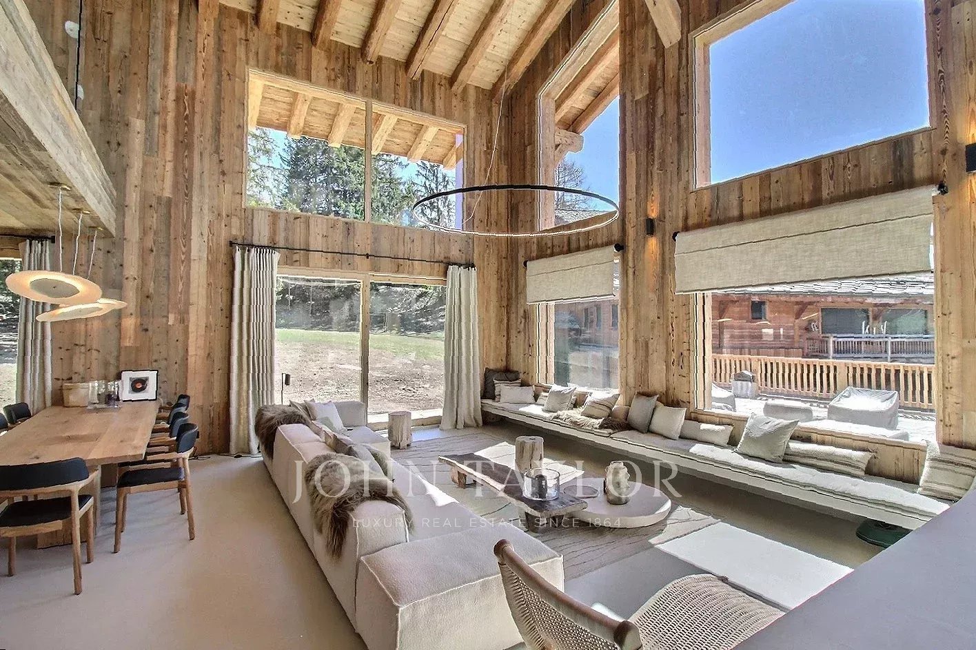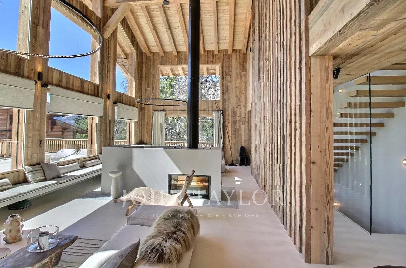 Das Chalet bietet eine warme und aktuelle Atmosphäre in einem modernisierten alpinen Geist: großes Wohnzimmer mit schöner Deckenhöhe, große Öffnungen nach Südwesten, ein sichtbarer Dachstuhl aus Massivholz und ein doppelseitiger Kamin, der in das Wohnzimmer integriert ist.