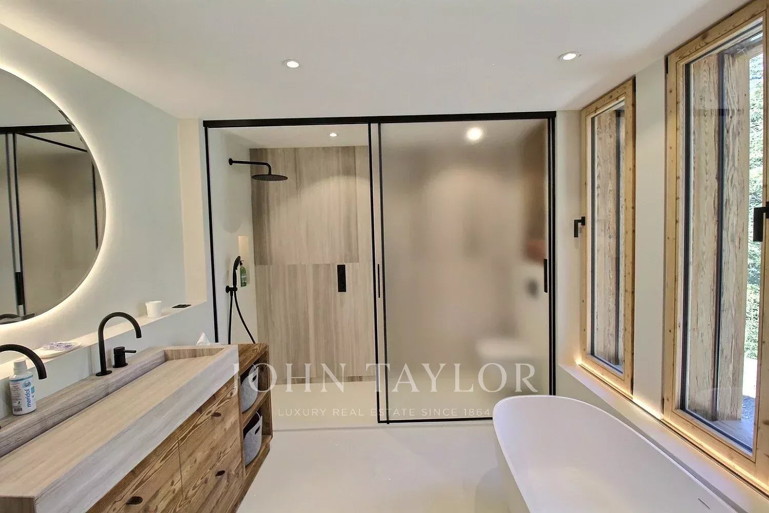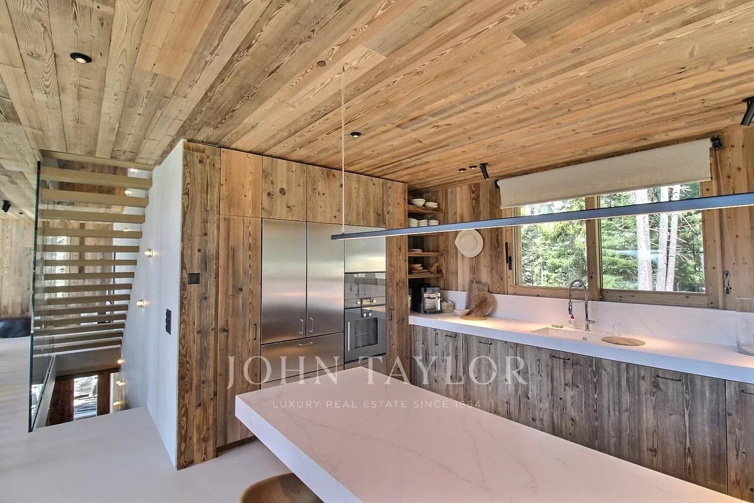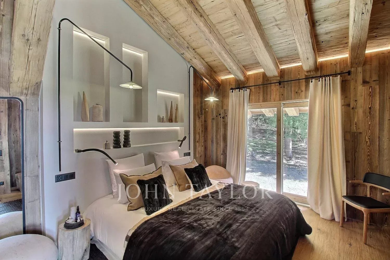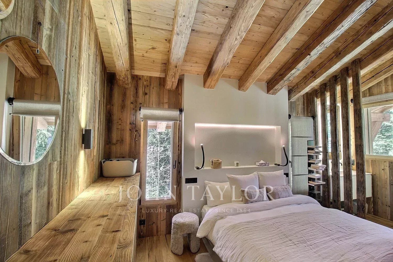 Das Chalet bietet eine warme und aktuelle Atmosphäre in einem modernisierten alpinen Geist: großes Wohnzimmer mit schöner Deckenhöhe, große Öffnungen nach Südwesten, ein sichtbarer Dachstuhl aus Massivholz und ein doppelseitiger Kamin, der in das Wohnzimmer integriert ist.