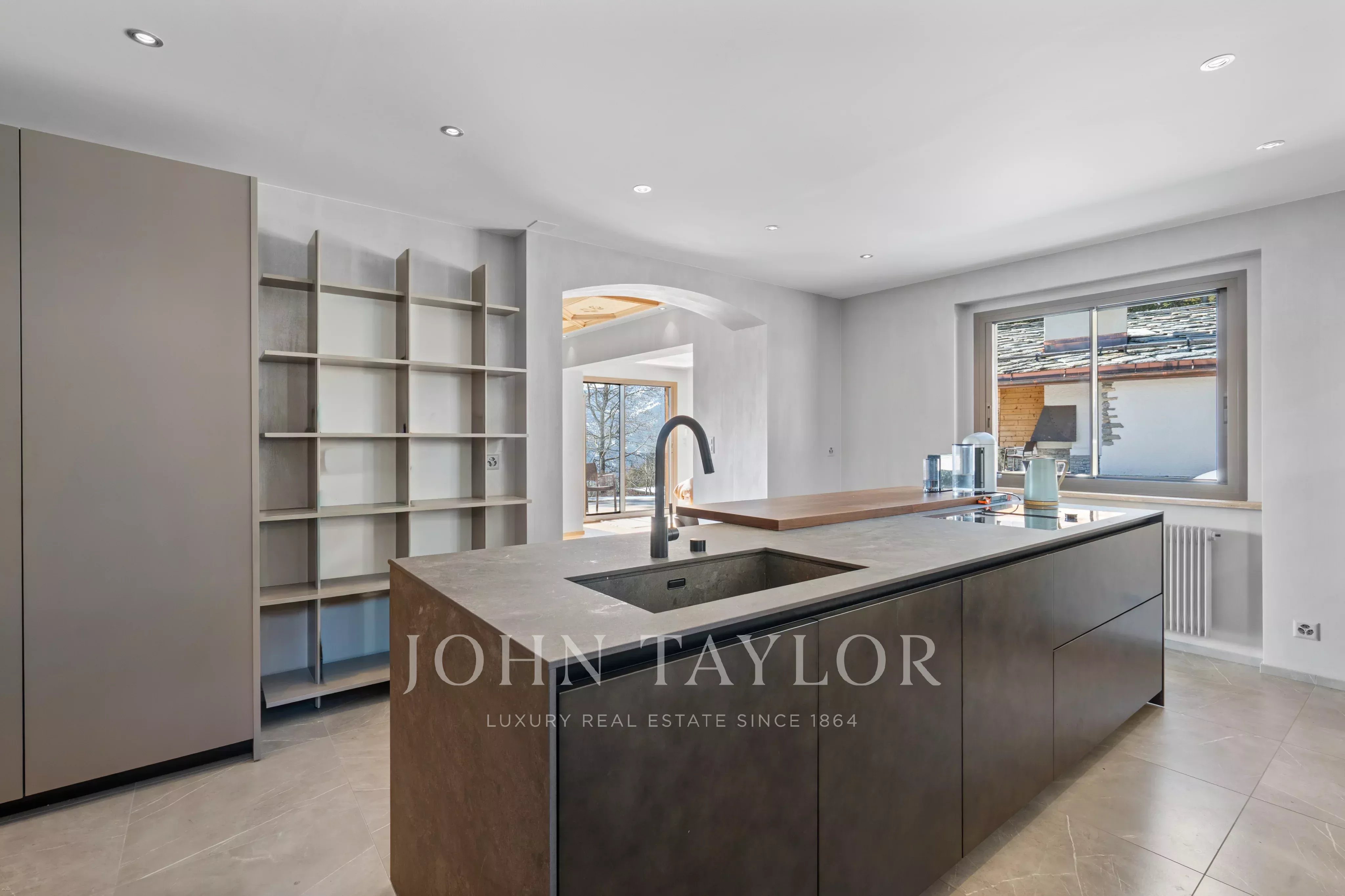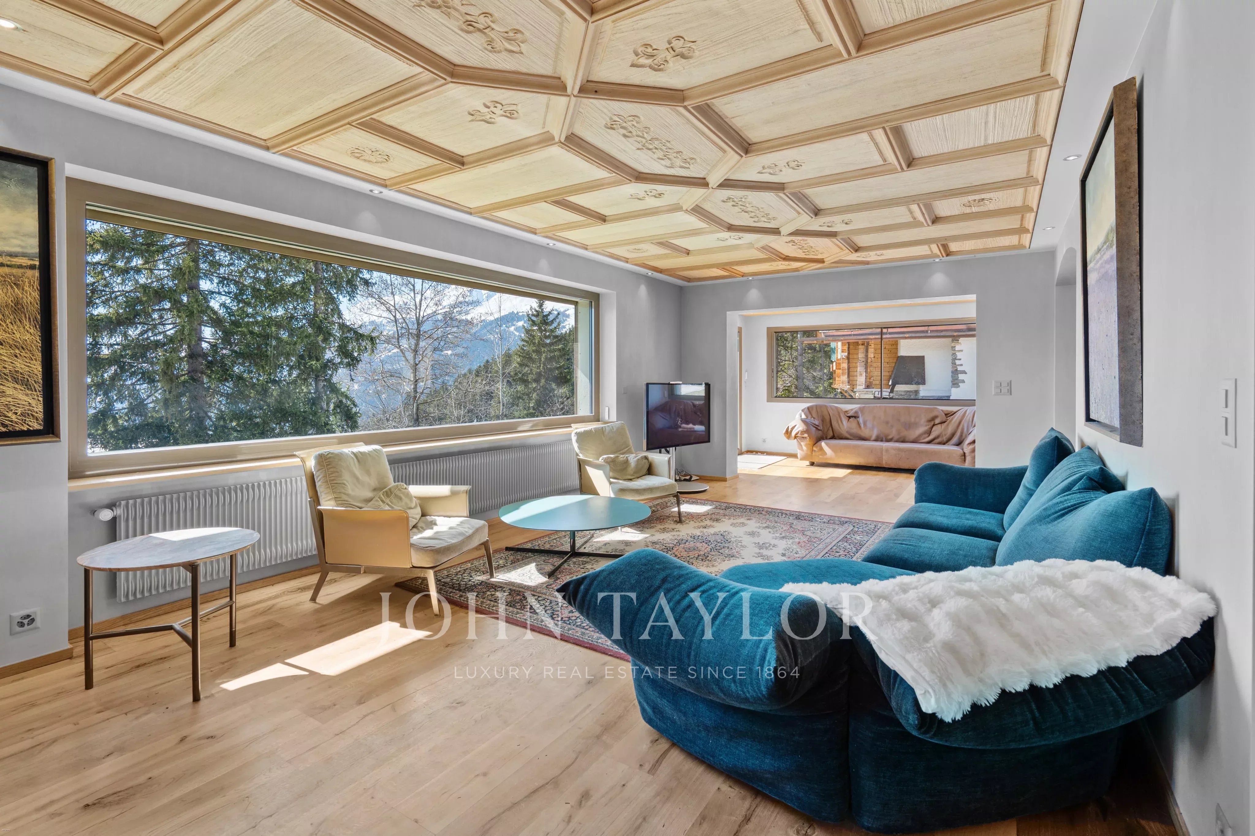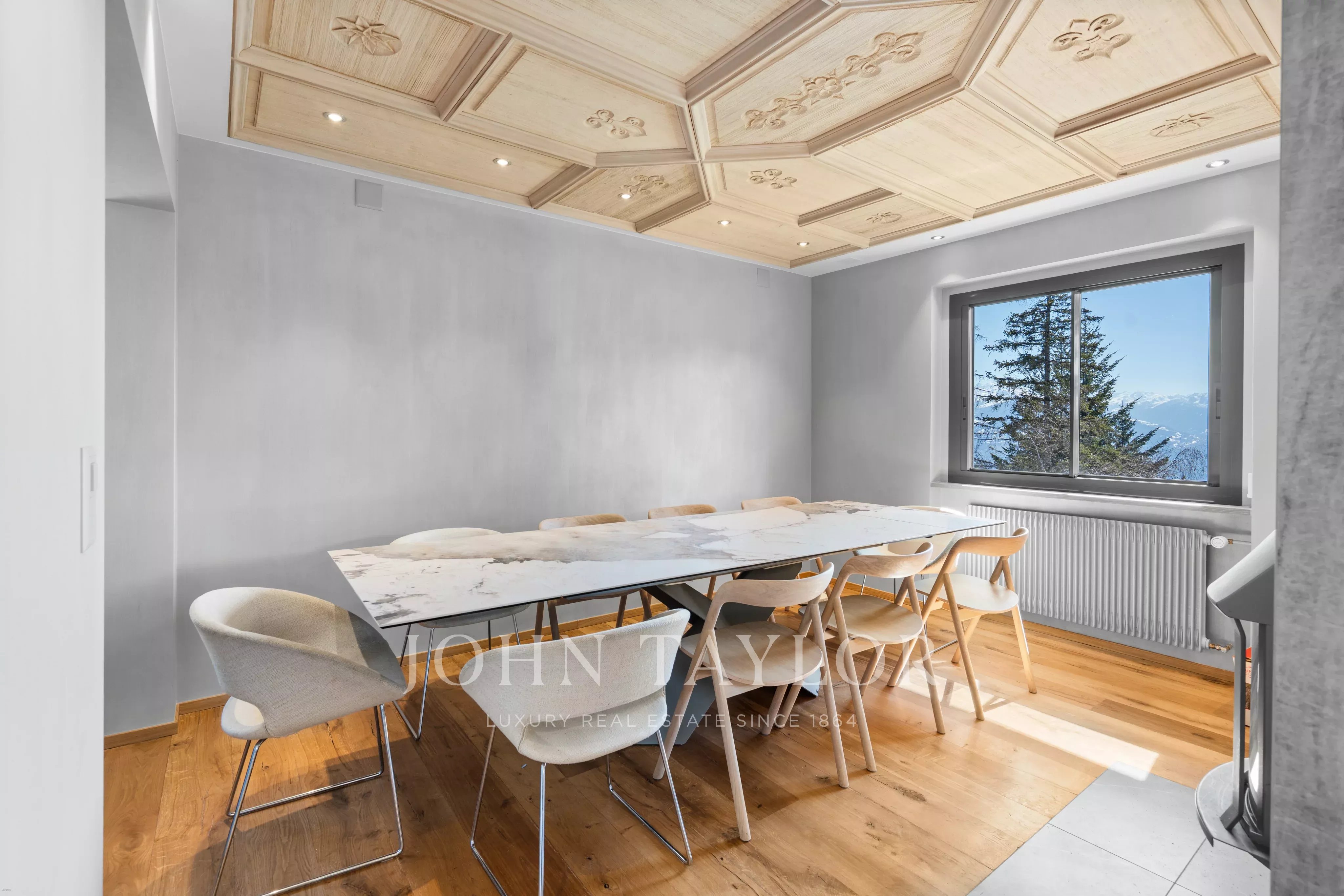 Das Anwesen liegt am westlichen Ortseingang von Crans-Montana und verfügt zudem über einen Innenpool, ein 25 m² großes Studio sowie eine Doppelgarage.