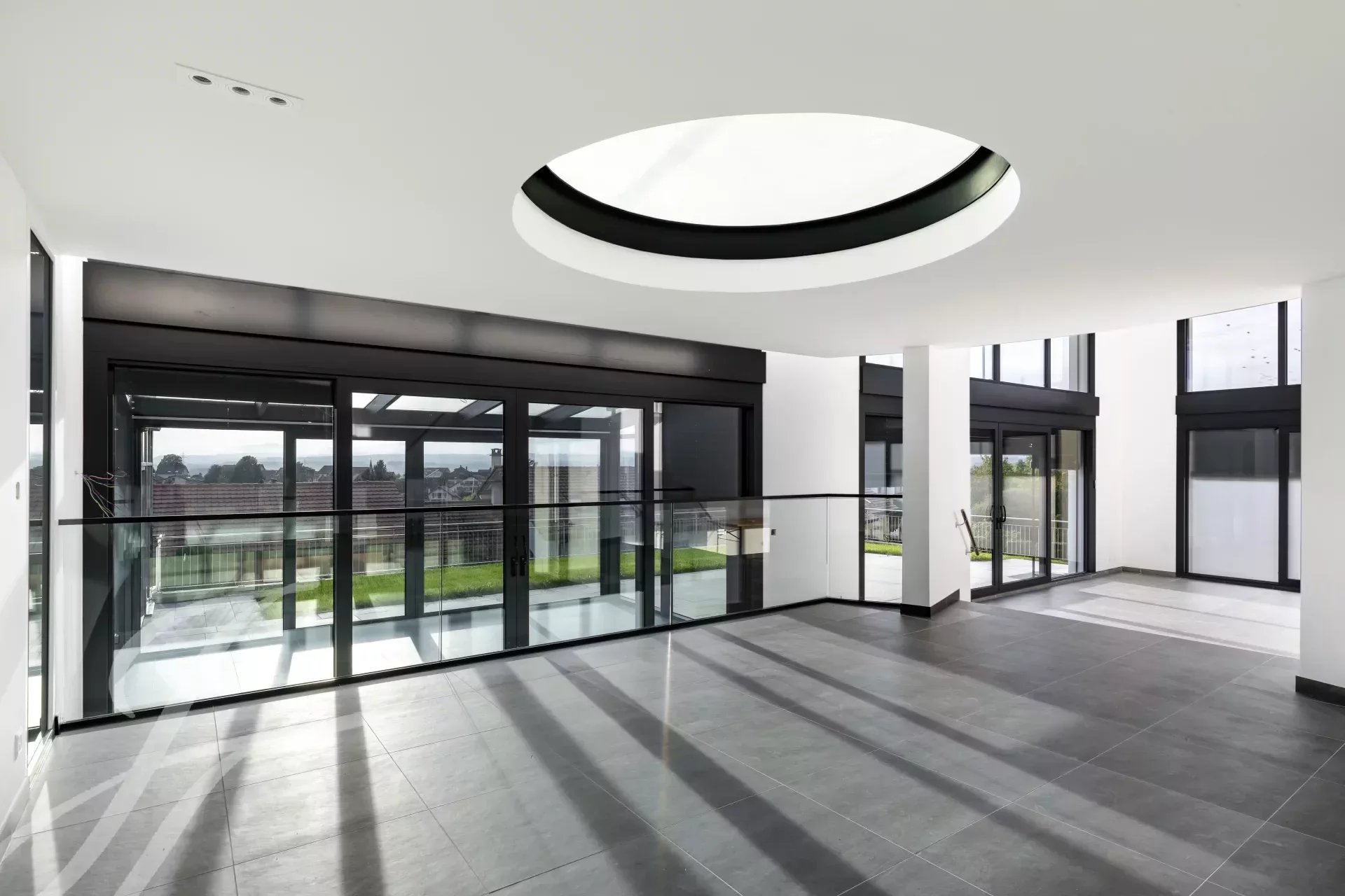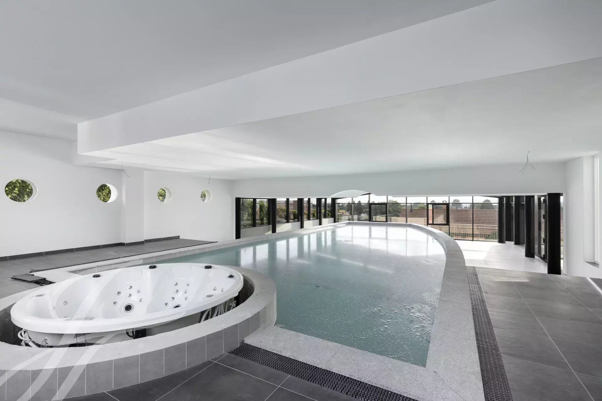 Im Erdgeschoss befinden sich ein geräumiges Wohn- und Esszimmer mit großen Fenstern und einer Deckenhöhe von sechs Metern, ein Büro, eine Veranda und ein prächtiger Wellnessbereich mit einem Jacuzzi und einem hellen Innenpool.