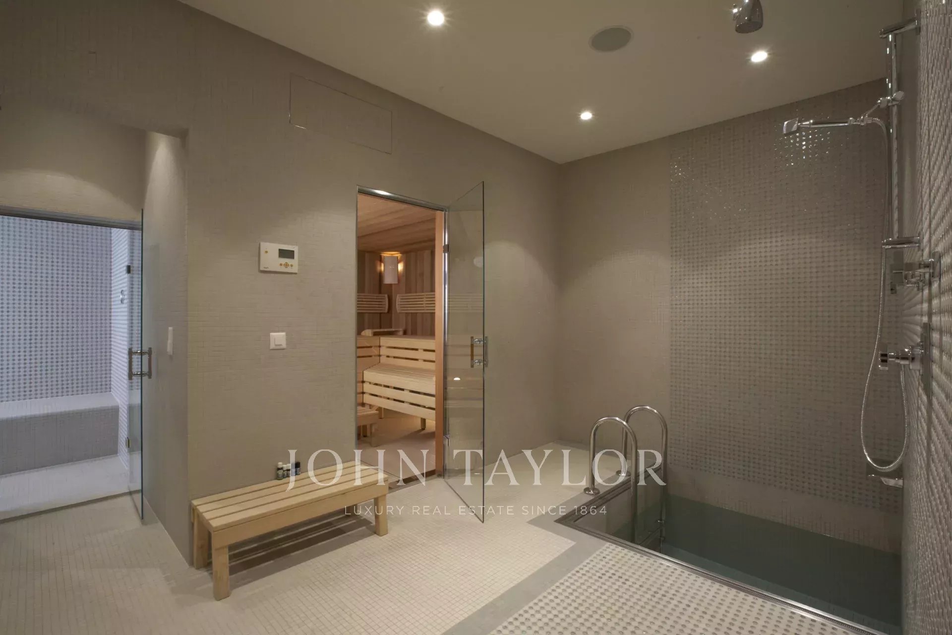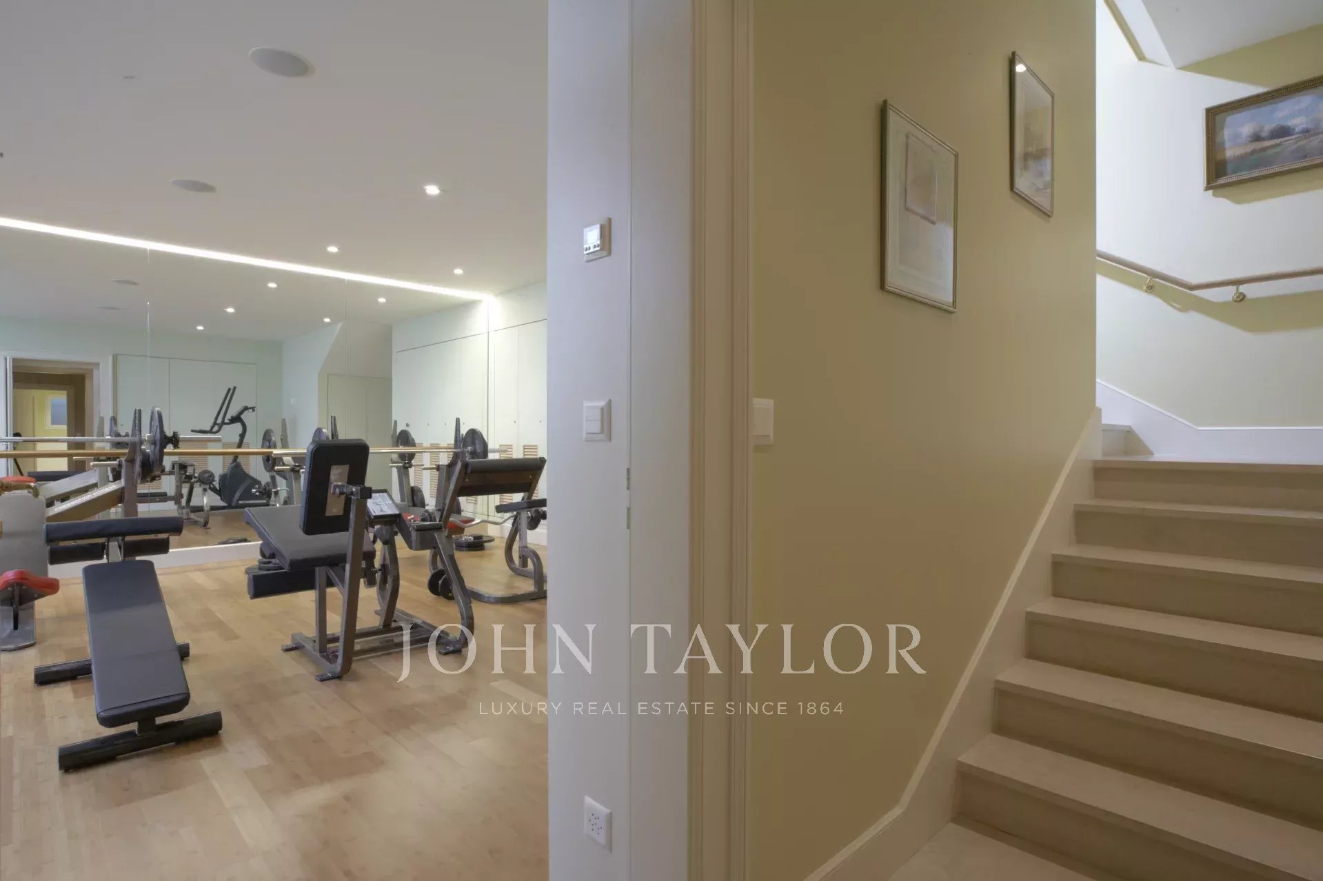 Ein Fitnessraum, ein Spa mit Dampfbad, Sauna und Massageraum, ein Weinkeller, eine professionelle Waschküche, zahlreiche Stauräume, eine gesicherte Garage für sechs Autos sowie eine zweite überdachte Garage für ebenfalls sechs Autos vervollständigen diese außergewöhnliche Immobilie.