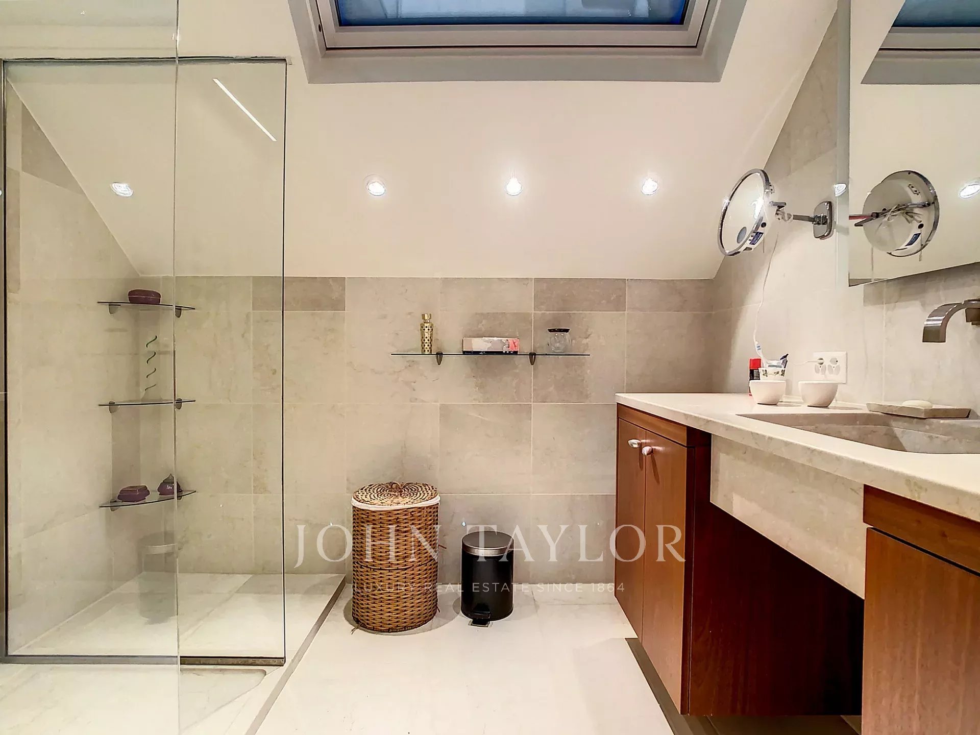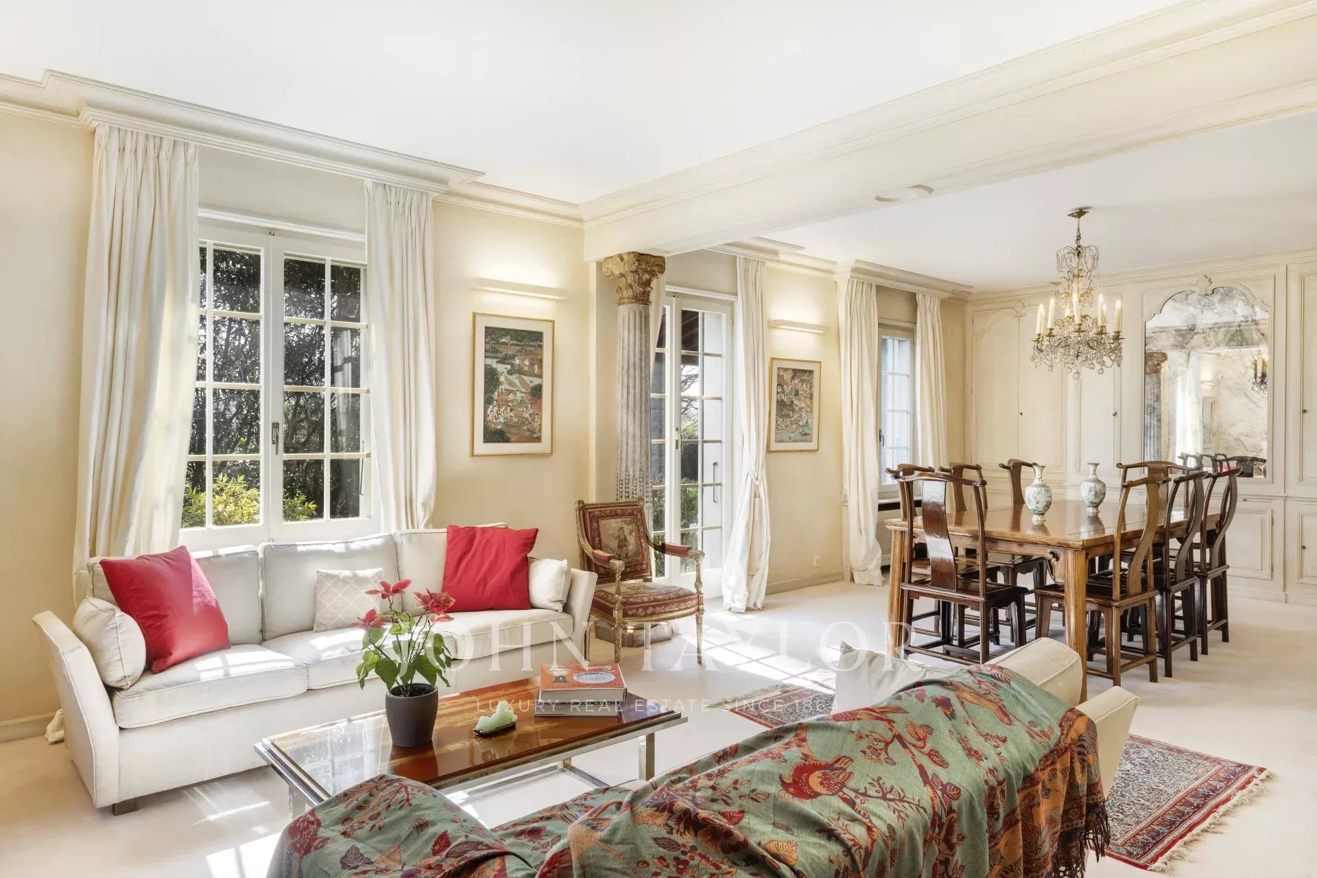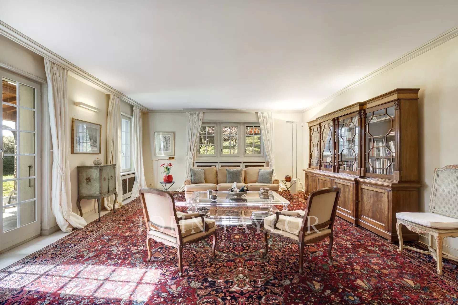 Auf zwei Ebenen und einem Untergeschoss verteilt, bietet das Erdgeschoss mit seiner doppelten Rezeption zwei Salons, darunter ein großes Wohnzimmer mit einem Kamin.