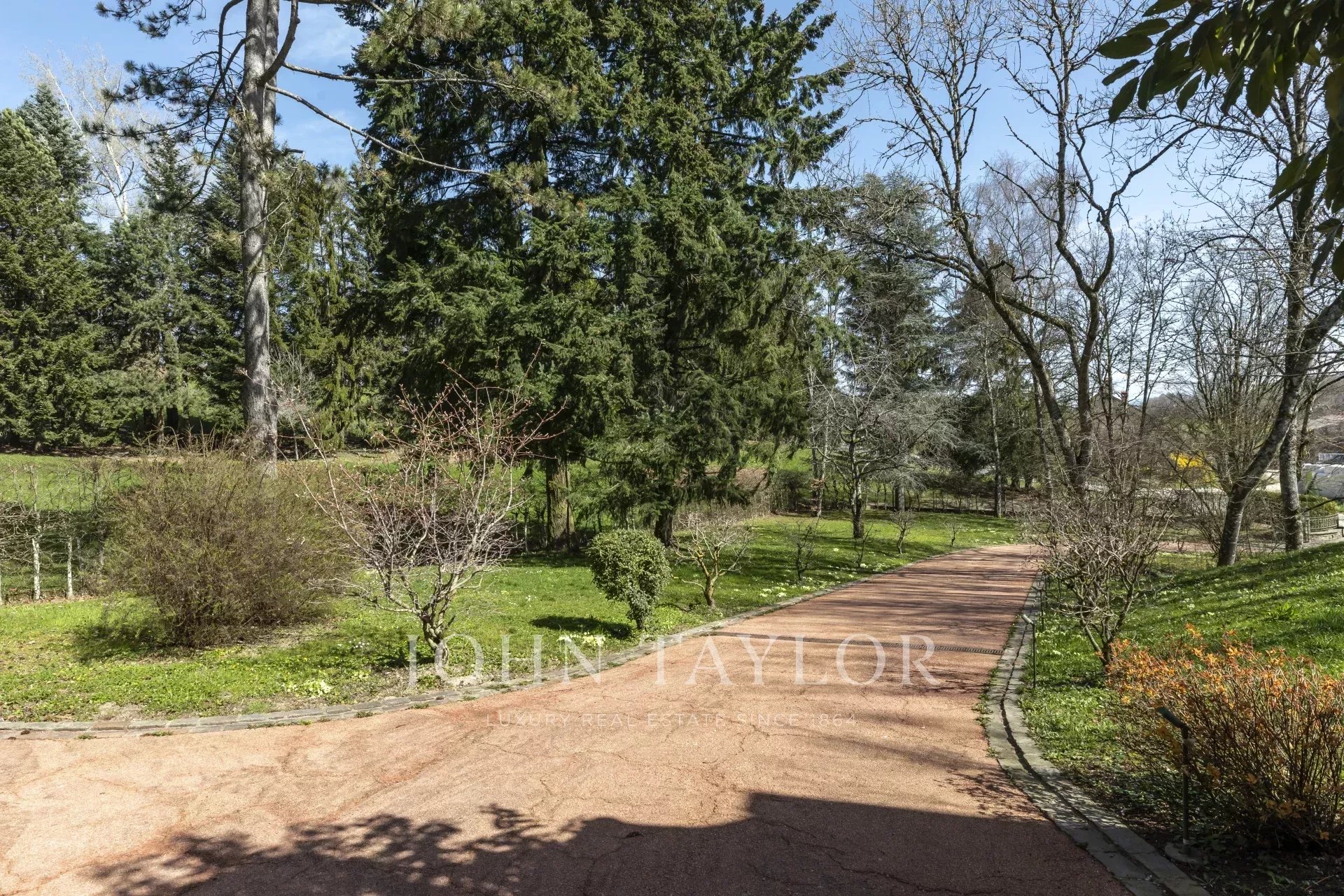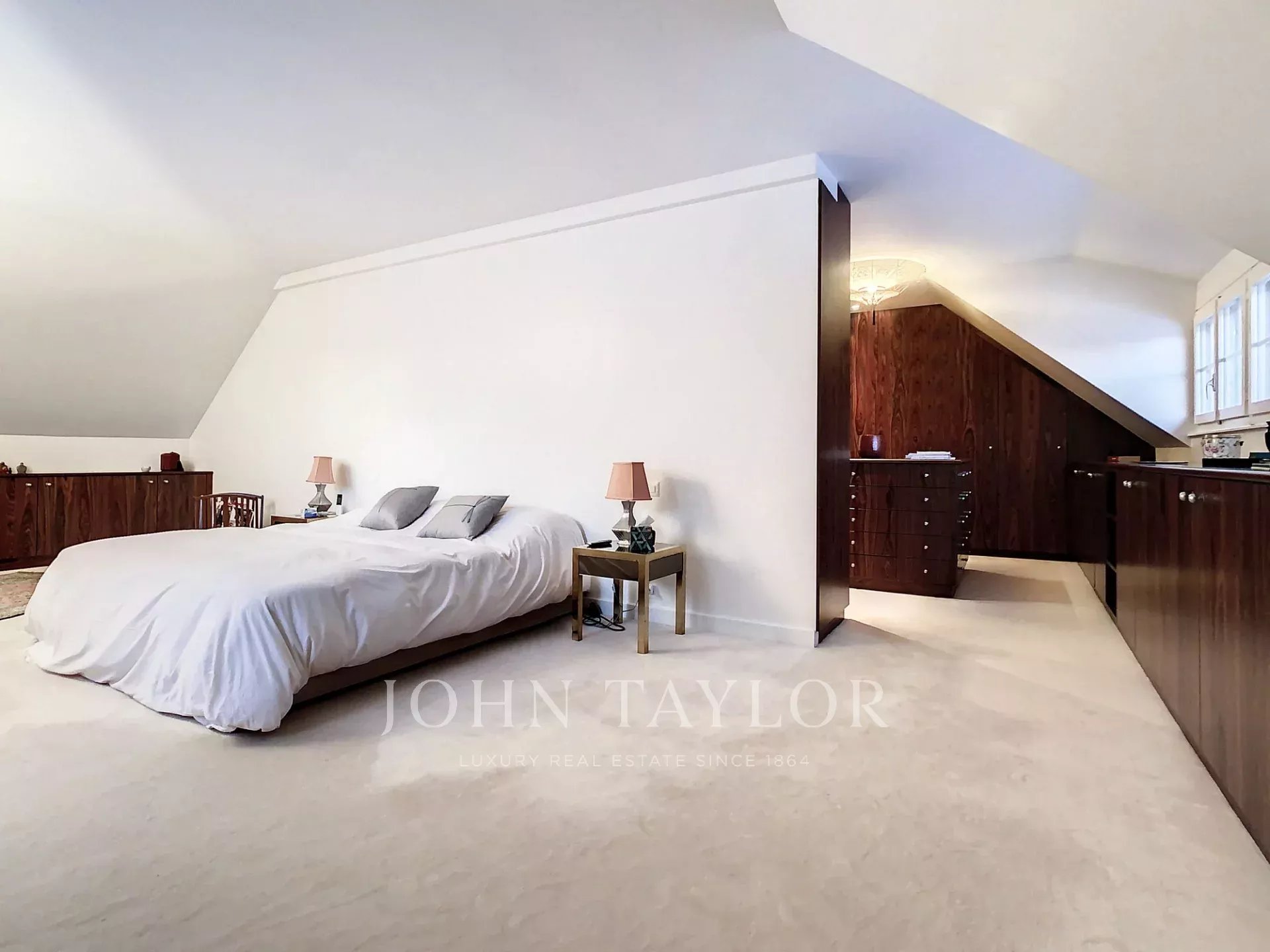 Im Obergeschoss befinden sich mehrere Schlafzimmer, zusätzliche Bäder und eine Master-Suite mit einem herrlichen Ankleidezimmer. Alle Zimmer bieten einen Ausblick auf den Park des Anwesens.