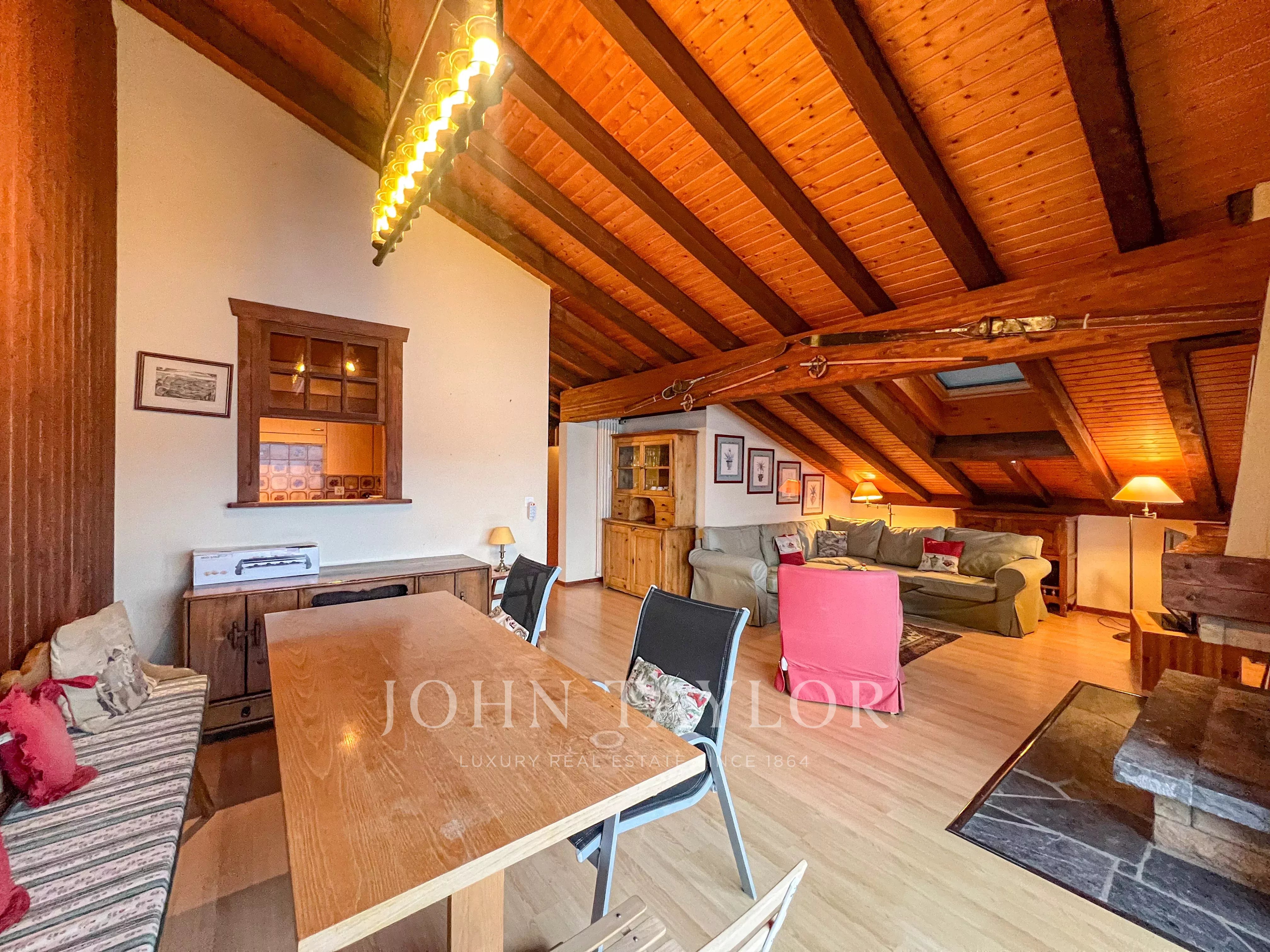 Der helle Wohnbereich lädt nach einem Tag auf der Piste zum Entspannen ein, während die voll ausgestattete Küche den Alltag erleichtert. Eine private Terrasse bietet die Möglichkeit, die frische Bergluft und die umliegende Landschaft zu genießen.