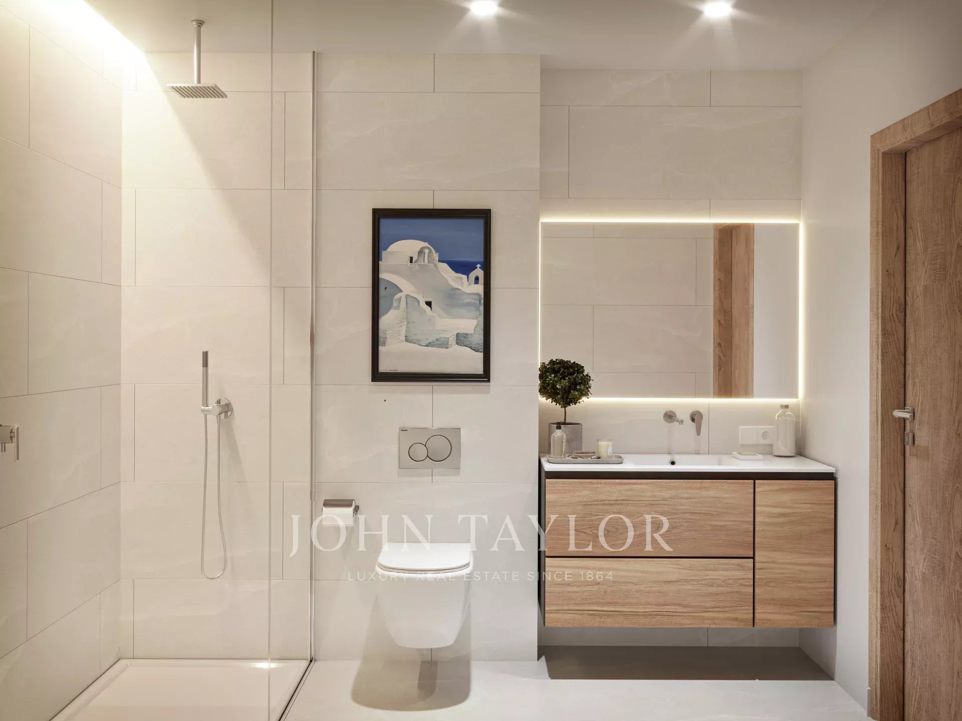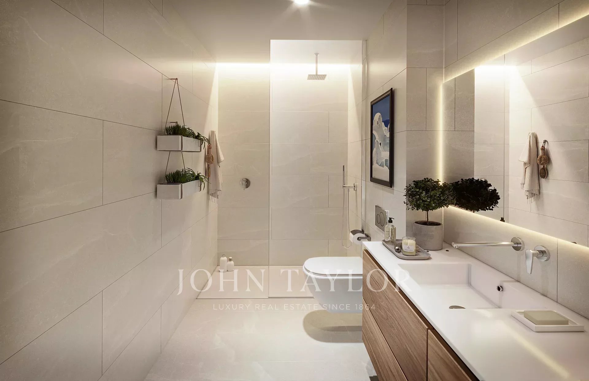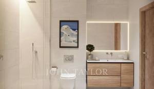 Die Bäder sind mit einem hölzernen Hängeschrank mit einem oder zwei Waschbecken, einer Dusche mit Duschwanne und eingelassenen Armaturen aus dem Hause Tres ausgestattet. Die Fertigstellung ist für März 2026 vorgesehen.