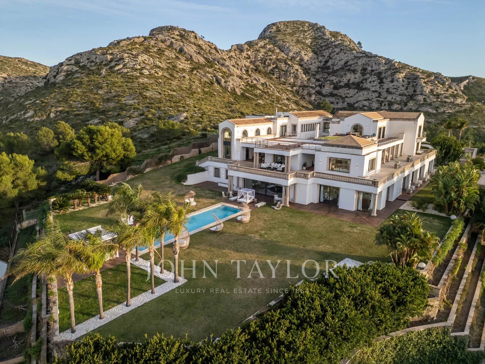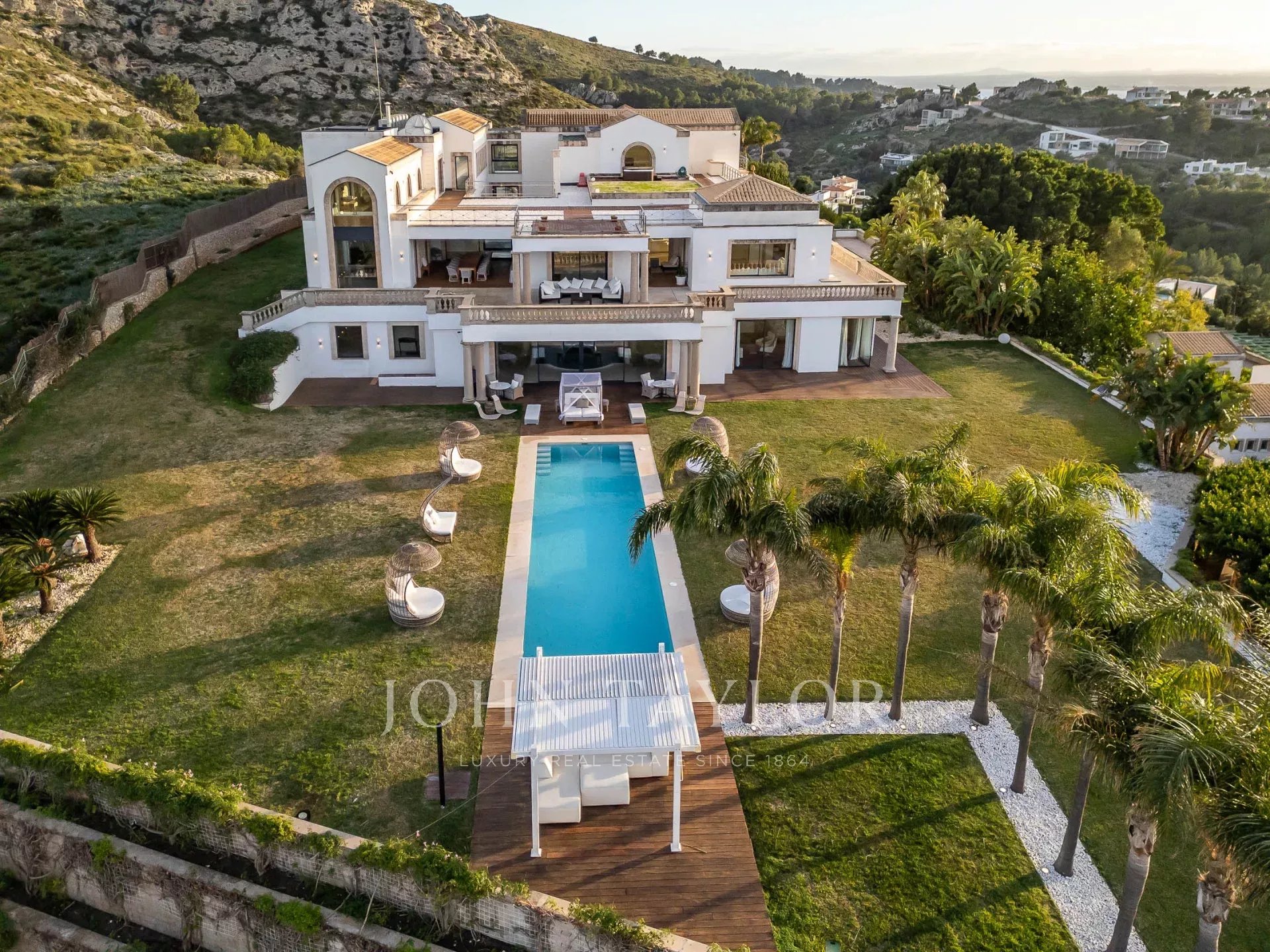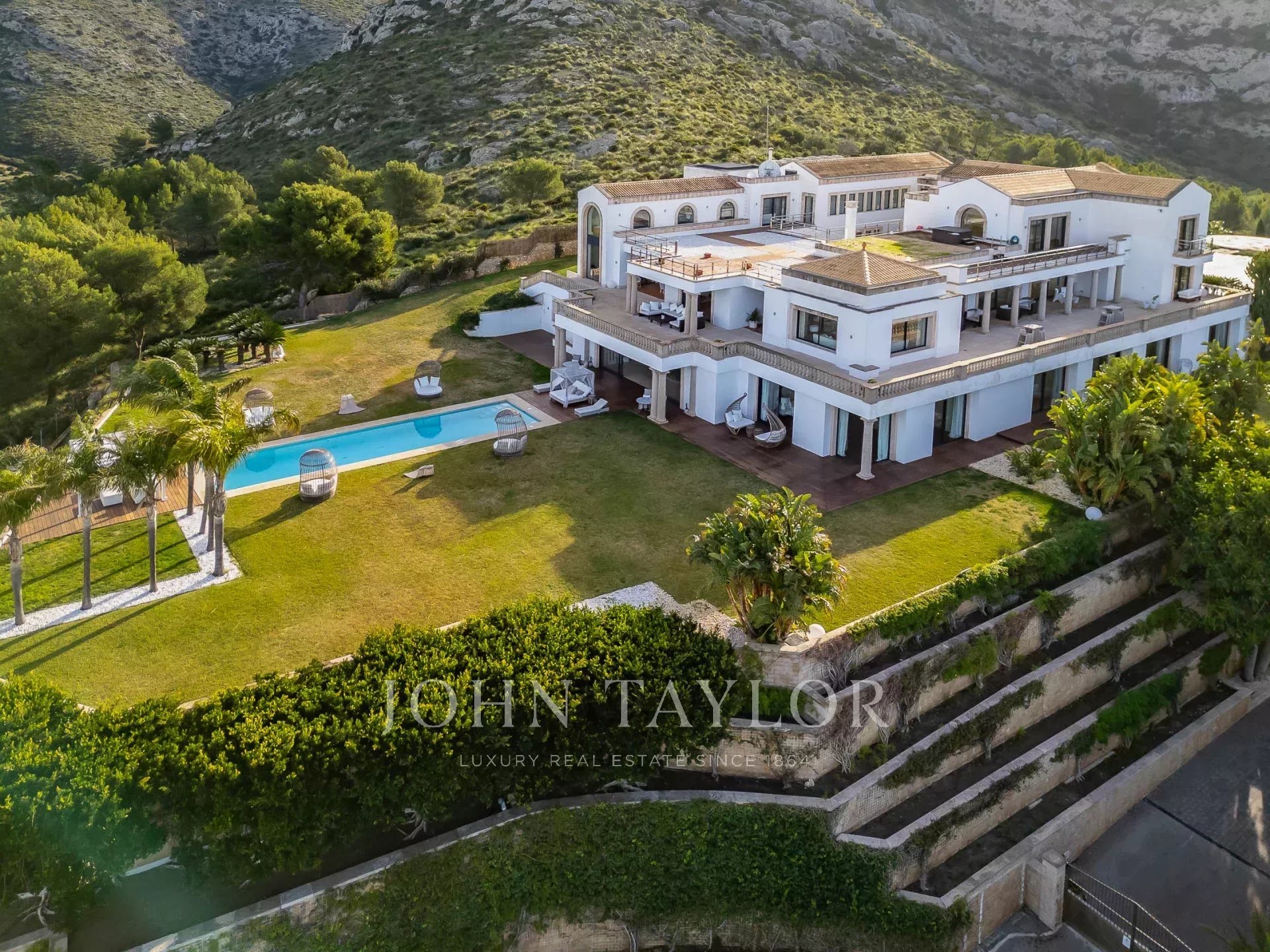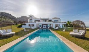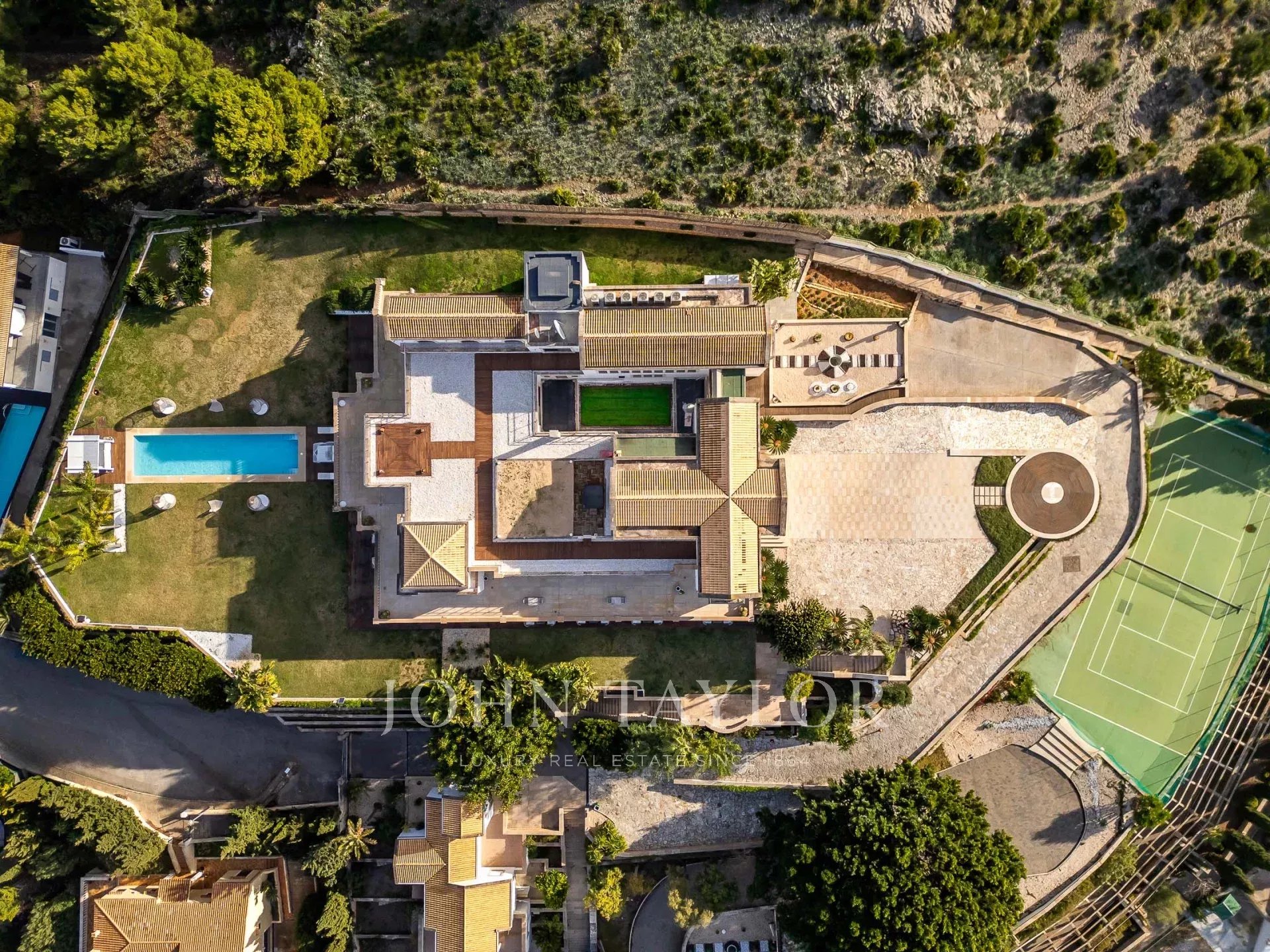 Der Außenbereich des Anwesens bietet eine Reihe von verschiedenen Bereichen für Mahlzeiten im Freien und Unterhaltung für große und kleine Gruppen, einen Swimmingpool, gepflegte Gärten, einen Tennisplatz, das Gewächshaus und einen Hubschrauberlandeplatz für den direkten Zugang zum Anwesen.