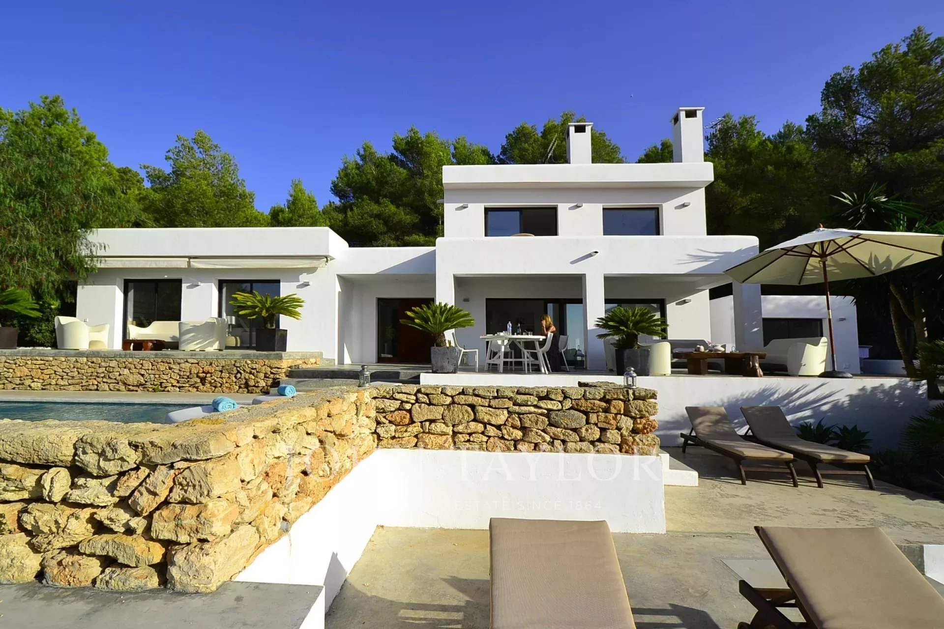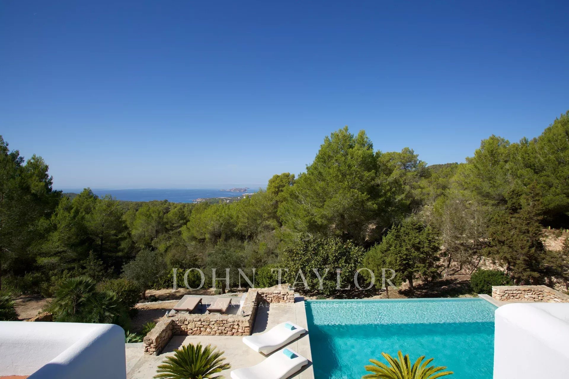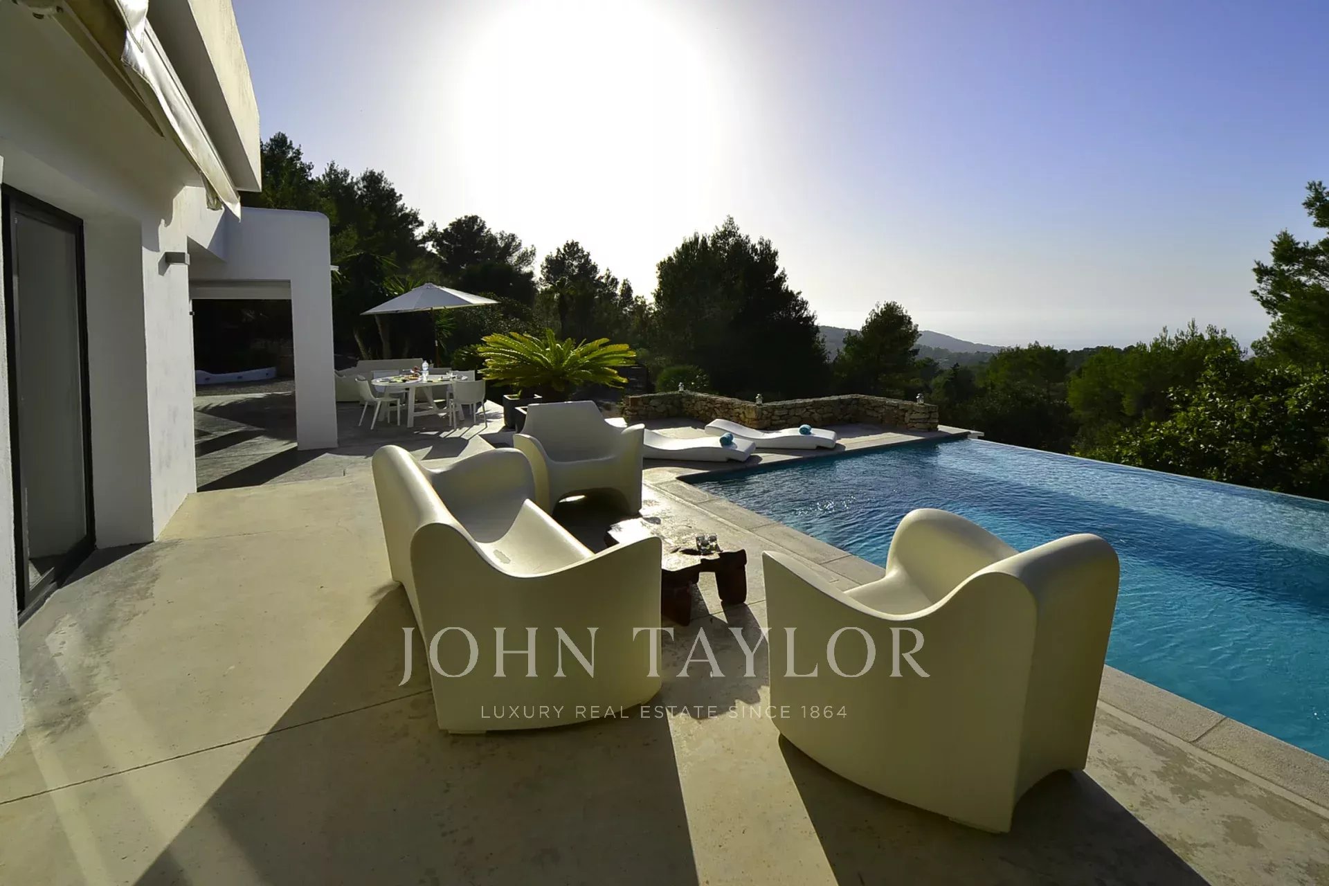 Diese moderne Villa, die malerisch auf einem Hügel zwischen San José und Cala Tarida liegt, lädt dich ein, einen exklusiven Lebensstil mit atemberaubendem Blick auf das Meer und die ibizenkische Landschaft zu genießen. Beim Betreten wirst du von einem hellen Wohnzimmer und einem einladenden Essbereich empfangen, die mit Klimaanlage und einem Soundsystem ausgestattet sind, das die perfekte Atmosphäre schafft. Der Kamin verleiht dem Raum eine warme und gemütliche Note, während die großen Fenster das natürliche Licht hereinlassen und den Raum mit der Terrasse und dem Pool verbinden.