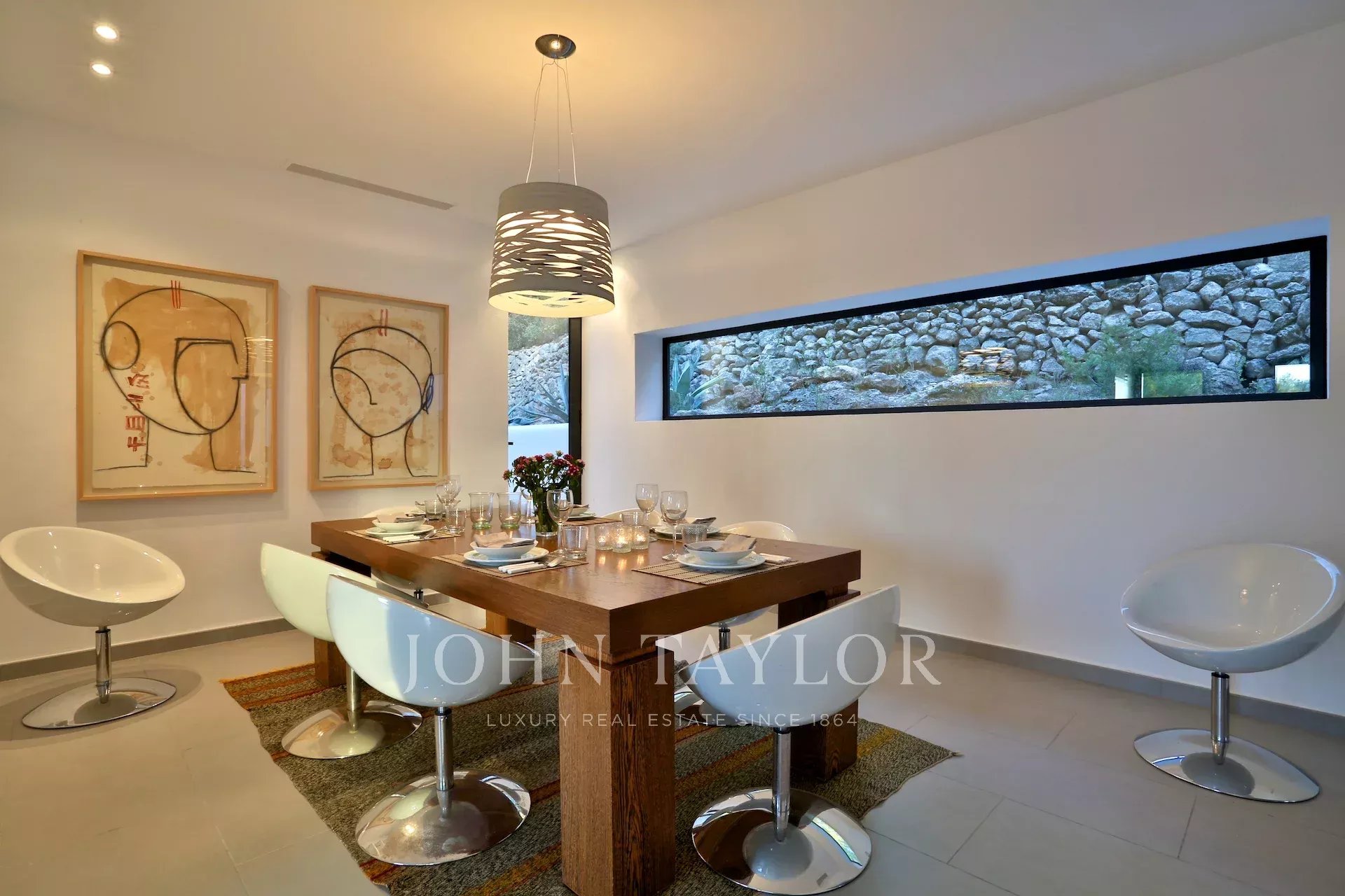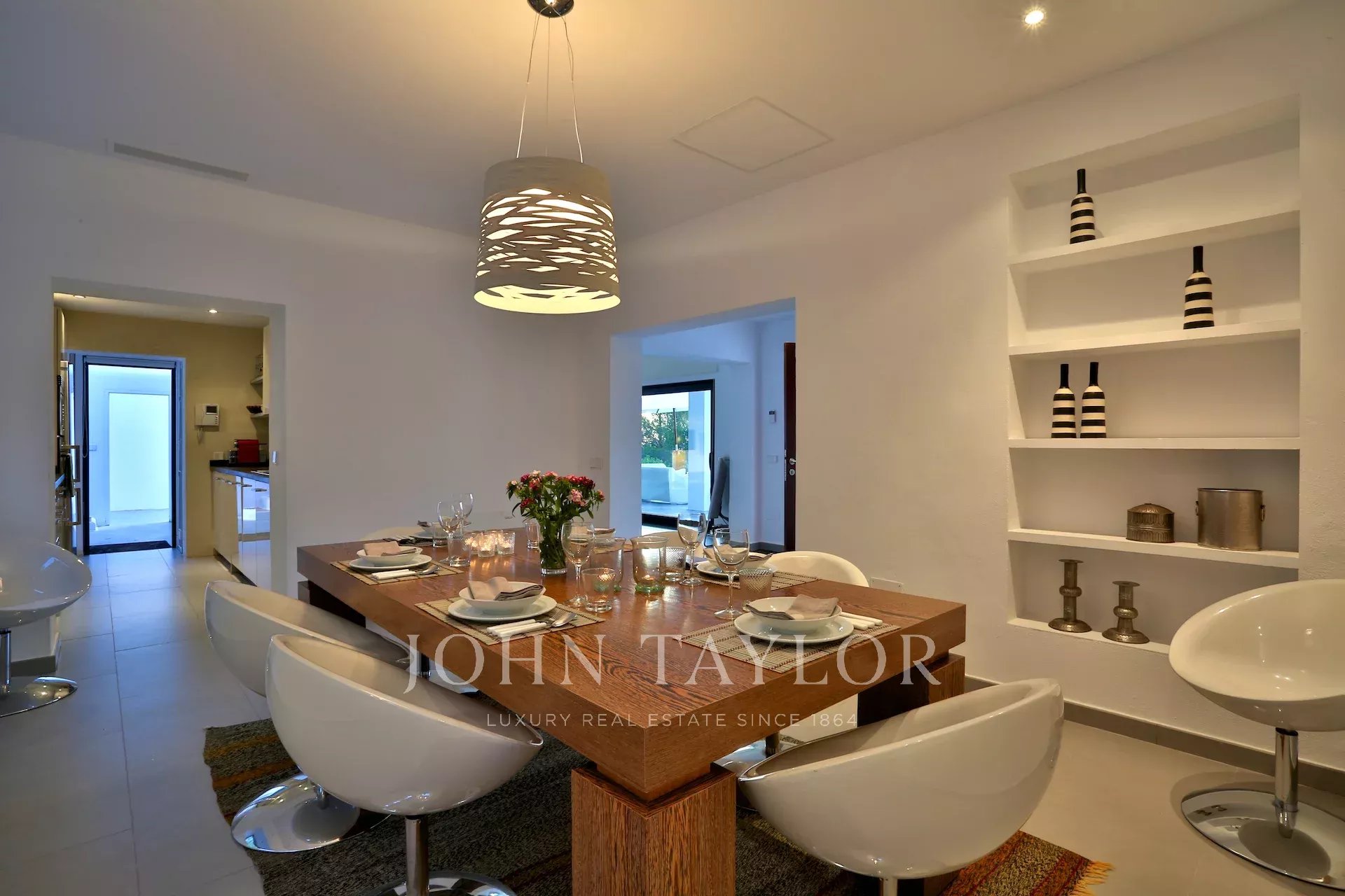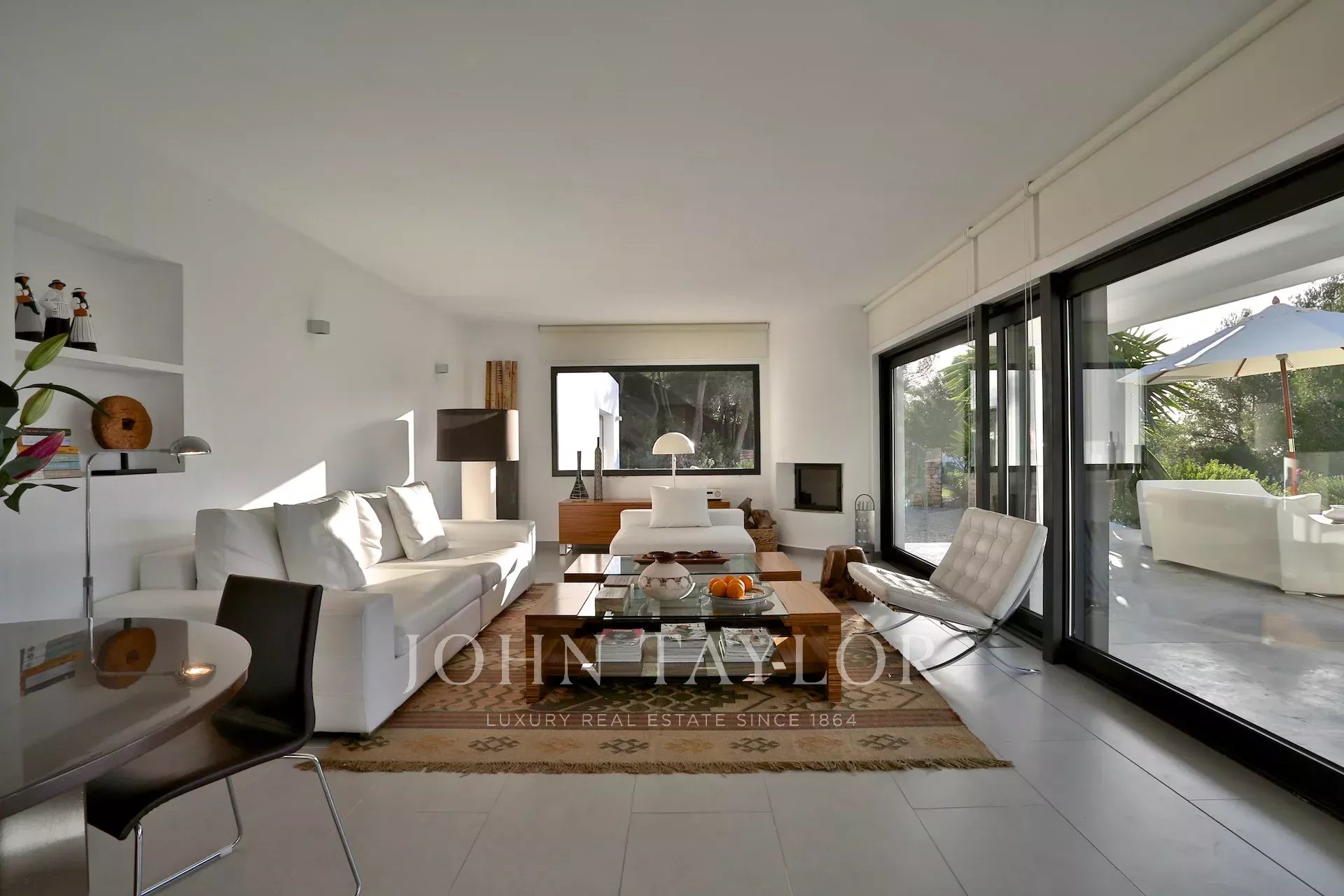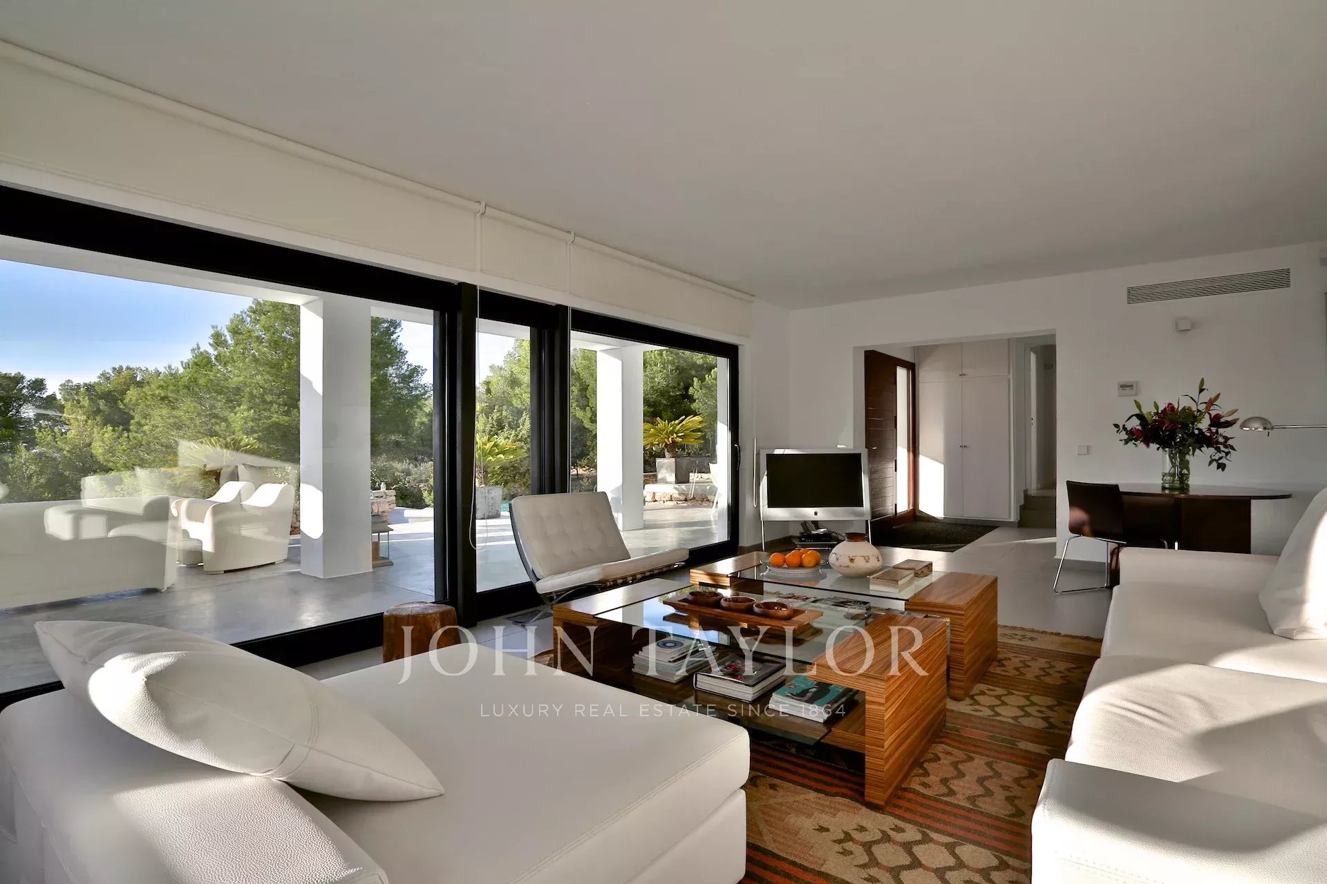Diese moderne Villa, die malerisch auf einem Hügel zwischen San José und Cala Tarida liegt, lädt dich ein, einen exklusiven Lebensstil mit atemberaubendem Blick auf das Meer und die ibizenkische Landschaft zu genießen. Beim Betreten wirst du von einem hellen Wohnzimmer und einem einladenden Essbereich empfangen, die mit Klimaanlage und einem Soundsystem ausgestattet sind, das die perfekte Atmosphäre schafft. Der Kamin verleiht dem Raum eine warme und gemütliche Note, während die großen Fenster das natürliche Licht hereinlassen und den Raum mit der Terrasse und dem Pool verbinden.