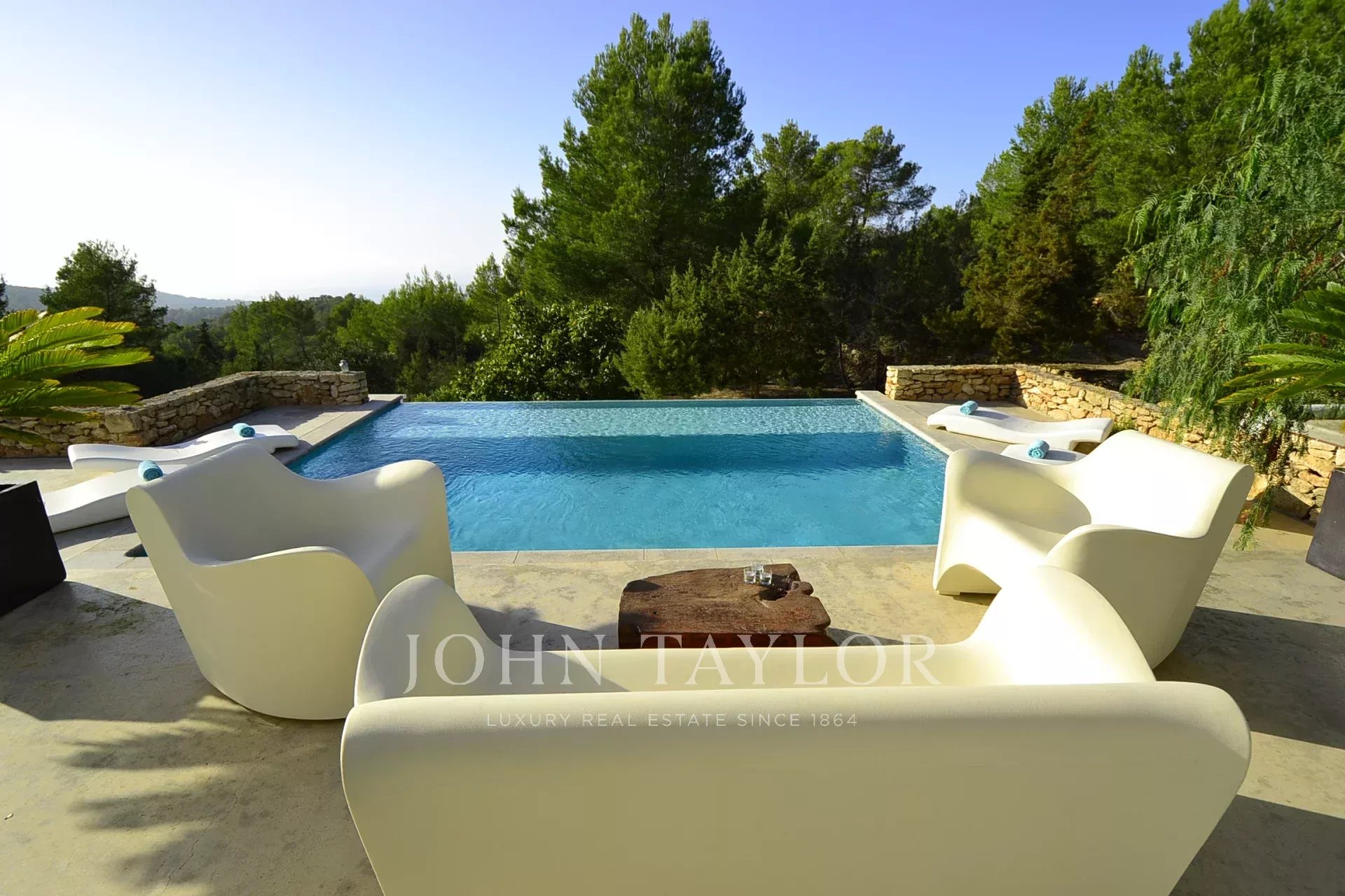 Der Außenbereich ist ein wahres Paradies, wo du einen spektakulären Infinity-Pool von 10 x 6 Metern findest, der perfekt ist, um sich zu erfrischen und die Sonne zu genießen. Der flache Bereich ist ideal für Kinder, und die gemütlichen Chill-out-Bereiche laden dazu ein, sich zu entspannen und die magischen ibizenkischen Sonnenuntergänge zu genießen. Der Essbereich im Freien, ausgestattet mit Grill und Tisch für zwölf Personen, ist perfekt, um unvergessliche Abendessen im Freien zu teilen.