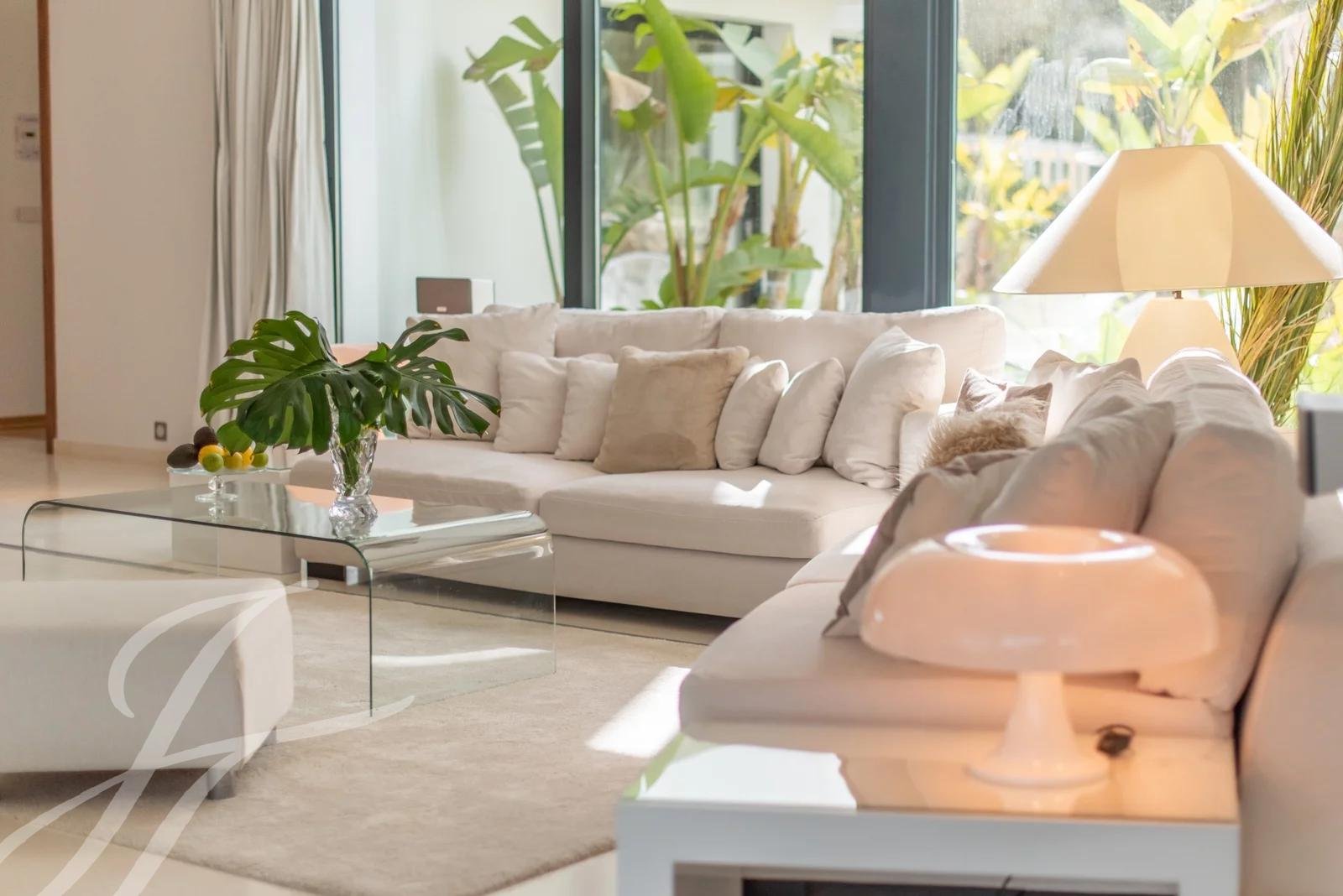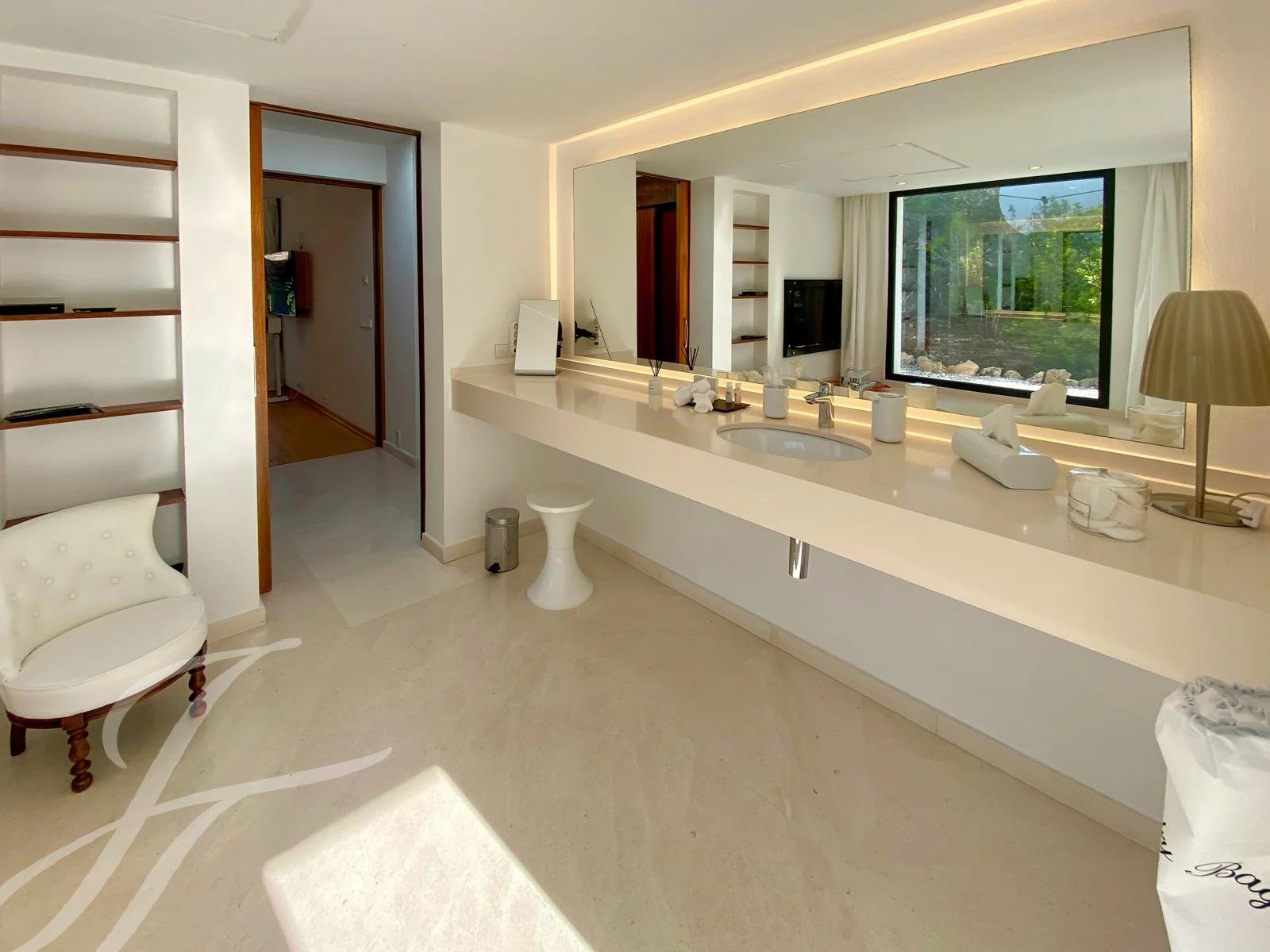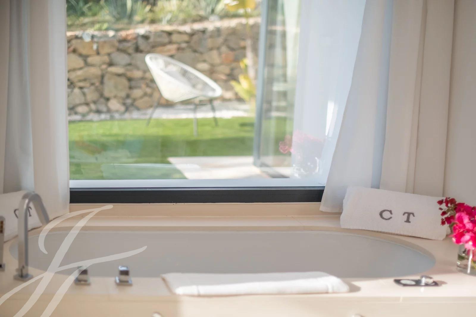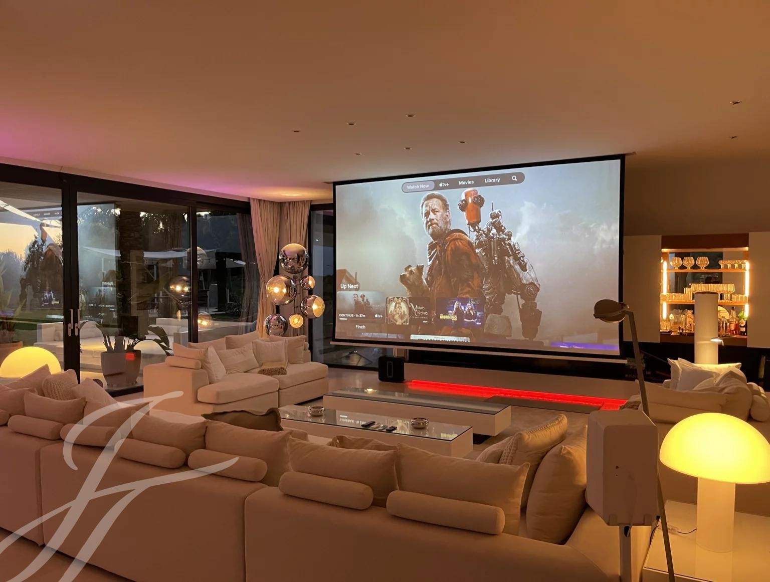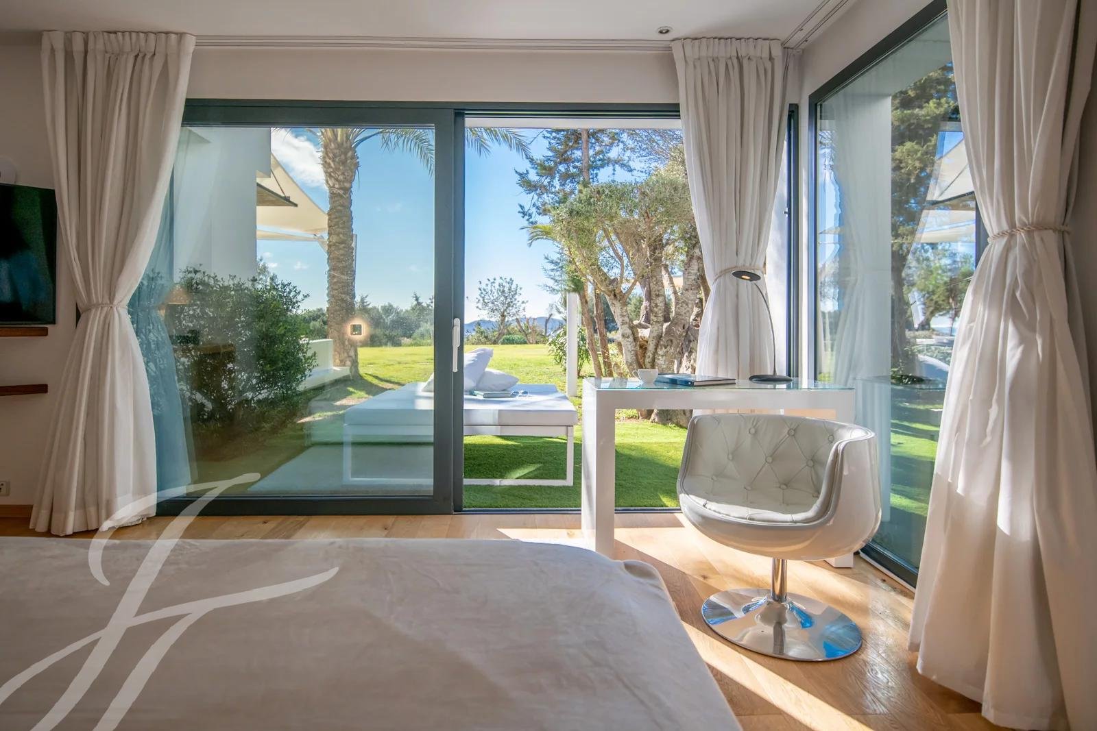 Alle diese Räume haben einen fantastischen Blick auf das Meer. Das Design der Villa ist rollstuhlgerecht, mit barrierefreien Wegen zur Küche, Esszimmer, Wohnzimmer und zwei Suiten im Erdgeschoss. High-Speed-Glasfaser-Internet und WiFi 6 deckt die gesamte Villa, einschließlich der Gärten, Pool und Parkplatz. Jede Suite sowie das Wohnzimmer und das Fernsehzimmer sind mit 4K-Fernsehern ausgestattet. Das Wohnzimmer verfügt außerdem über eine 5-Meter-Leinwand mit einem nativen 4K-Projektor. Ein SONOS-Soundsystem ist in allen Suiten, Chill-out-Bereichen und im Poolbereich installiert.