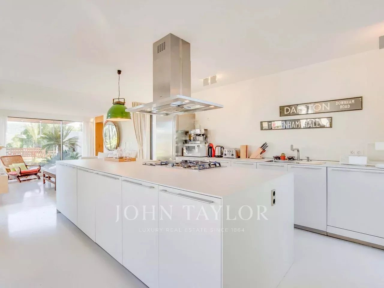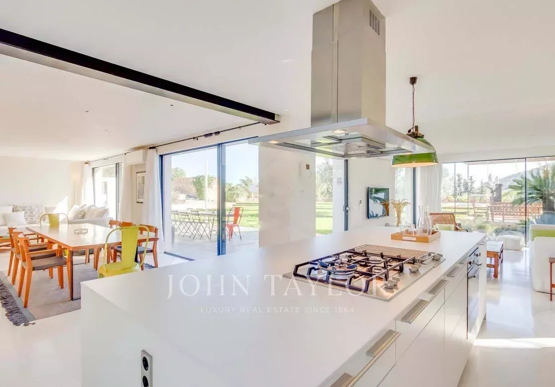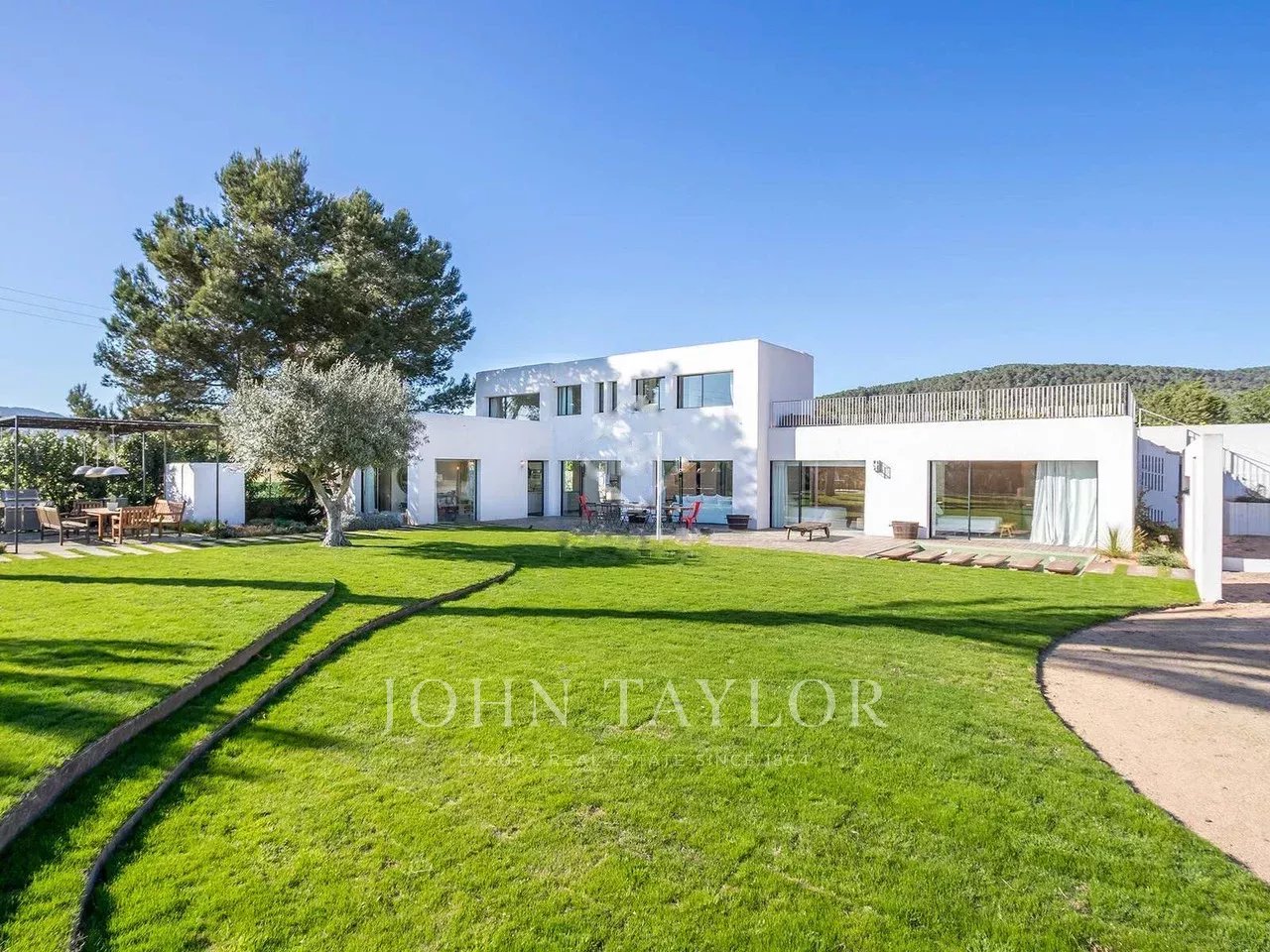 Umgeben von einem ebenen Garten mit natürlichem Rasen und einem smaragdgrünen Fliesenpool, verleiht diese lichtdurchflutete und ruhige Immobilie ein Gefühl von Eleganz.