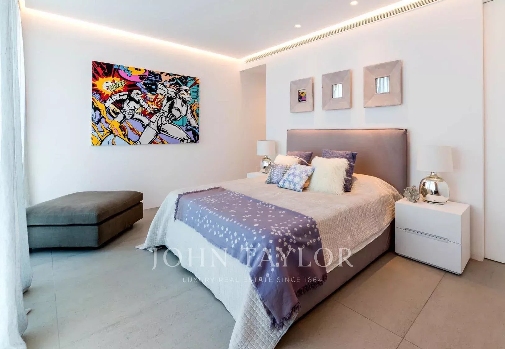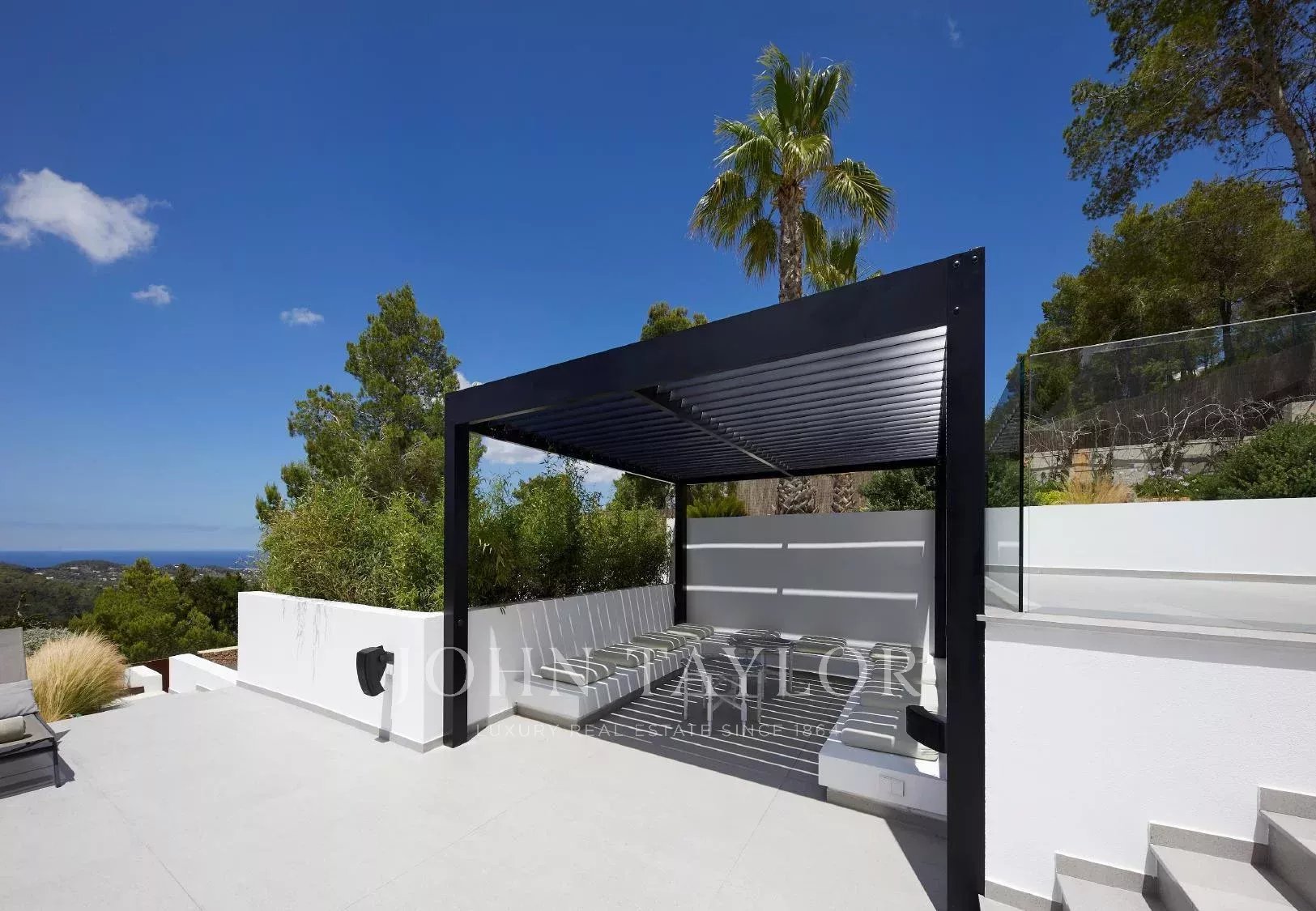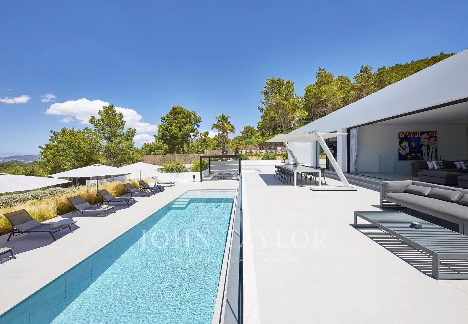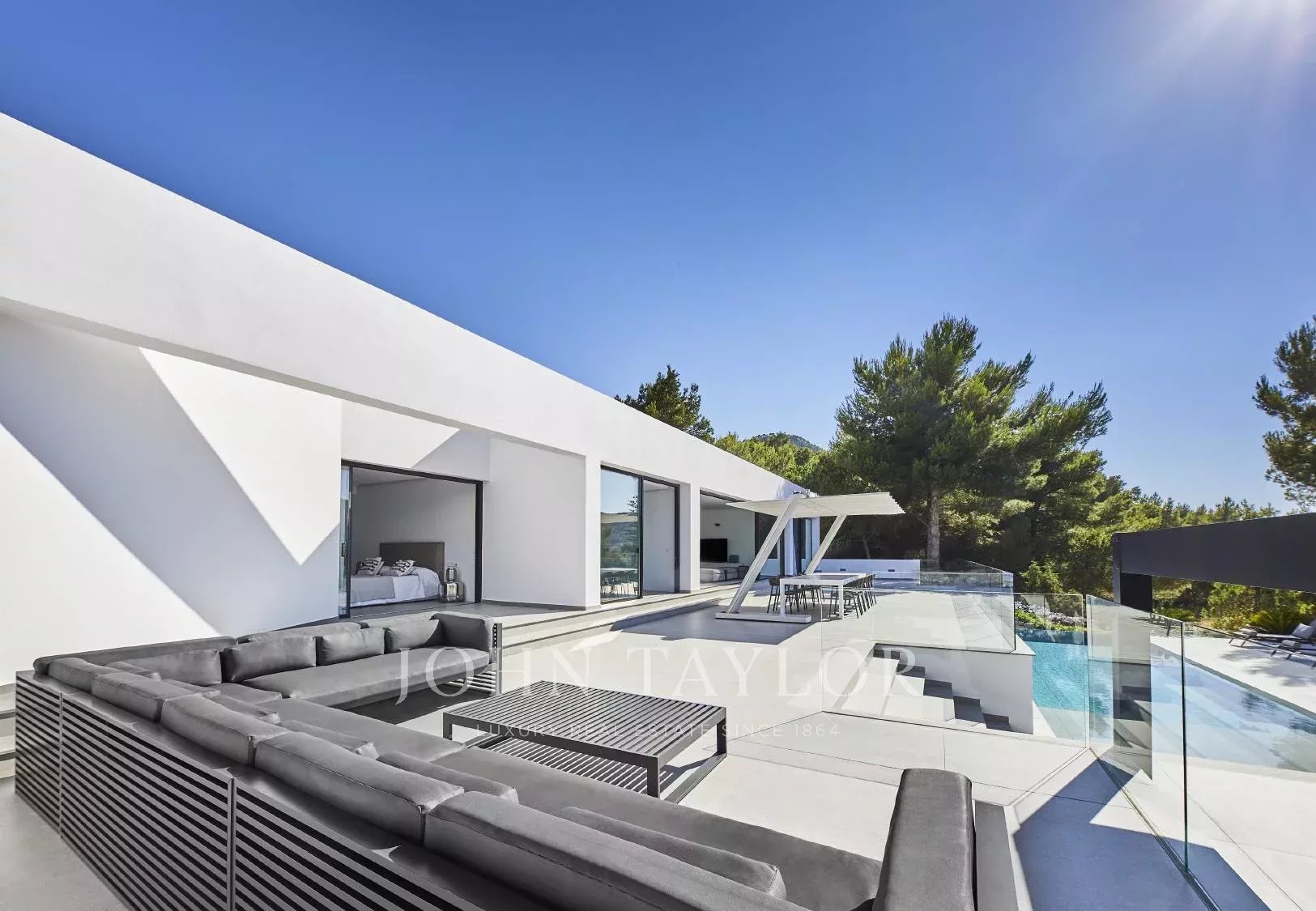 Auf dem 20.000 m² großen Grundstück befinden sich mediterran gestaltete Gärten, eine Chill-out-Zone, ein Essbereich im Freien, ein Grillplatz und spektakuläre Ausblicke auf Sonnenuntergänge und die umliegende Landschaft Ibizas. Zur Ausstattung gehören moderne Klimaanlage, Sonos-Soundsystem, Heimkino, Satellitenfernsehen und Highspeed-WLAN. Jedes Schlafzimmer verfügt über einen Safe, USB-Ladegeräte, eine Espressomaschine sowie Tee- und Kaffeezubehör und Zugang zu Wäscheservice.