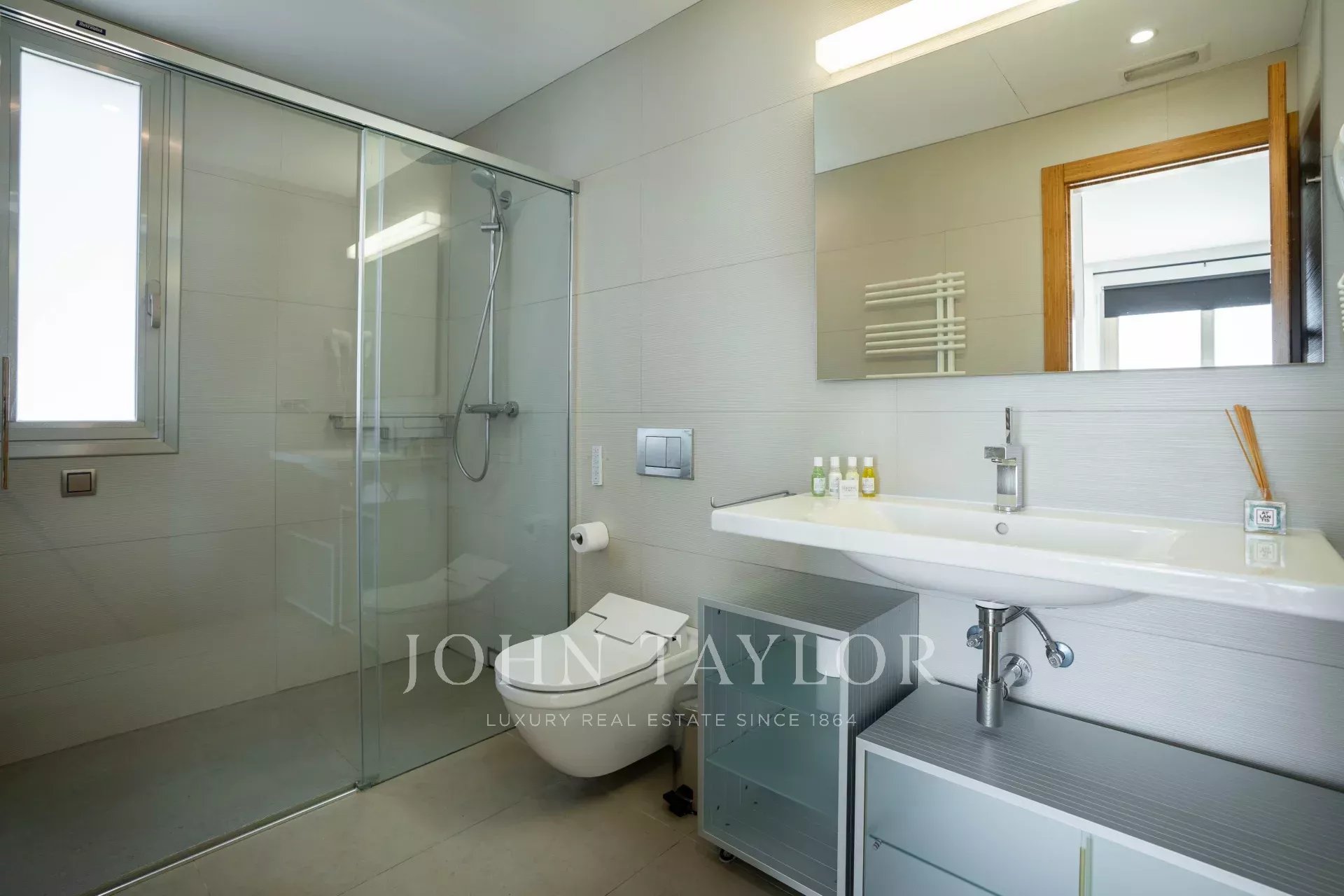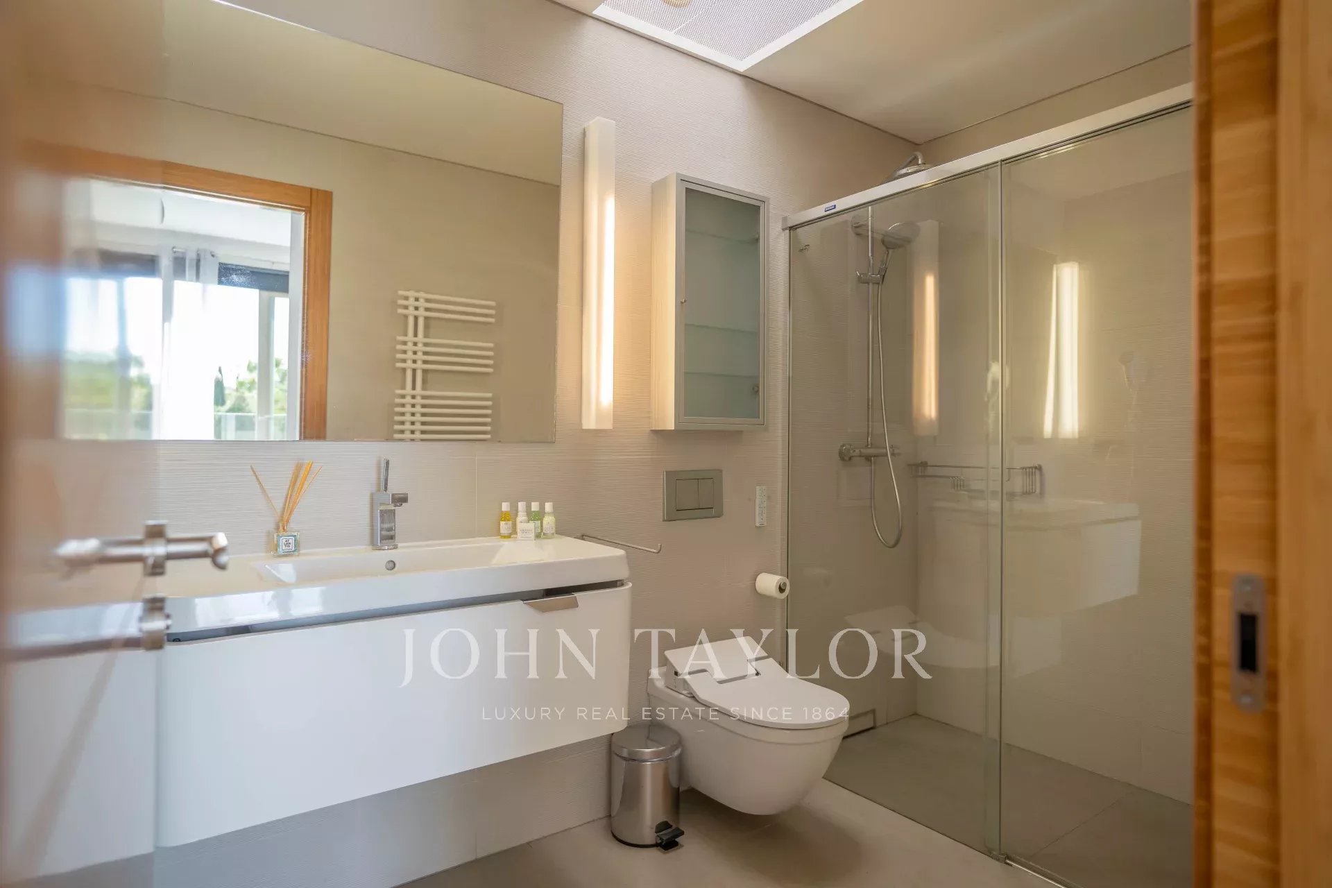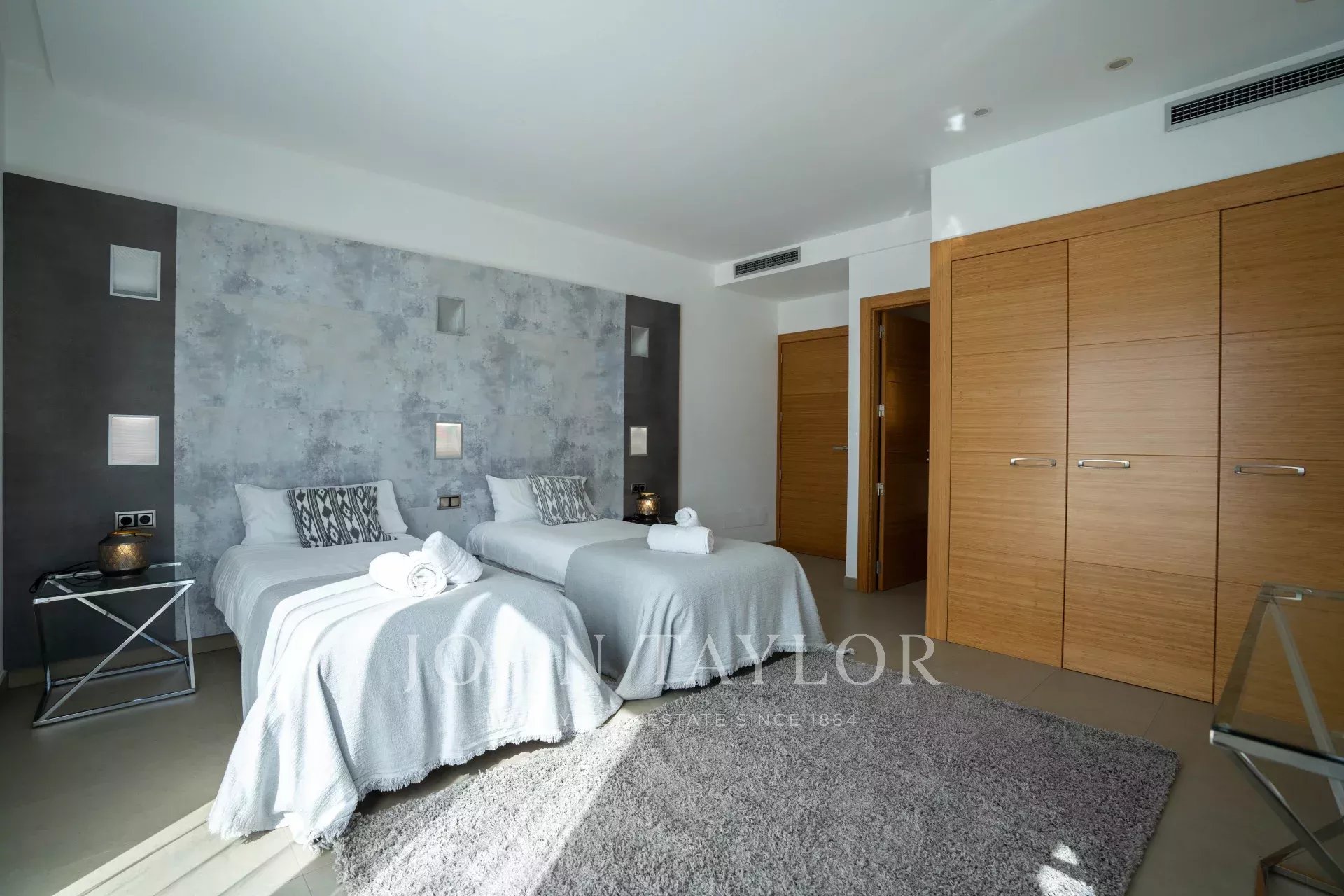 Im Inneren der Villa können bis zu 14 Gäste bequem untergebracht werden. Das Hauptgebäude besteht aus fünf komfortablen Schlafzimmern, während die angrenzende Wohnung mit eigenem Zugang ein modernes Wohnzimmer, eine voll ausgestattete Küche und zwei Schlafzimmer mit eigenem Bad beherbergt. Die Villa ist tadellos mit modernen Möbeln und einer geschmackvollen, minimalistischen Ästhetik eingerichtet, in der neutrale Töne vorherrschen, die ein Ambiente von Raffinesse schaffen.