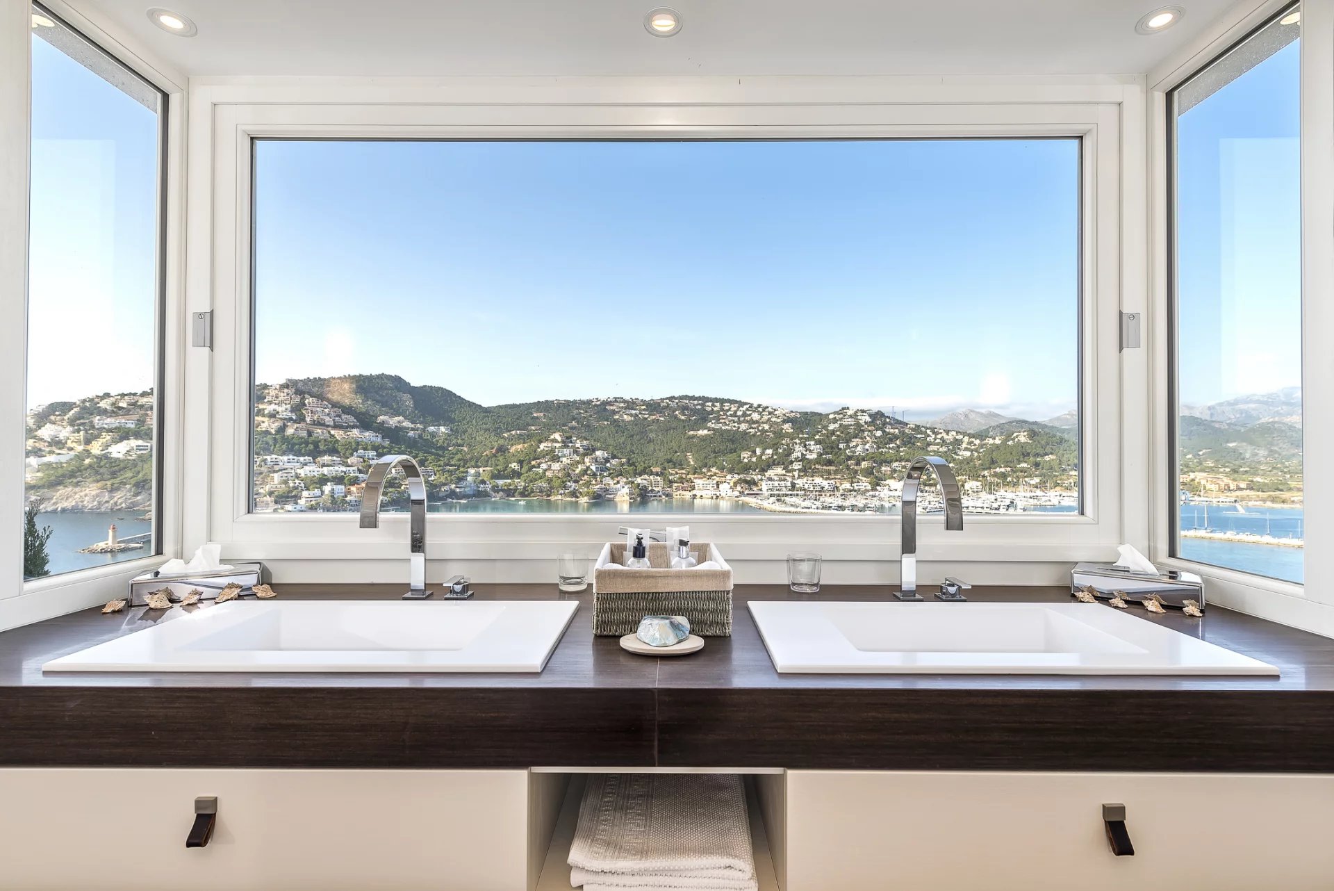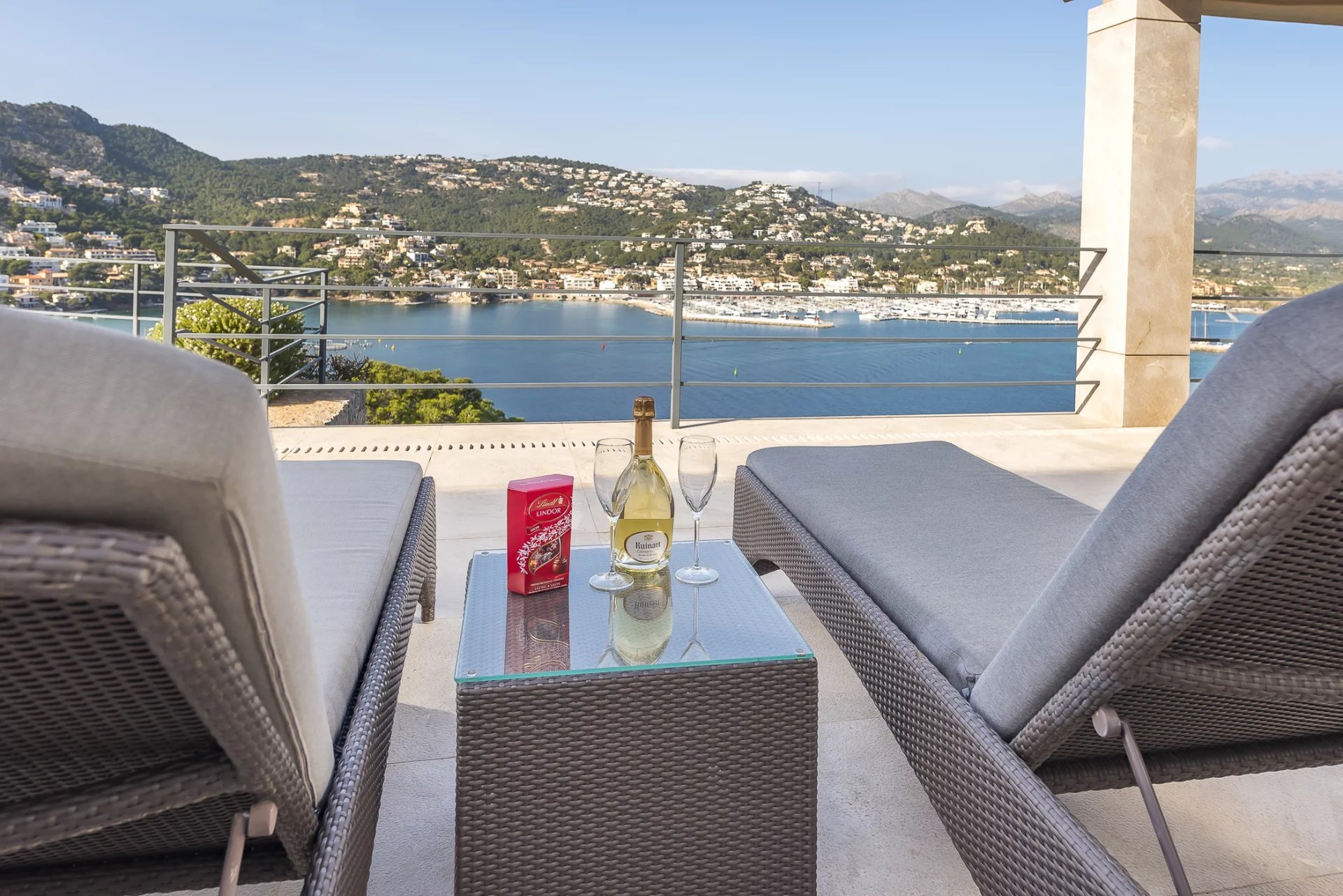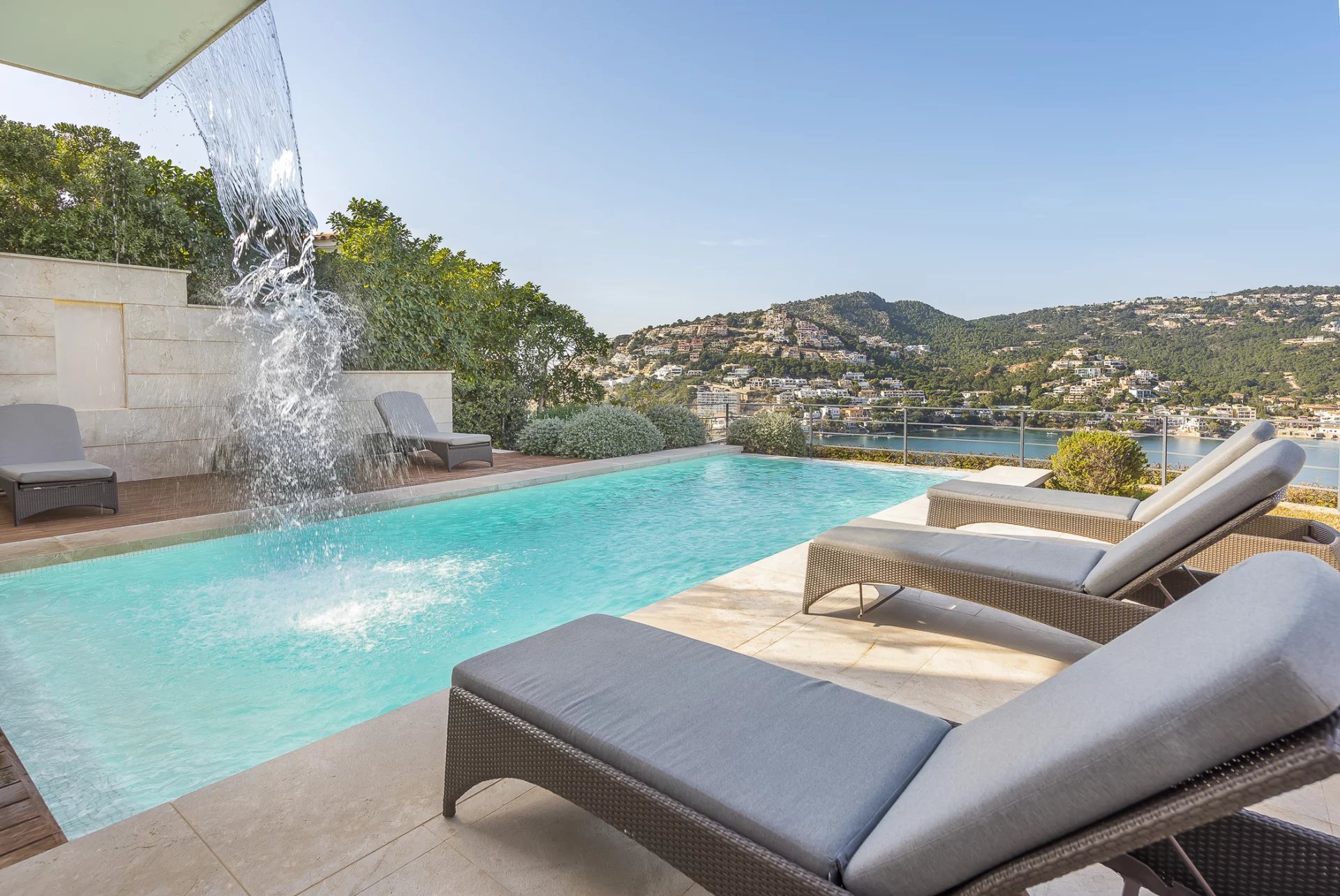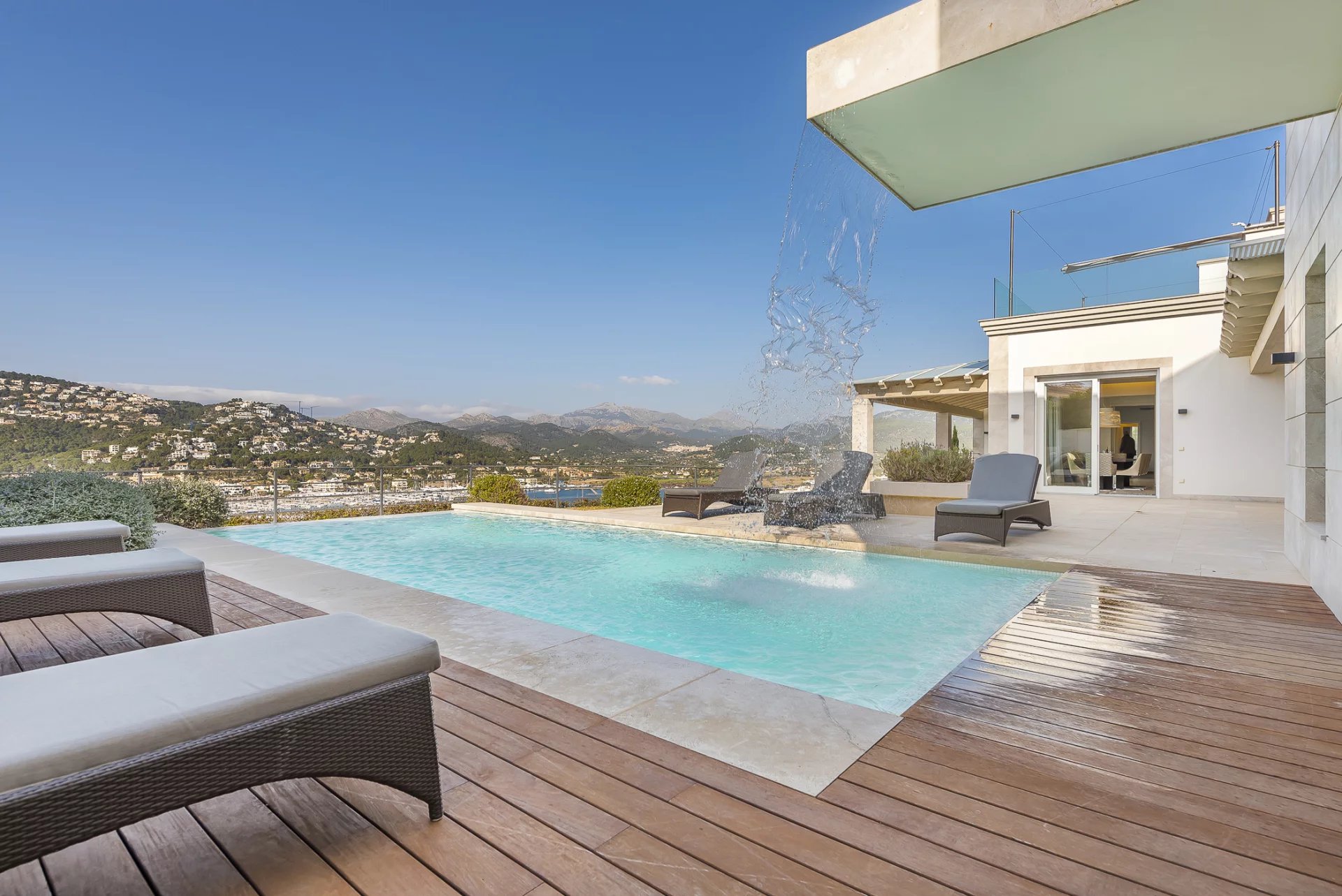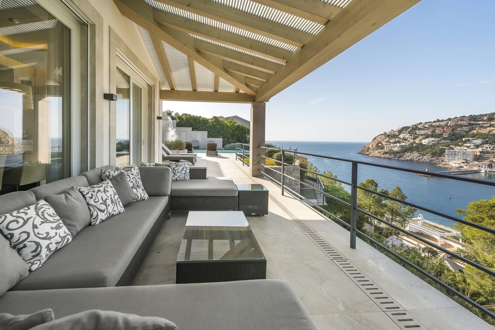 Luxuriöse Villa in bester Lage. In dieser neu gebauten Villa verteilen sich 5 Schlafzimmer mit en-suite Badezimmern auf 600 m2 Wohnfläche. Moderne Bauweise und Design ziehen sich durch das gesamte Haus. Die voll ausgestattete offene Küche lässt keine Wünsche offen. Ob vom Schlafzimmer, dem gemütlichen Wohnbereich mit Kamin oder der Küche, von jedem Raum aus hat man einen atemberaubenden Blick auf die Bucht von Puerto de Andratx und den Hafen. Im Außenbereich befindet sich der beheizte Infinity-Pool mit Chill-Out-Bereich und einem großen Esstisch mit BBQ. Ein besonderes Highlight ist die hauseigene Sauna, von der Sie dank der großen Glasfront einen herrlichen Blick auf das Meer genießen können. Atemberaubende Sonnenuntergänge sind hier garantiert.