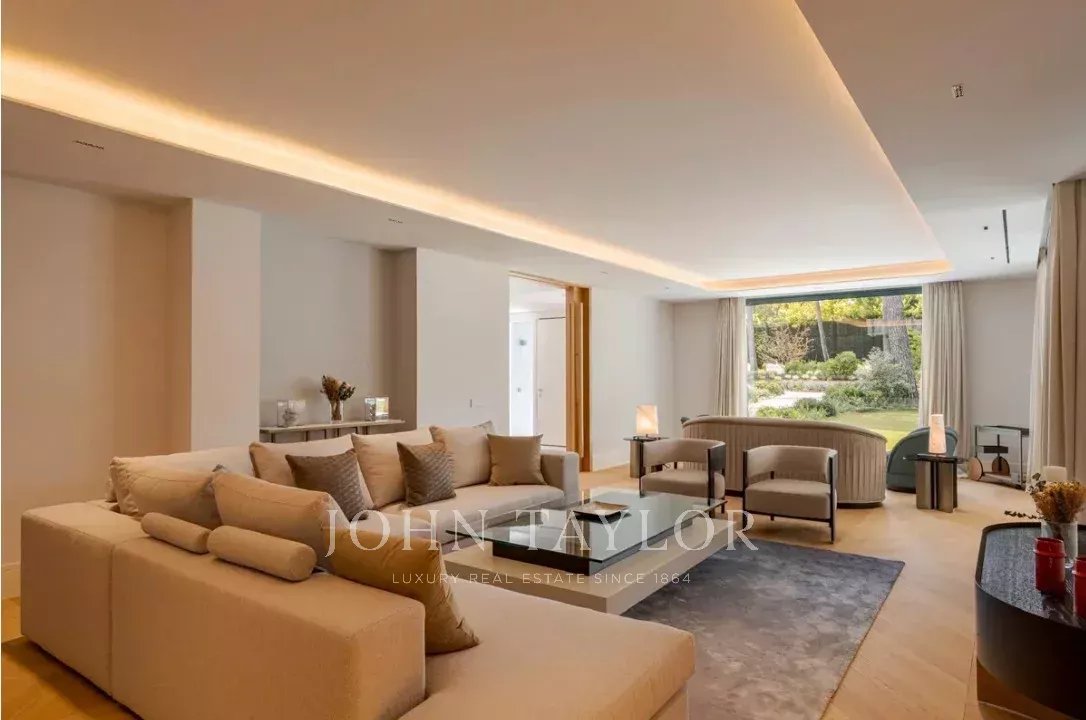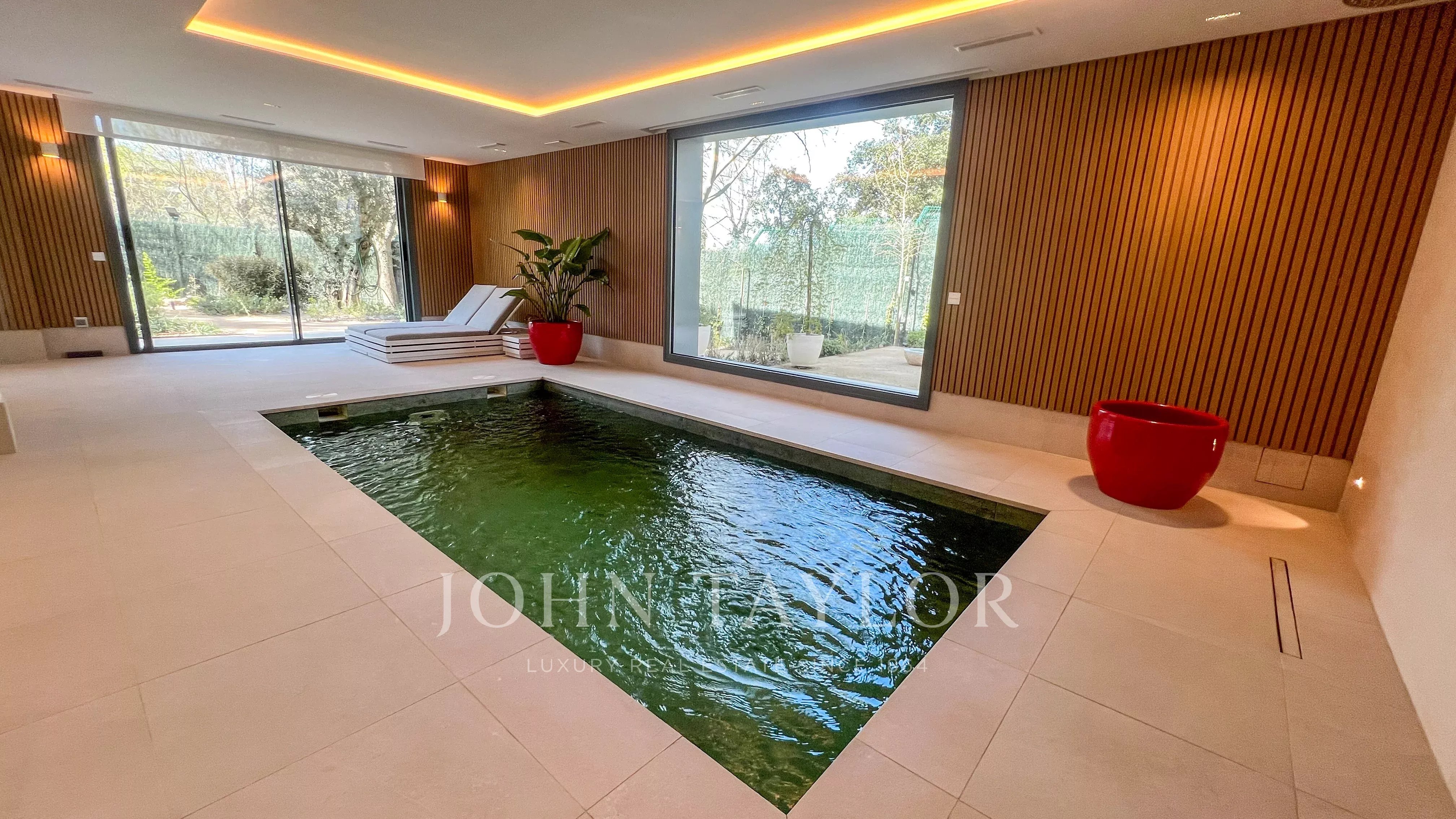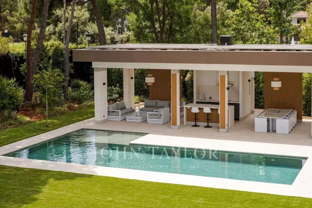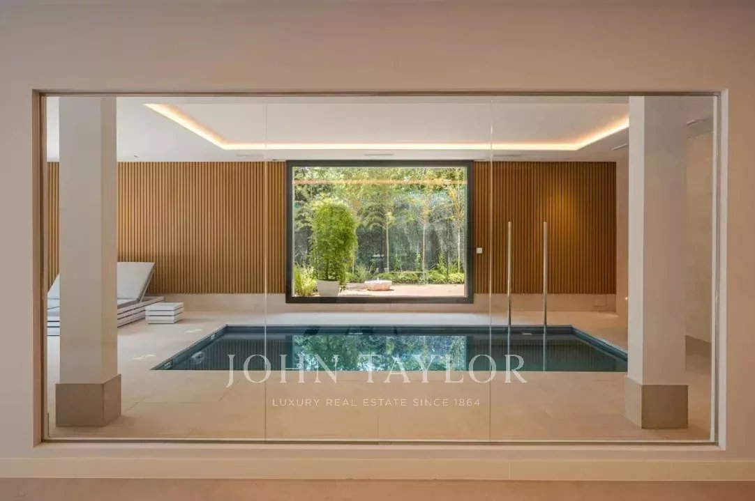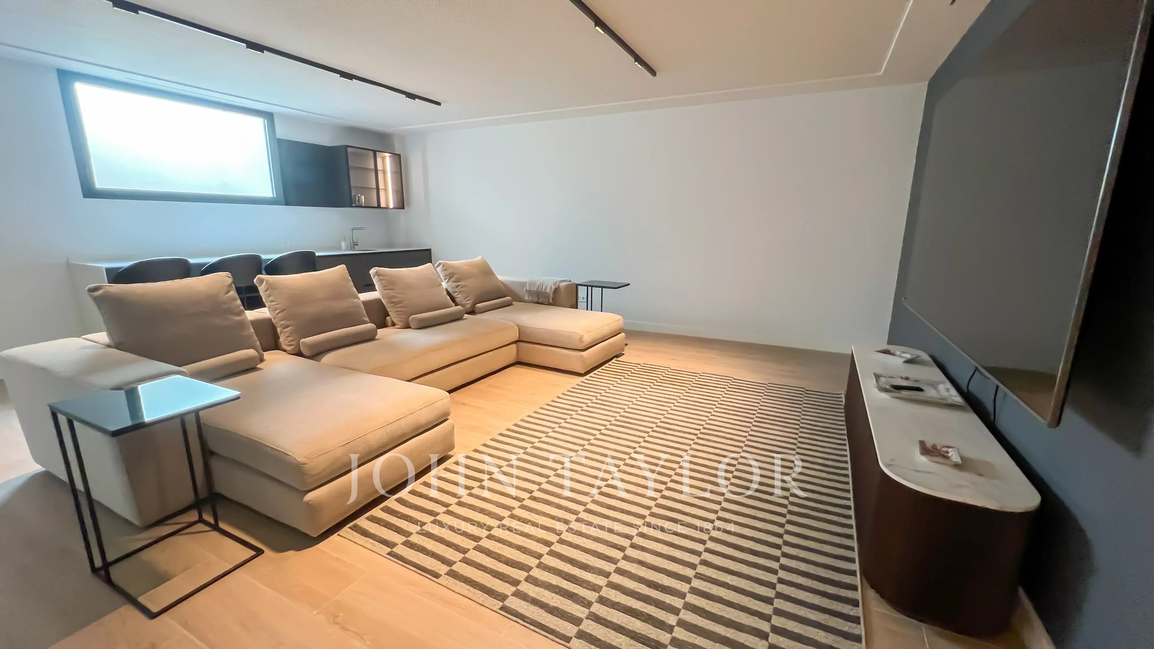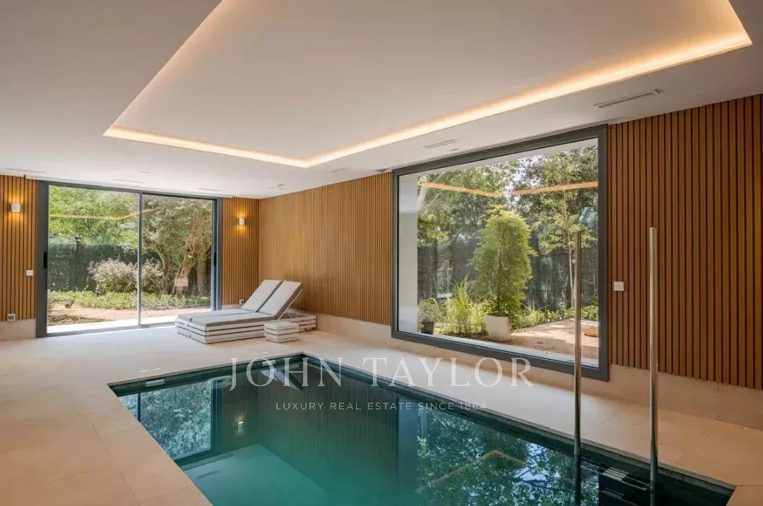 Das Hauptgeschoss beherbergt eine elegante Halle mit Doppelhöhe, ein großes Wohnzimmer mit Zugang zum Garten und zum Pool, ein Wohnzimmer mit Bar, eine Design-Küche mit Gaggenau-Geräten und einen Essbereich. Auf dieser Ebene befindet sich auch die Hauptsuite mit privatem Salon, zwei Ankleidezimmern und eigenem Bad sowie eine Gästetoilette.
