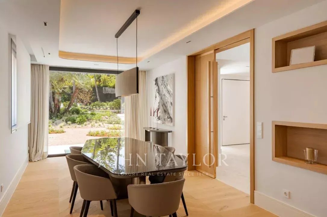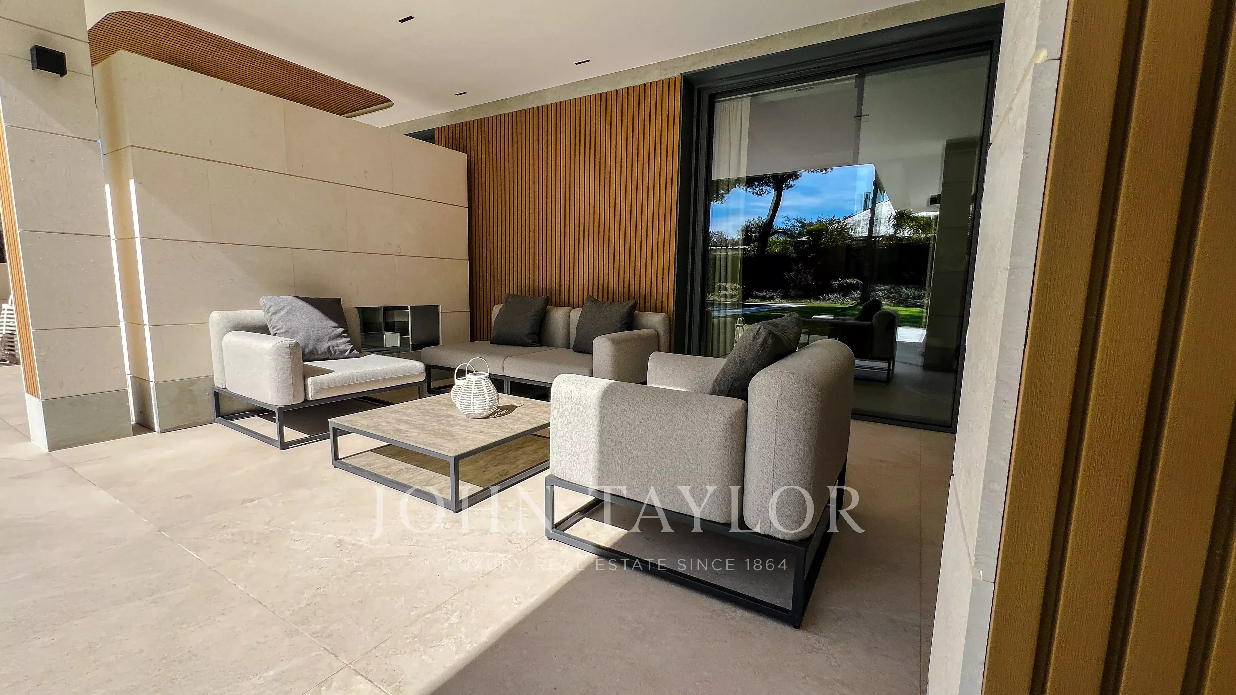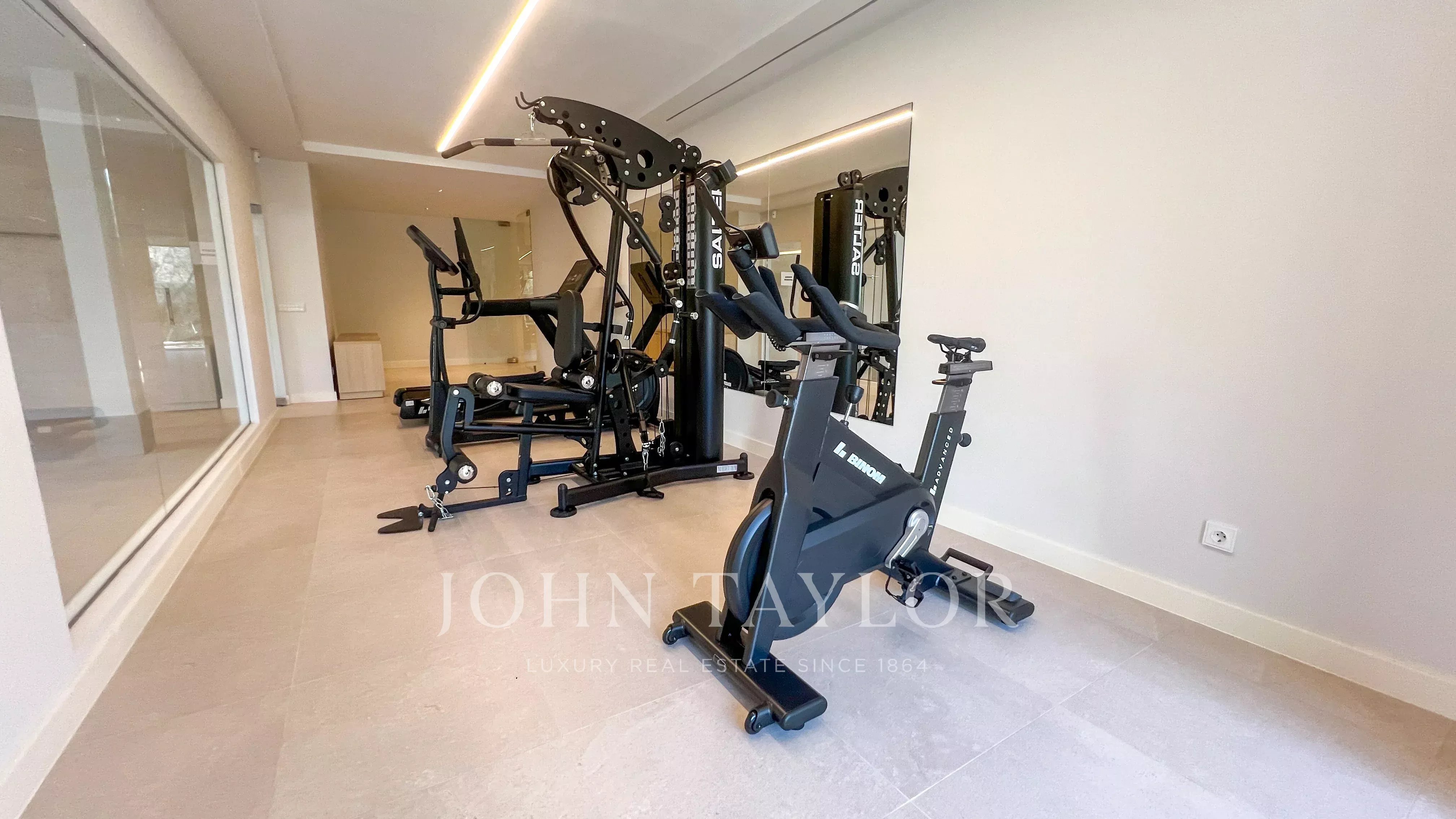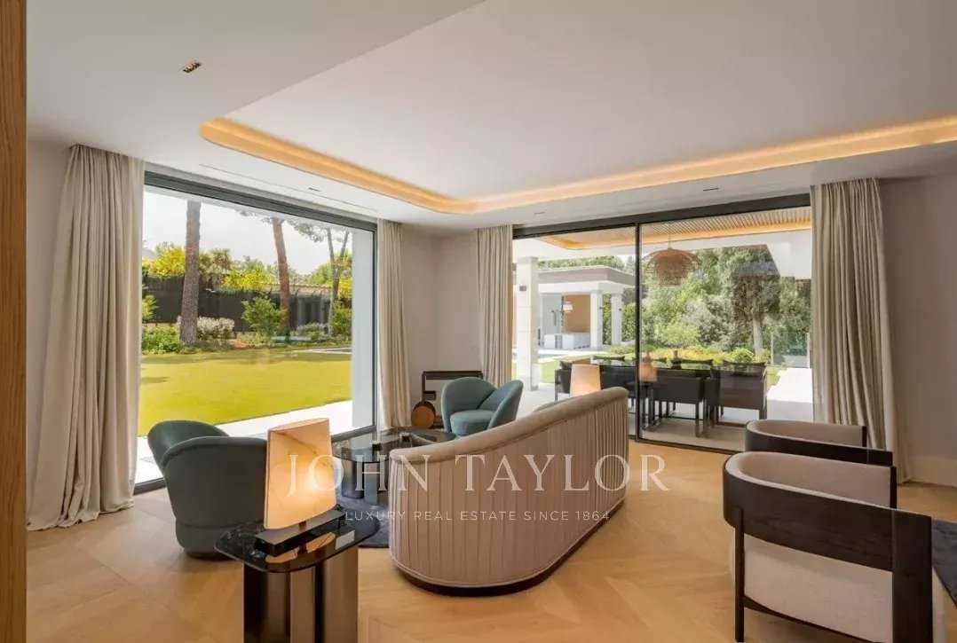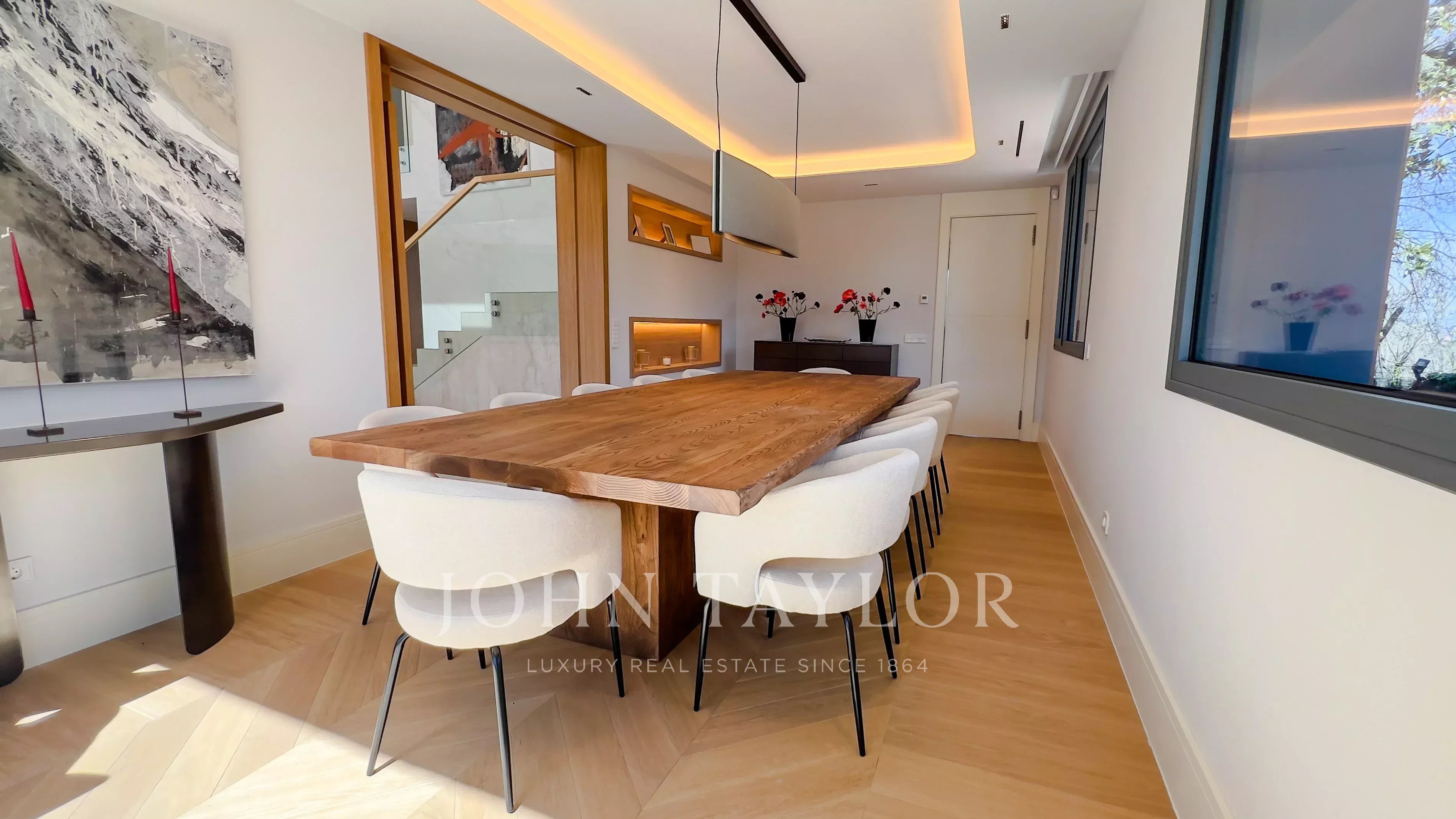 Das Hauptgeschoss beherbergt eine elegante Halle mit Doppelhöhe, ein großes Wohnzimmer mit Zugang zum Garten und zum Pool, ein Wohnzimmer mit Bar, eine Design-Küche mit Gaggenau-Geräten und einen Essbereich. Auf dieser Ebene befindet sich auch die Hauptsuite mit privatem Salon, zwei Ankleidezimmern und eigenem Bad sowie eine Gästetoilette.