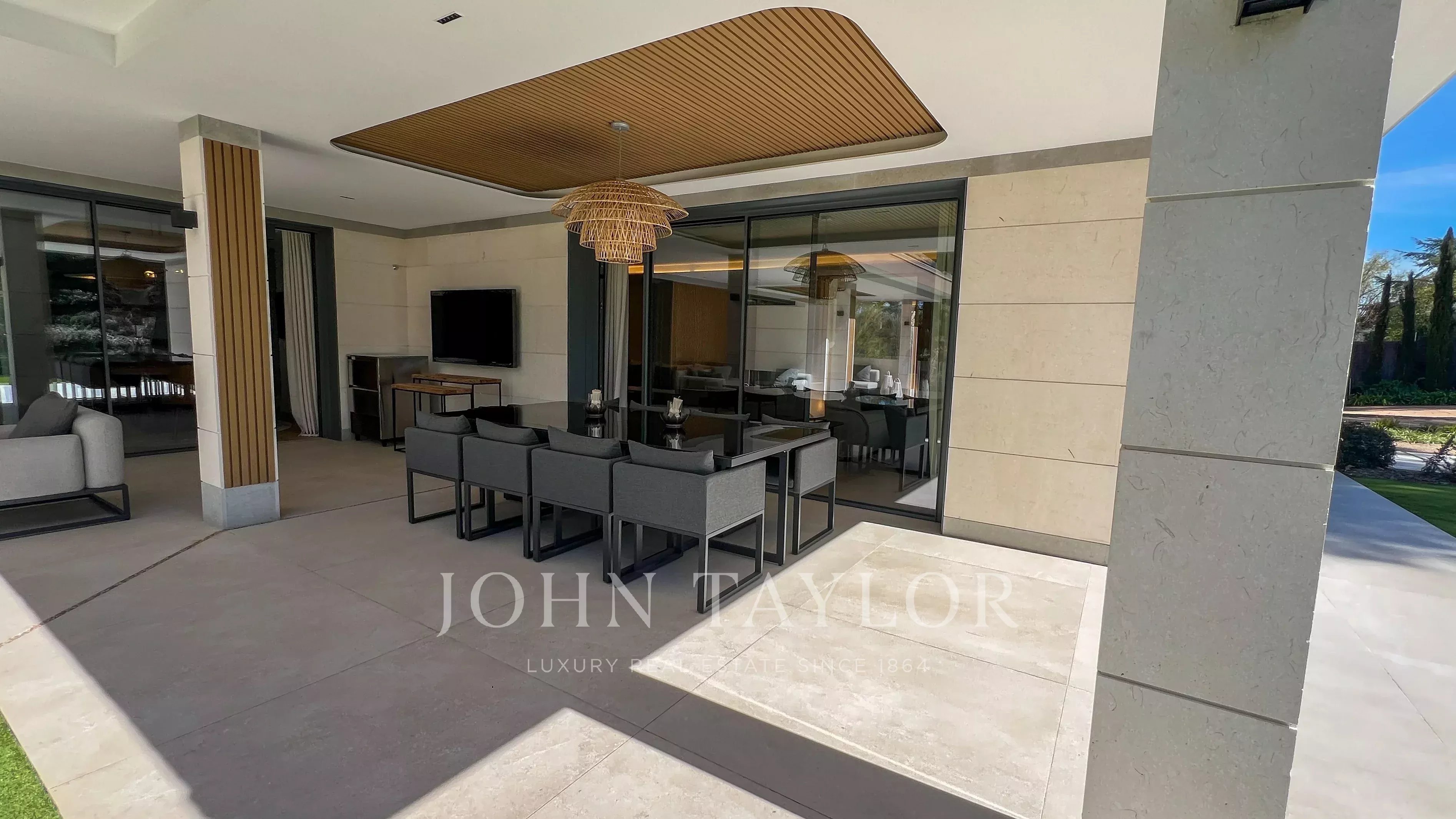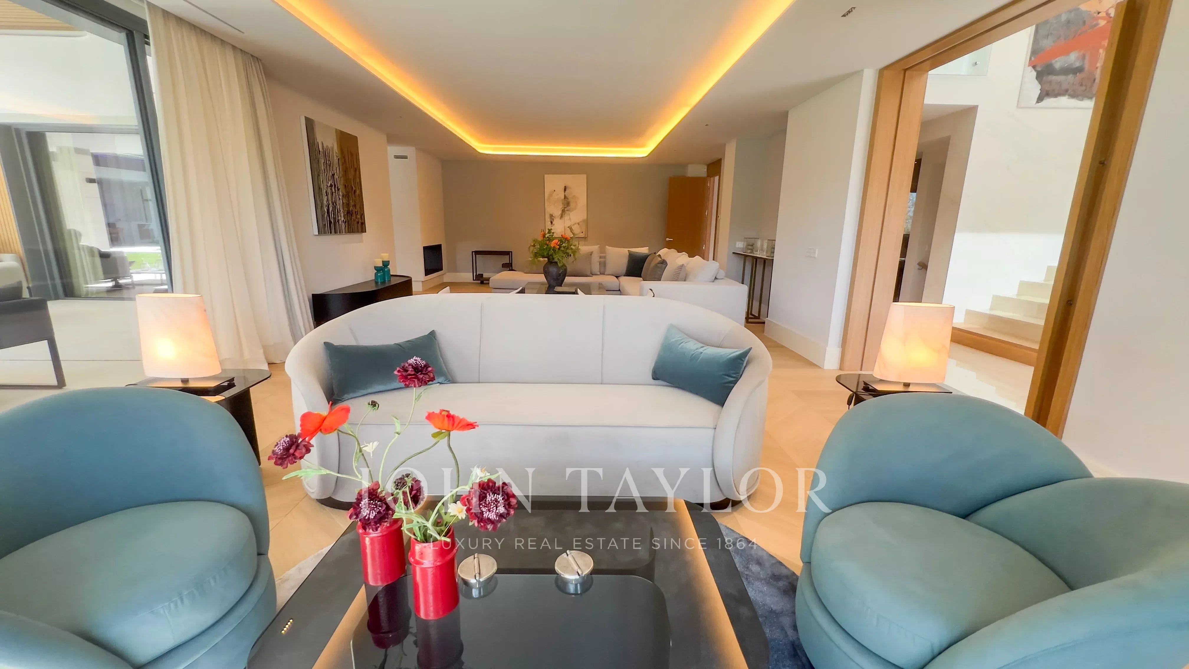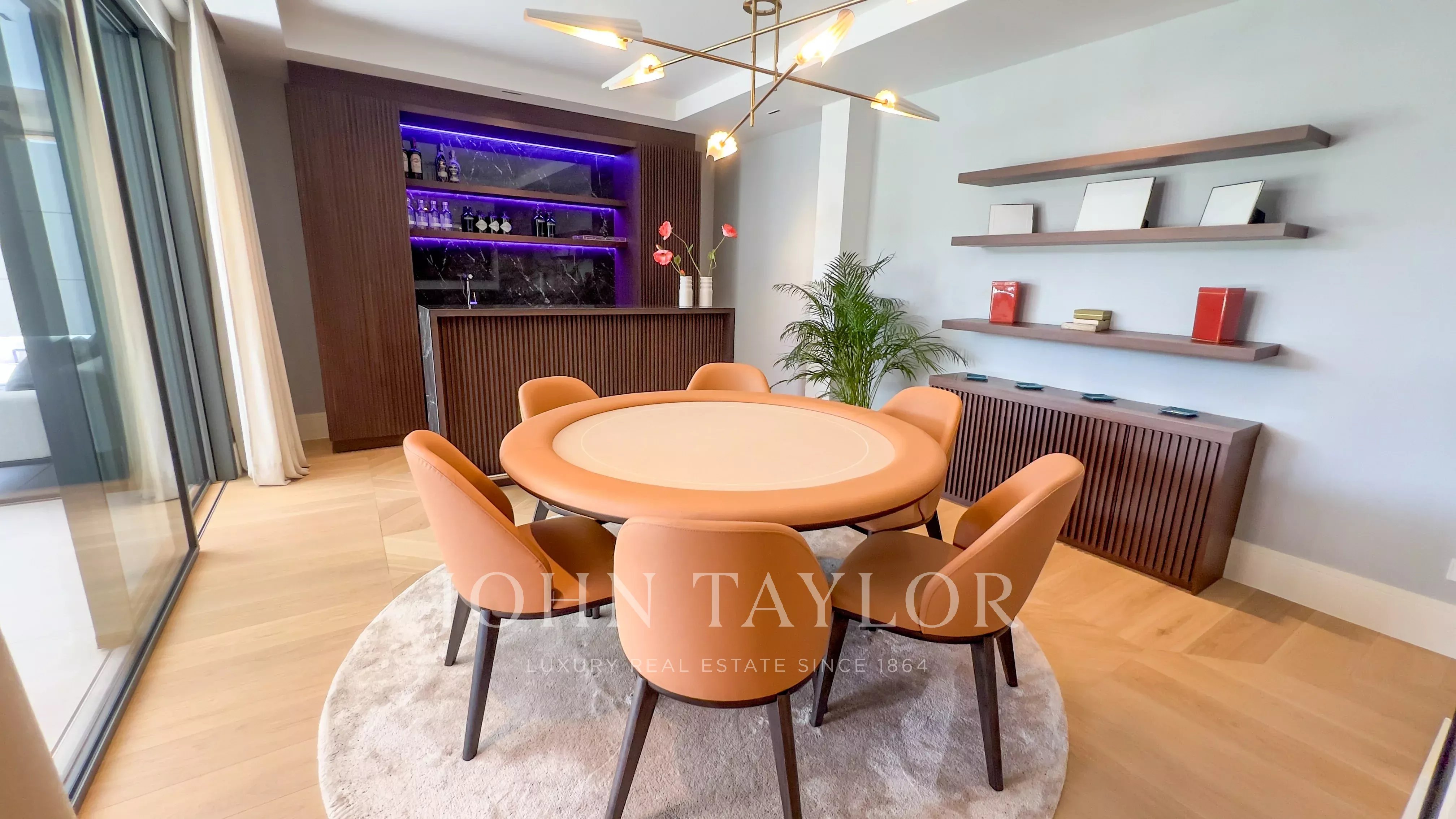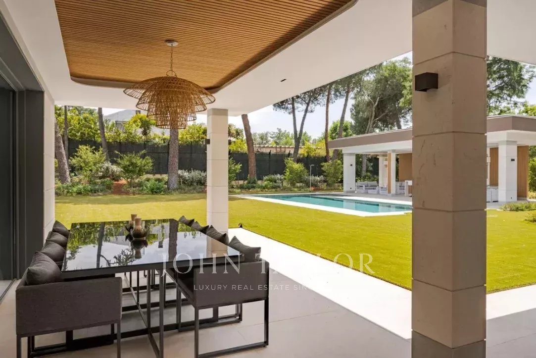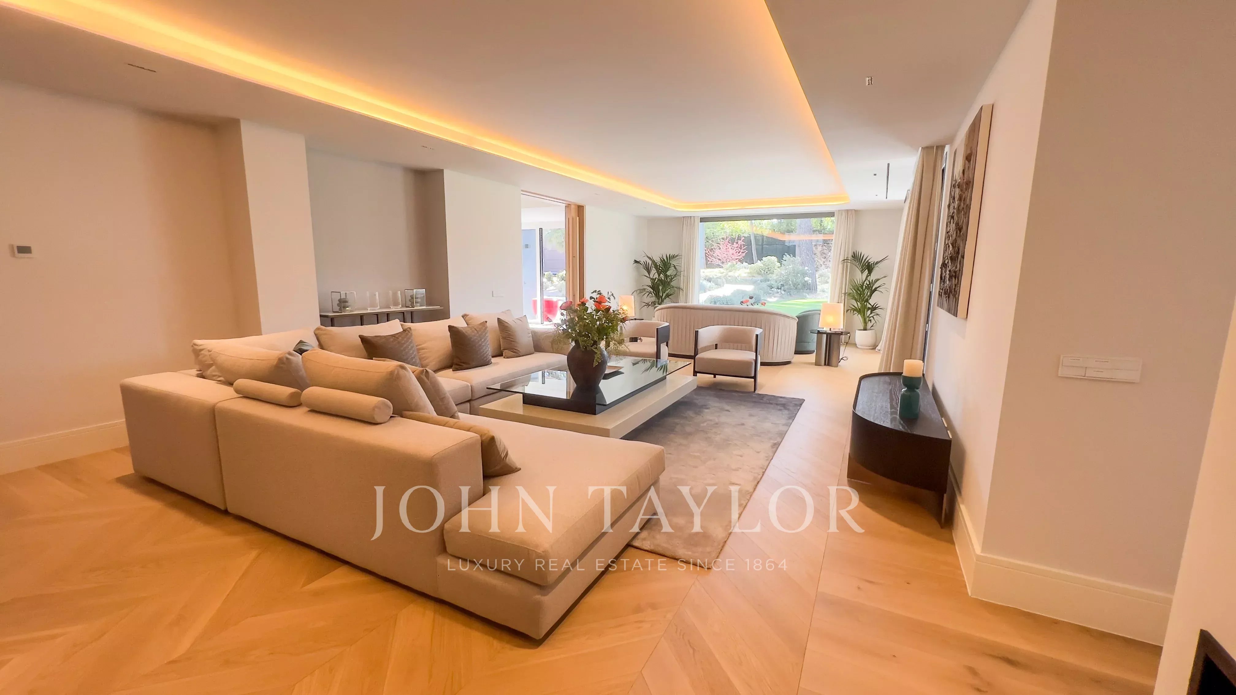 Das Hauptgeschoss beherbergt eine elegante Halle mit Doppelhöhe, ein großes Wohnzimmer mit Zugang zum Garten und zum Pool, ein Wohnzimmer mit Bar, eine Design-Küche mit Gaggenau-Geräten und einen Essbereich. Auf dieser Ebene befindet sich auch die Hauptsuite mit privatem Salon, zwei Ankleidezimmern und eigenem Bad sowie eine Gästetoilette.