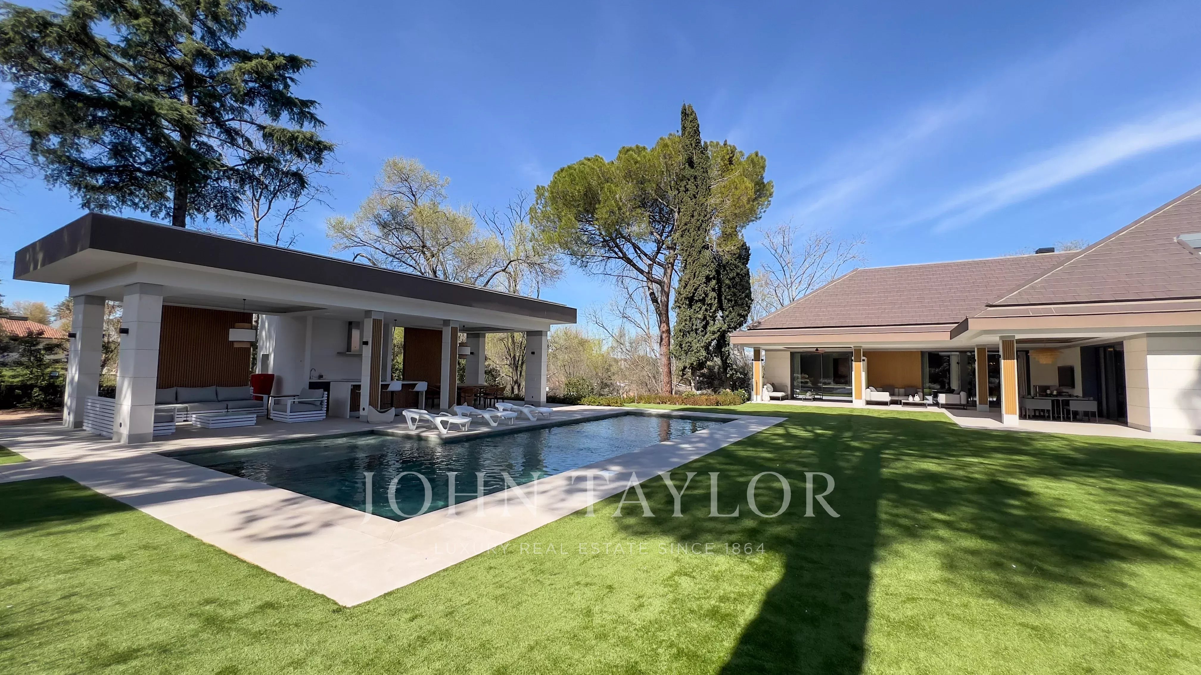 Der Garten, mit etablierten Bäumen, Außenpool und Chill-out-Bereich, vervollständigt diese Immobilie, die Eleganz, Privatsphäre und Komfort in einer der exklusivsten Wohnlagen Madrids vereint.