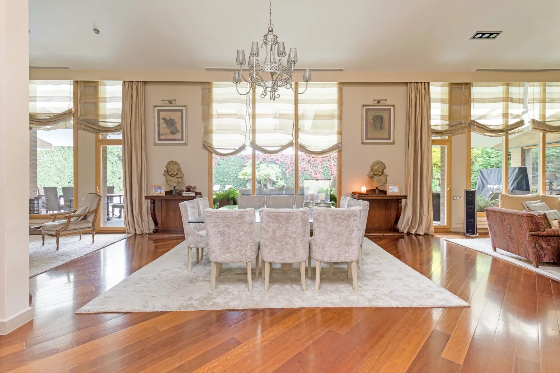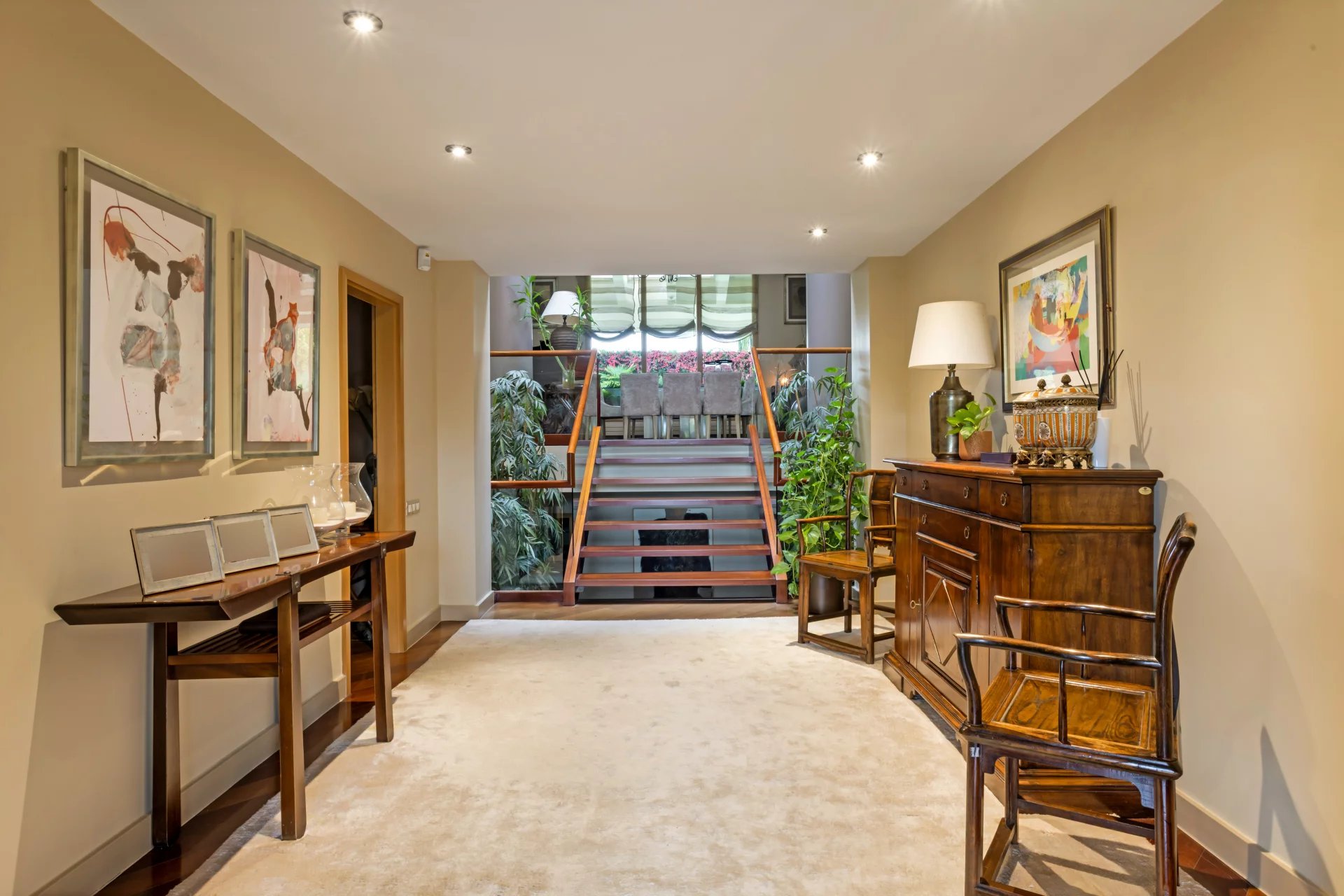 Ein eleganter Empfangsraum bietet Zugang zu einem Gäste-WC, einem gemütlichen Wohnzimmer und einem Esszimmer.