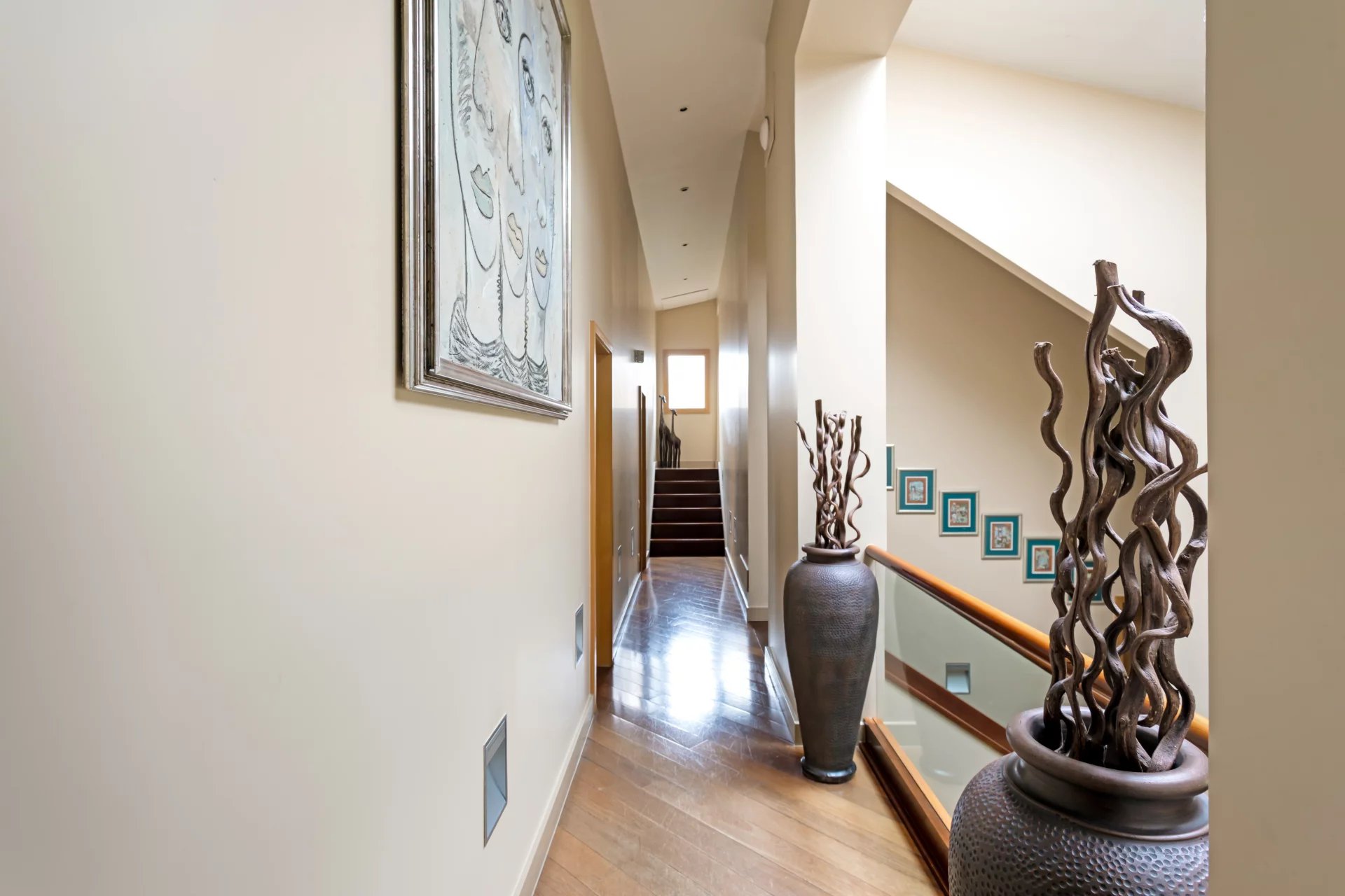 Vom Wohnzimmer aus hat man Zugang zum Stockwerk, das für den Ruhebereich bestimmt ist, der durch einen Verteilerkorridor mit Blick auf das Wohnzimmer und den Garten gegliedert ist. Auf dieser Ebene befinden sich: