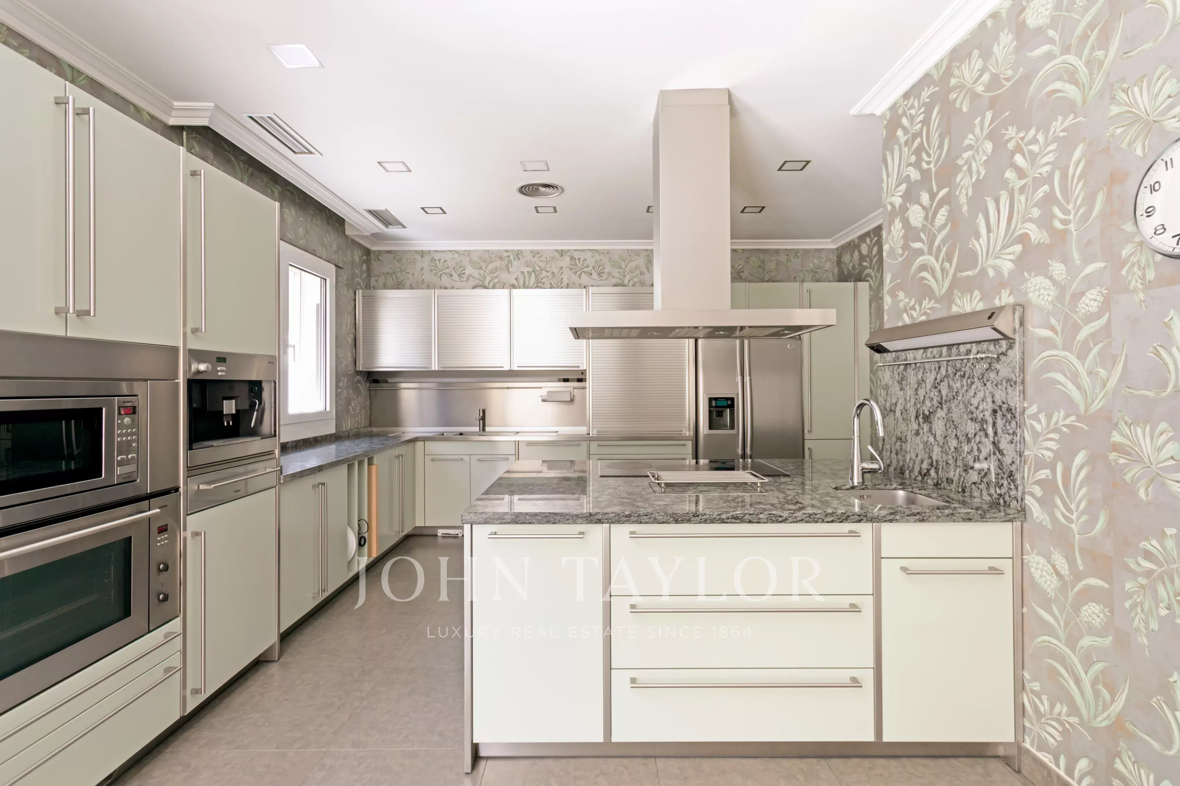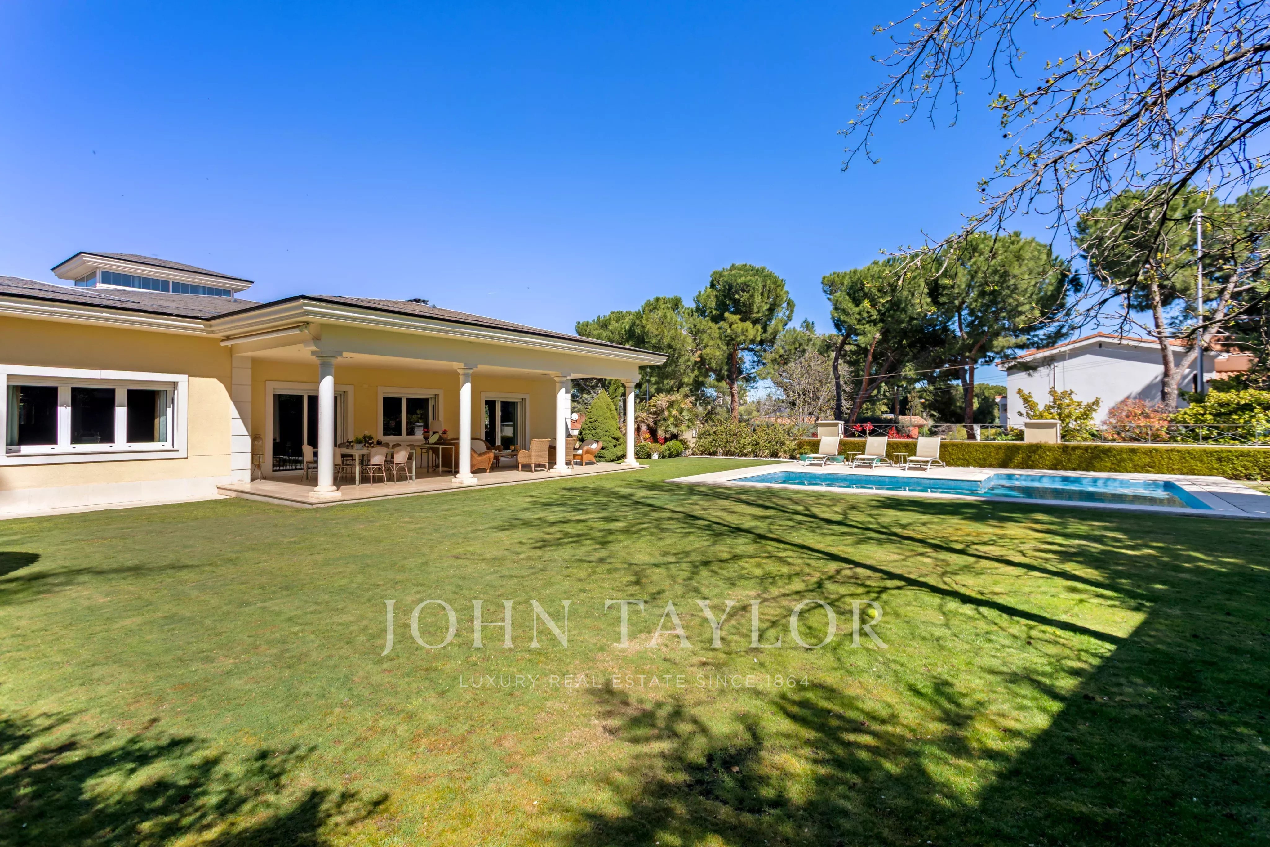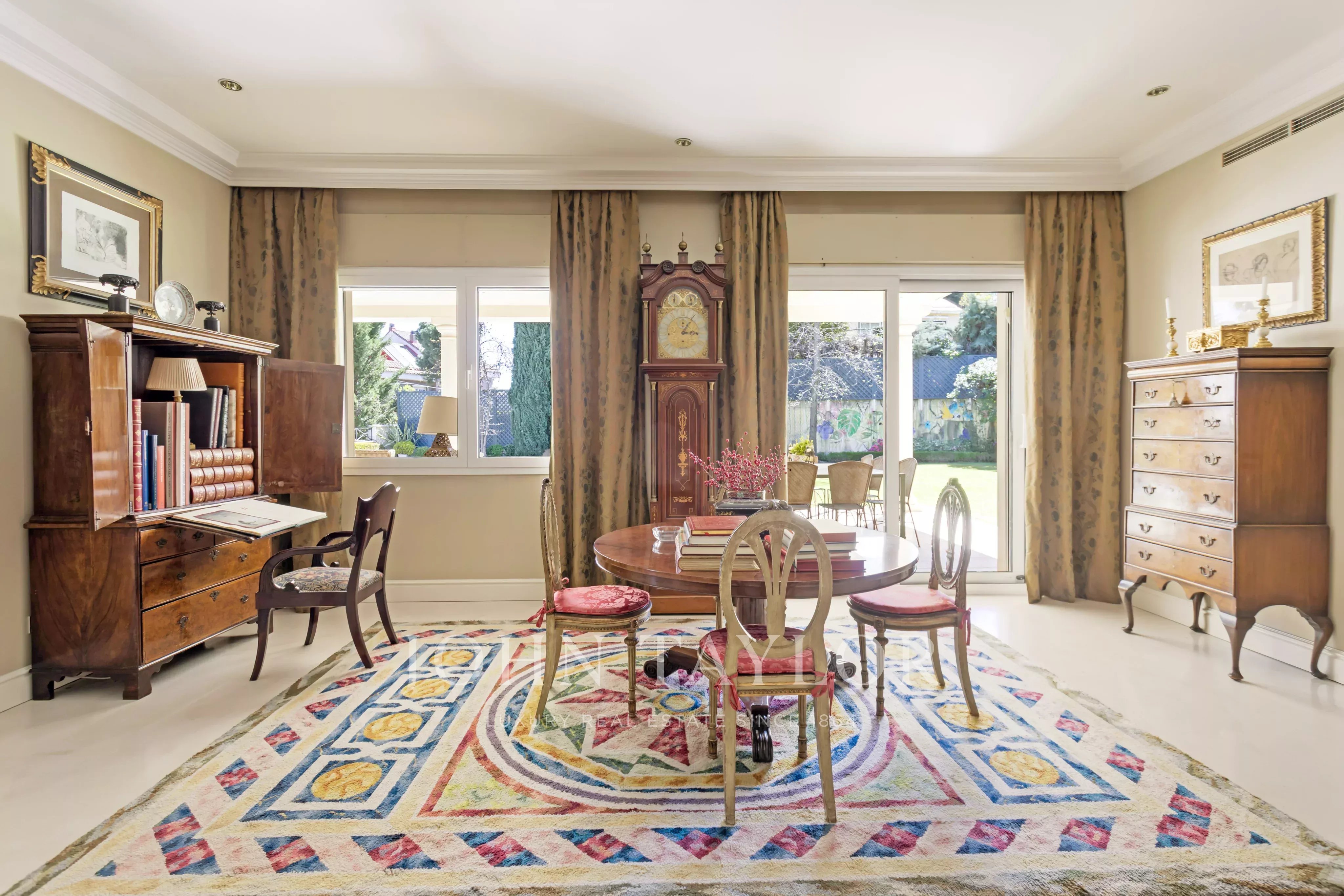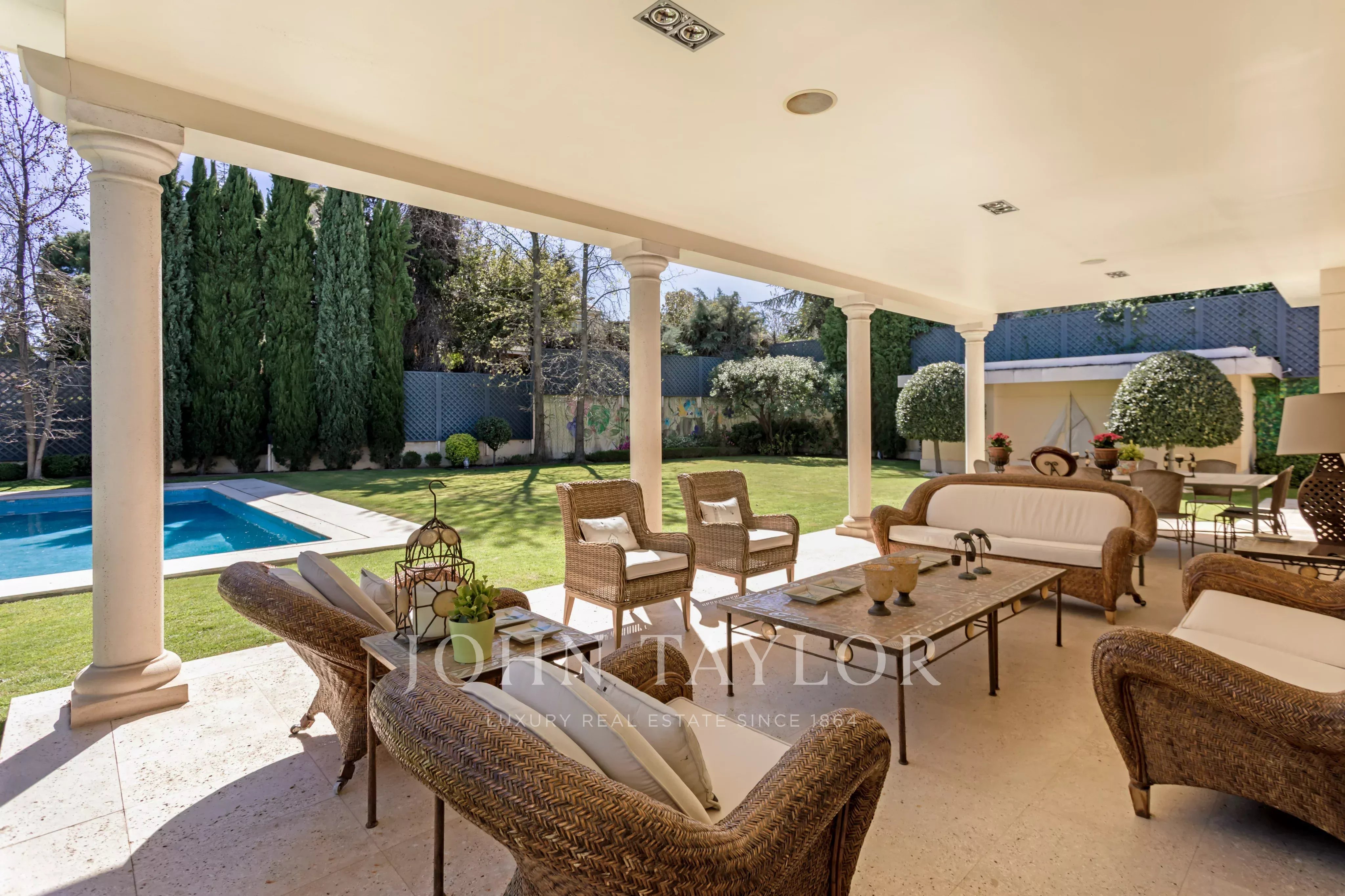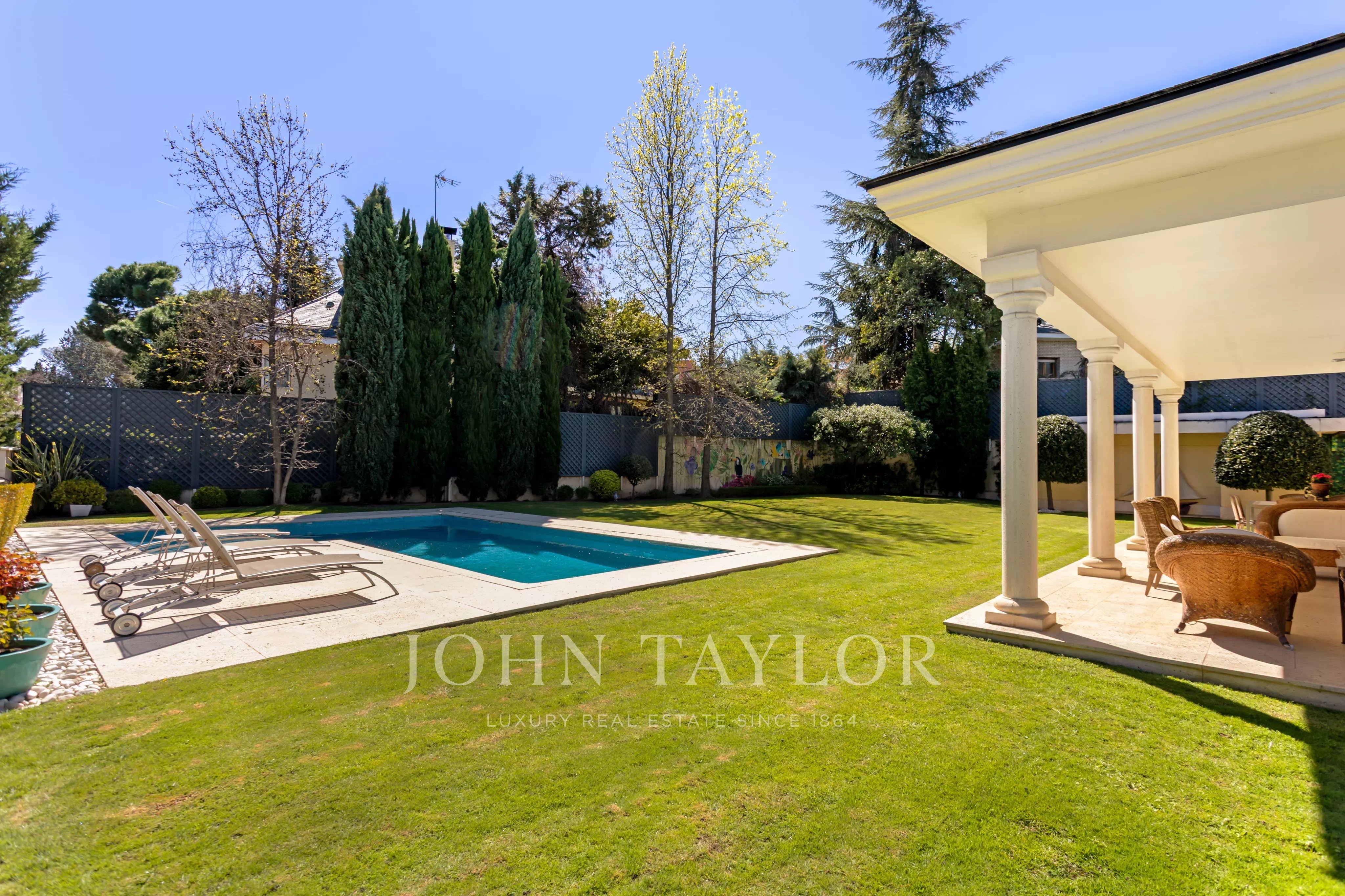 Das absolute Highlight ist der große, private Swimmingpool, der von einer grünen Oase mit prächtigem Rasen umgeben ist. Verbringen Sie unvergessliche Momente mit Familie und Freunden im exklusiven Außenbereich dieser Traumimmobilie. Die Top-Lage im begehrten Viertel Conde Orgaz-Piovera garantiert Ihnen Privatsphäre und hervorragende Lebensqualität in Madrid.