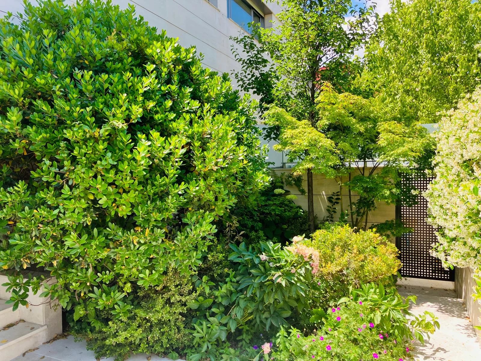 Im ersten Stock befindet sich eine schöne Gartenterrasse mit Blick auf einen Park und die Skyline von Madrid. Ein Wohnzimmer mit großen Fenstern und ein Büro.