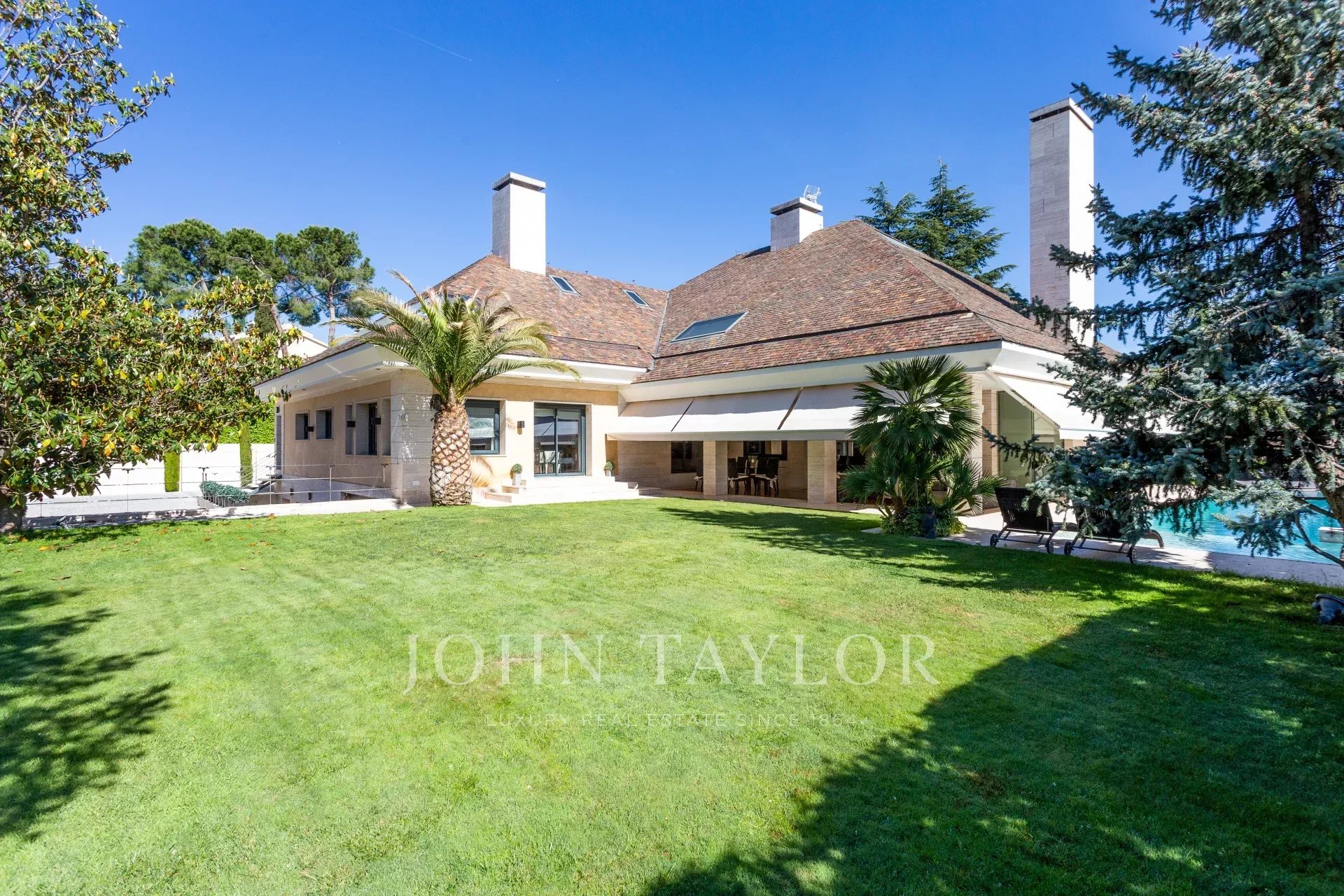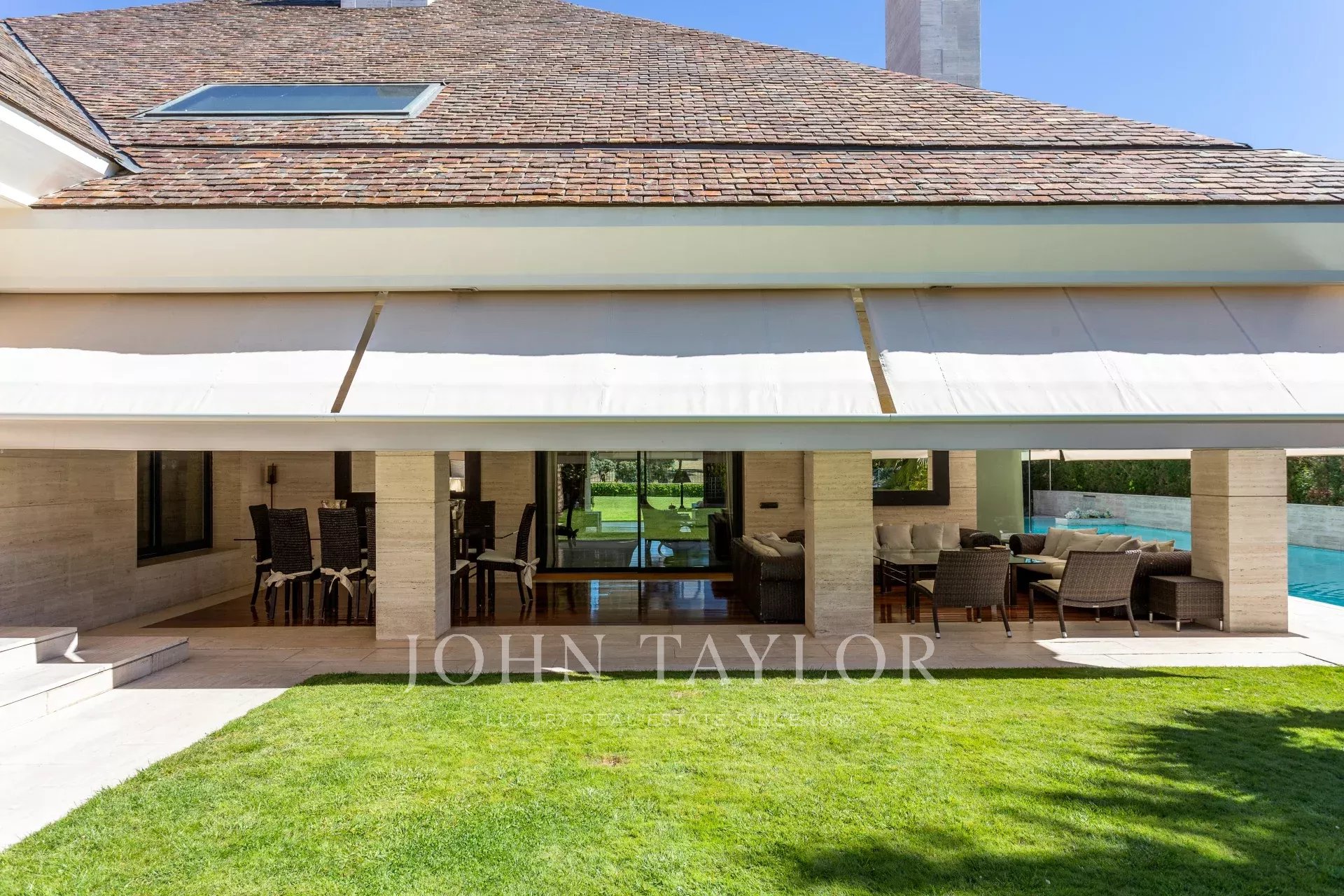 Draußen, Schwimmbad neben der Veranda und Lounges, Tennisplatz und Garage für 4 Autos.