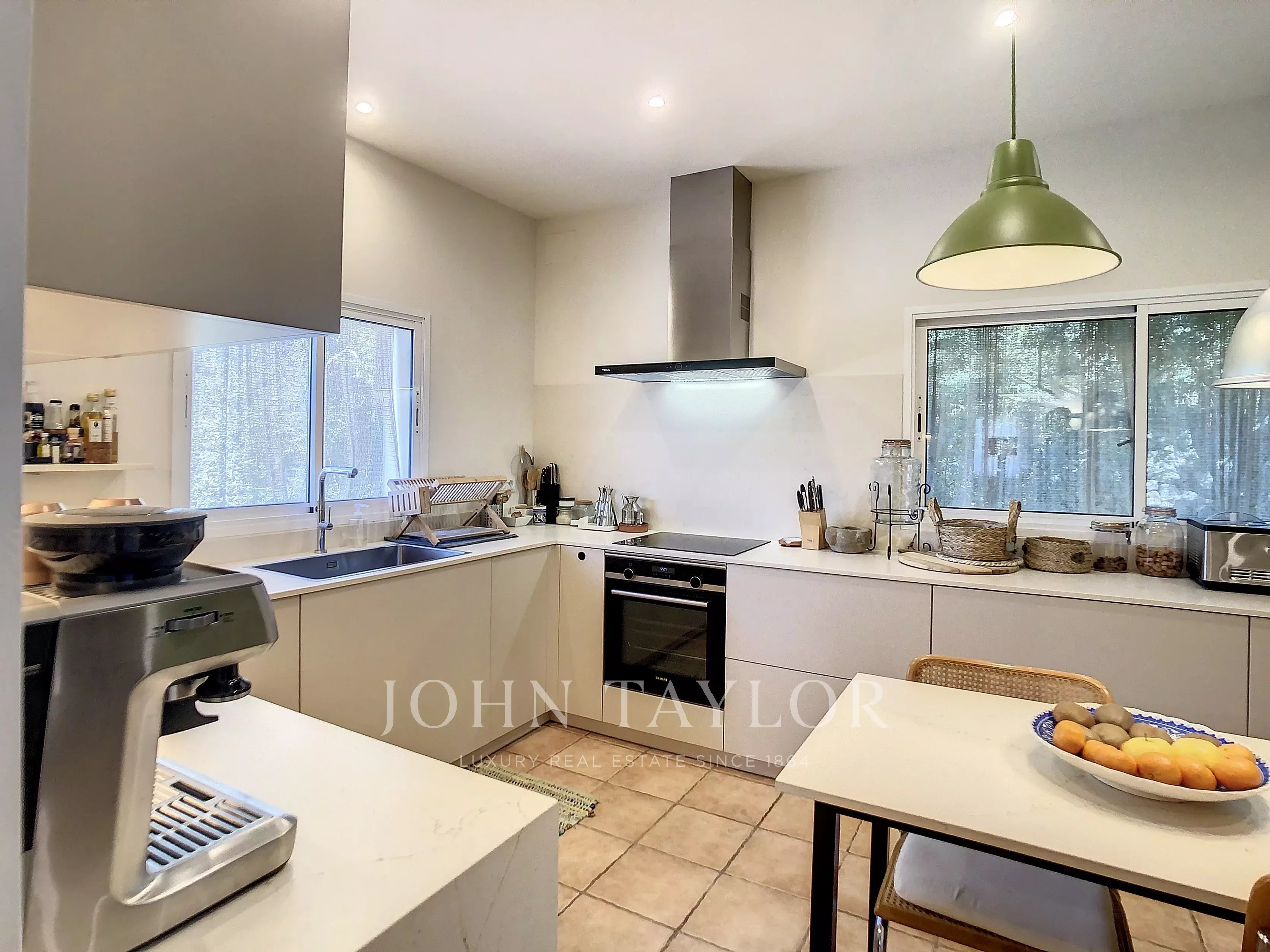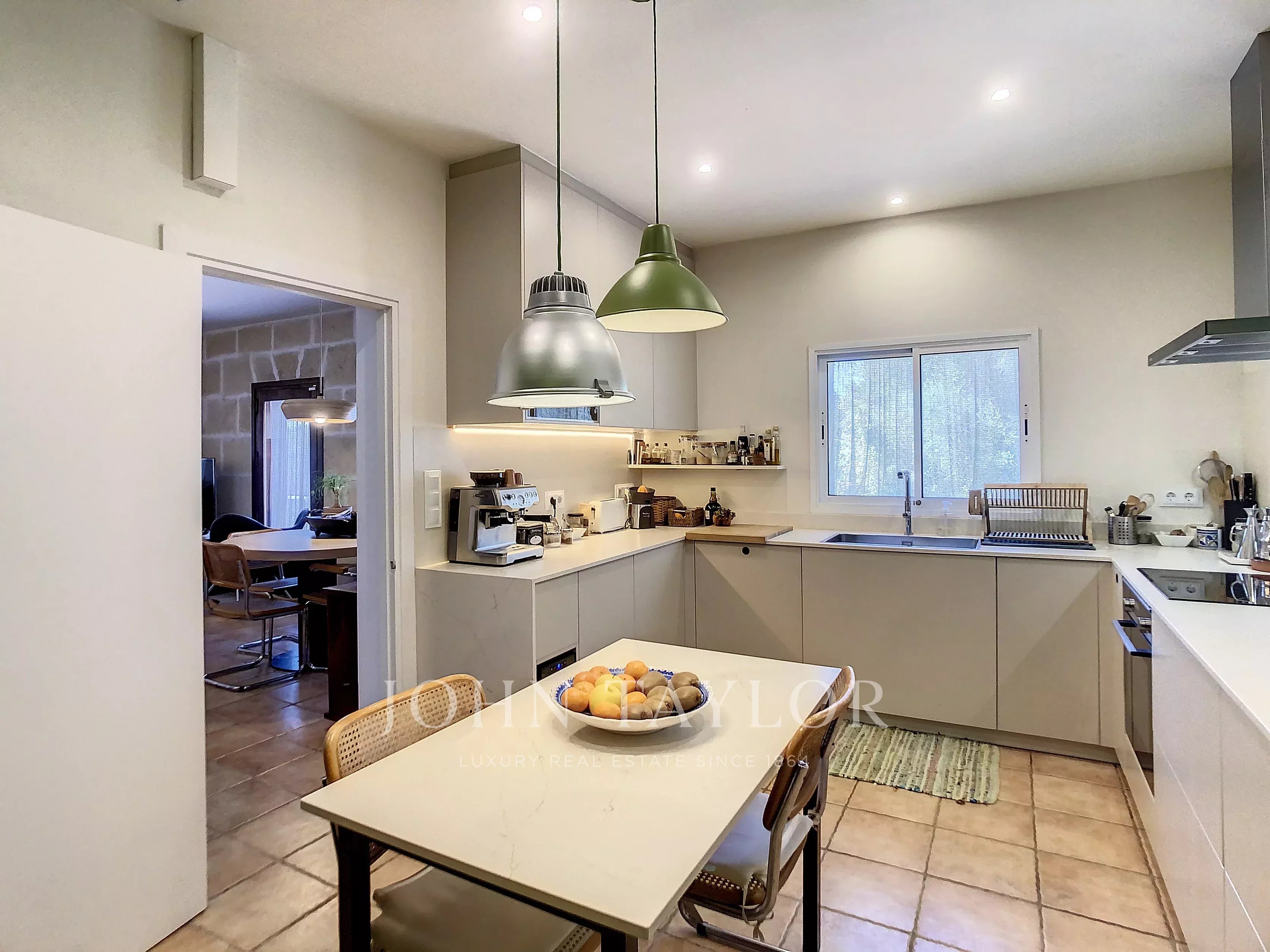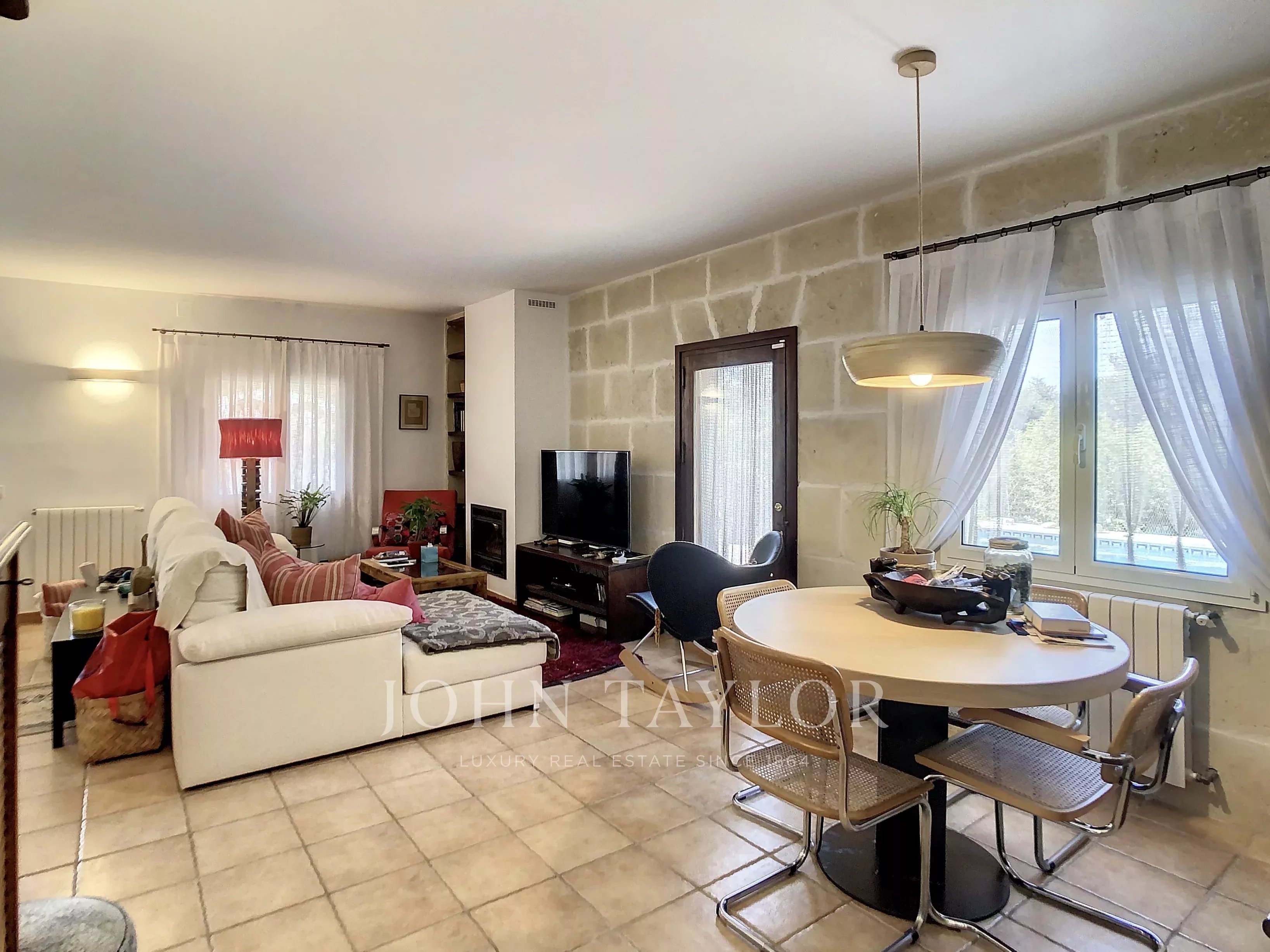 Haupthaus, kürzlich renoviert: geräumiges und helles Wohn-Esszimmer mit Zugang zu einer gemütlichen Veranda und einem Salzwasser-Swimmingpool, ideal zum Entspannen das ganze Jahr über. Kamin mit Lüftungsschächten. Moderne und funktionelle renovierte Küche.