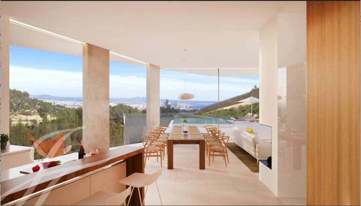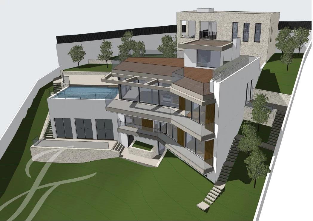 Dieses Angebot umfasst ein Grundstück und ein Projekt mit einer Lizenz für eine luxuriöse Villa mit Meerblick auf einem Grundstück von 2225m2 mit einer bebauten Gesamtfläche von 630m² auf drei Etagen. Es beinhaltet nicht den Bau der Villa. Die erste Etage besteht aus einem sehr geräumigen, lichtdurchfluteten Wohn-/Essbereich, einer offenen Küche, einem Schlafzimmer mit en-suite Badezimmer, einem Ankleidezimmer, einer Gästetoilette und einem Abstellraum. Der Außenbereich bietet vier Terrassen mit unterschiedlichen Ausrichtungen. Eine Etage tiefer bietet das Projekt insgesamt drei Schlafzimmer mit drei Bädern en-suite, einen Bürobereich mit einem vierten Bad, eine Waschküche und eine mögliche Sauna. Sie haben Zugang zu zwei Terrassen und einem zusätzlichen Patio. In der untersten Etage gibt es einen großen Raum für ein Fitnesscenter und einen Wellnessbereich, ein Badezimmer, eine separate Toilette und den Technikraum. Sowohl vom Pool als auch von den verschiedenen Terrassen aus haben Sie einen fantastischen Blick auf Palma und das Meer.