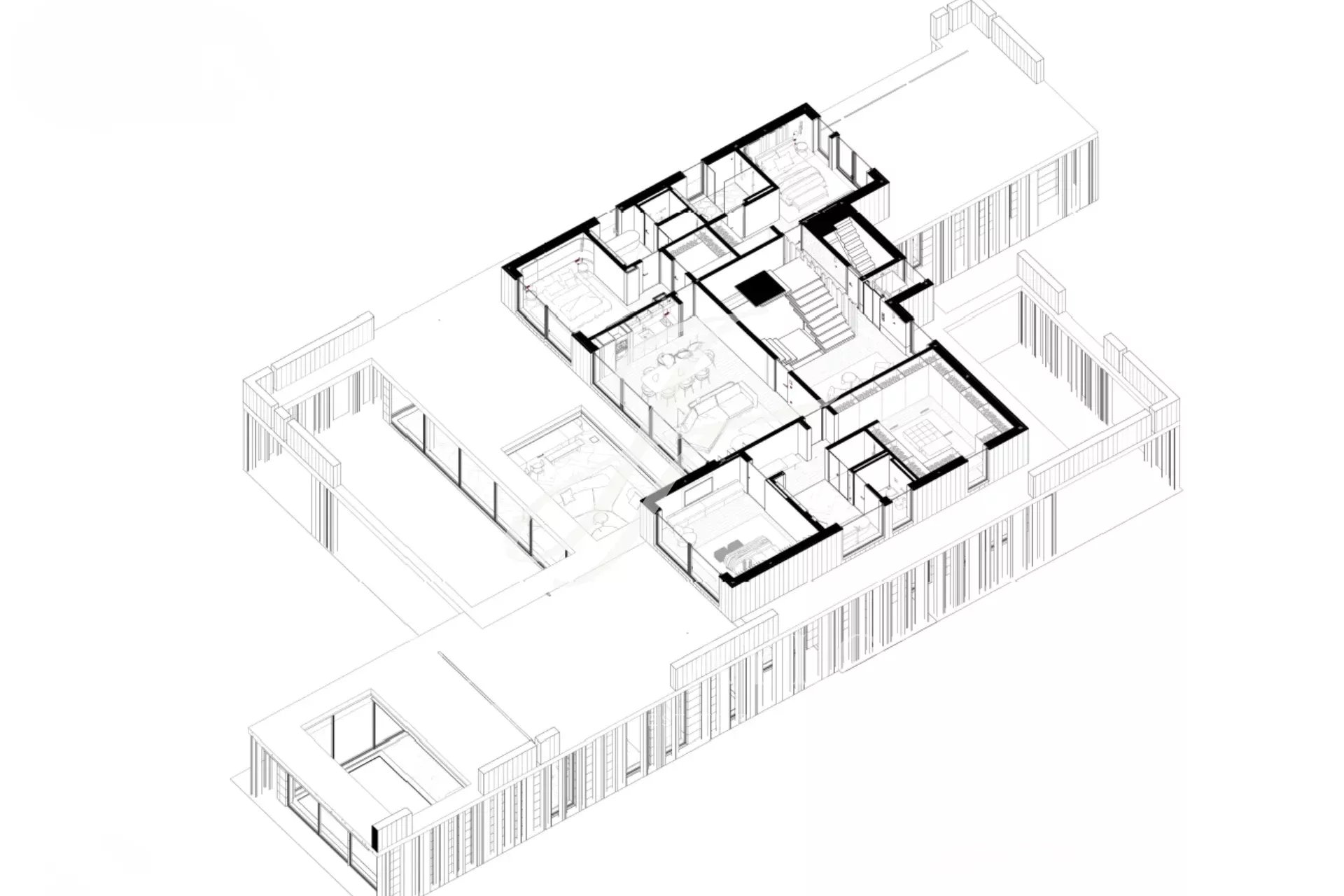 Das Haus erstreckt sich über drei Etagen mit großen, offen gestalteten Gemeinschaftsbereichen und fünf Schlafzimmern mit eigenem Bad und wurde so konzipiert, dass die Aussicht und die Verbindung zum Außenbereich maximiert werden. Große, raumhohe Fenster rahmen Madrid und El Pardo ein, als wären sie lebende Kunstwerke, die jeden Raum in einen privaten Aussichtspunkt verwandeln.